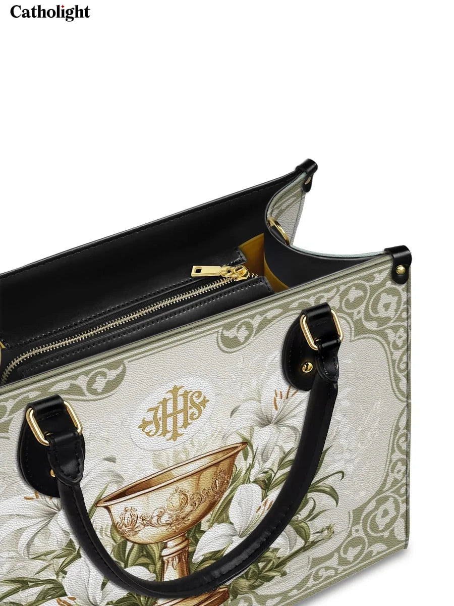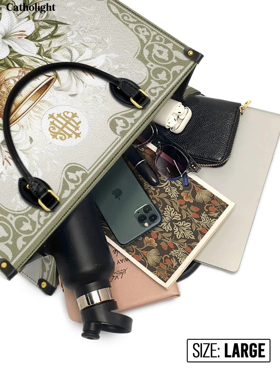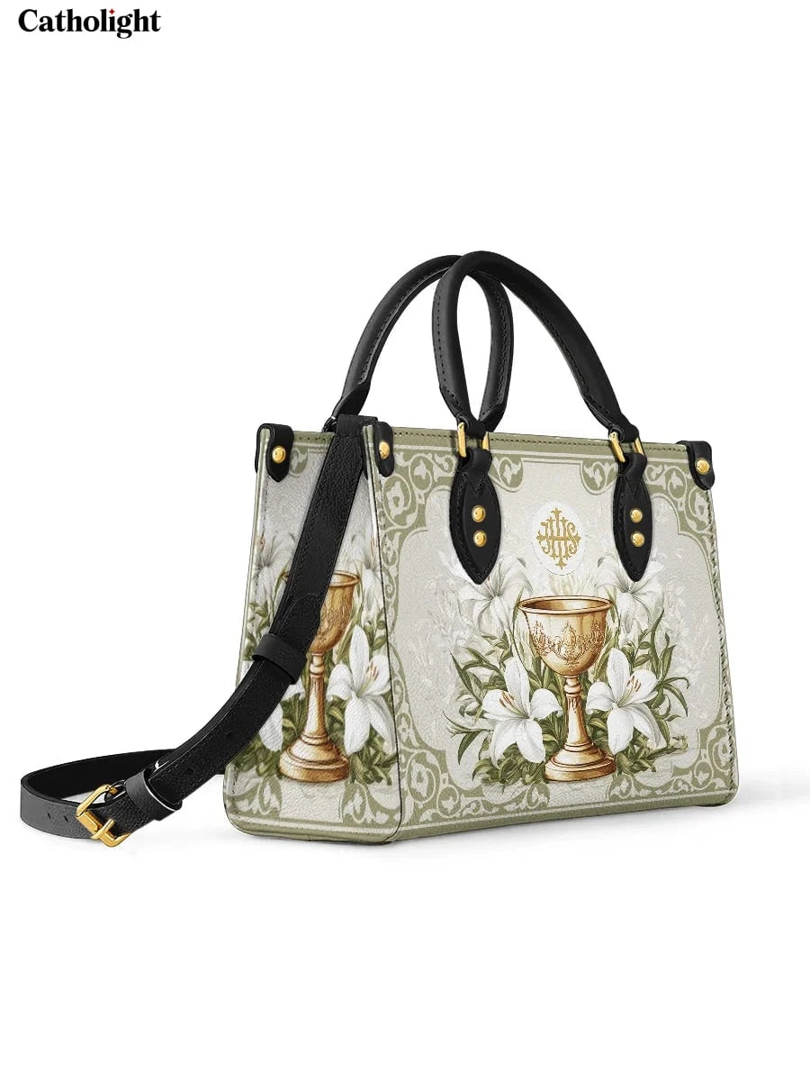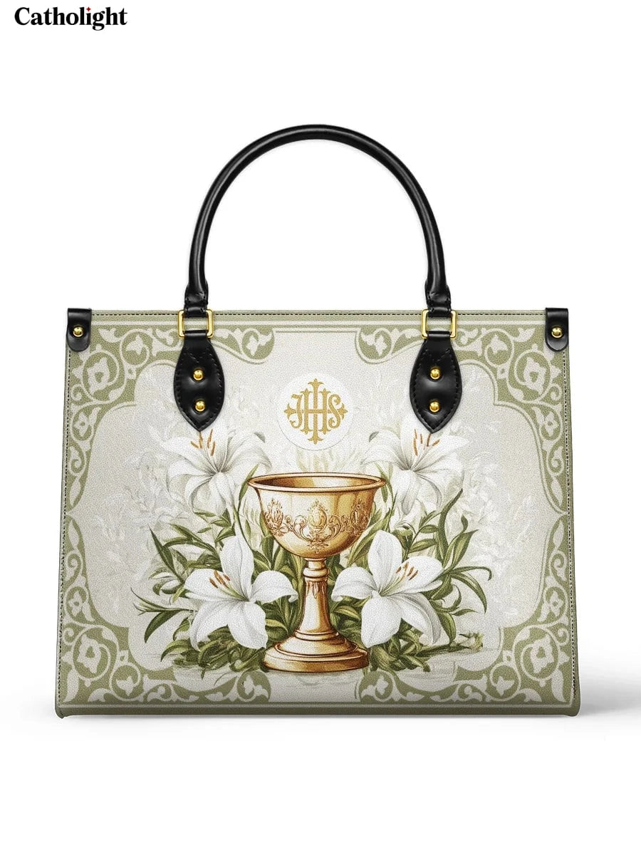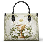 Questa borsa in pelle dal design elegante celebra il sacro mistero dell'Eucaristia, presentando un calice dorato centrale decorato con dettagli intricati che simboleggiano la Santa Comunione. Il calice è circondato da radi gigli bianchi, che rappresentano purezza, grazia e presenza divina, il tutto su uno sfondo sereno ed elegante di toni morbidi di avorio e verde con delicati motivi ornamentali.