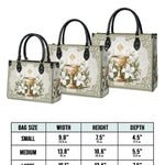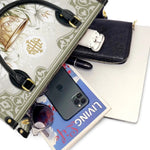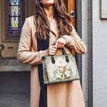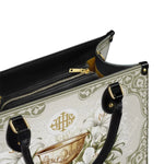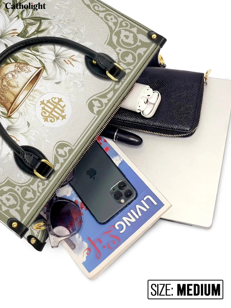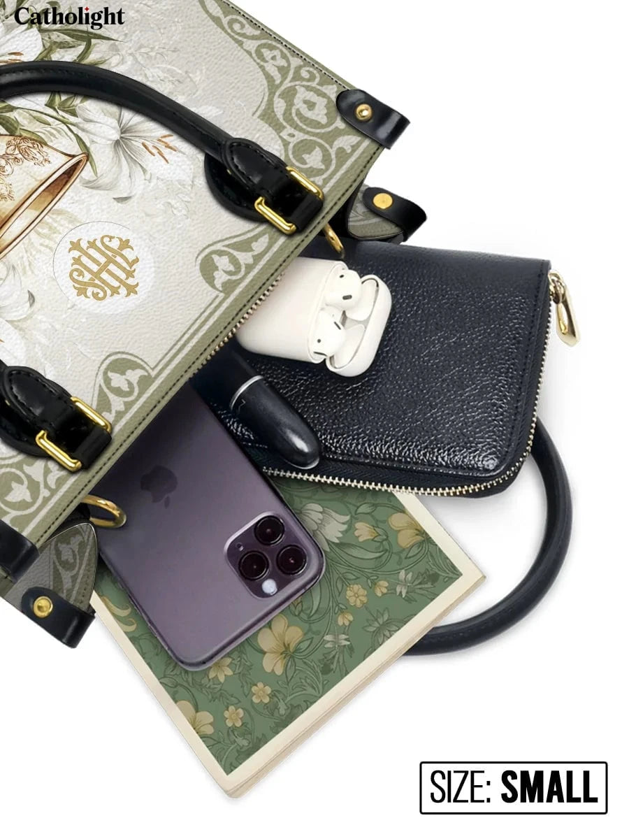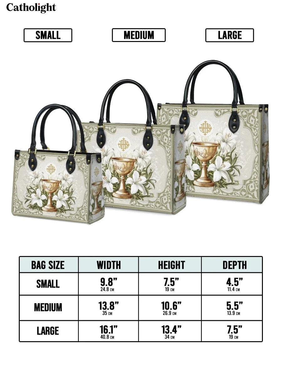 Questa borsa in pelle dal design elegante celebra il sacro mistero dell'Eucaristia, presentando un calice dorato centrale decorato con dettagli intricati che simboleggiano la Santa Comunione. Il calice è circondato da radi gigli bianchi, che rappresentano purezza, grazia e presenza divina, il tutto su uno sfondo sereno ed elegante di toni morbidi di avorio e verde con delicati motivi ornamentali.