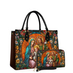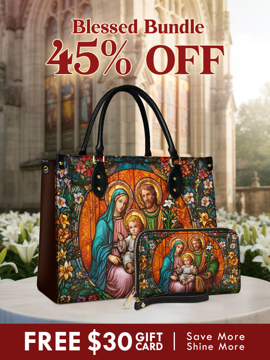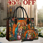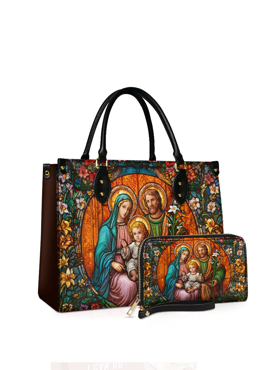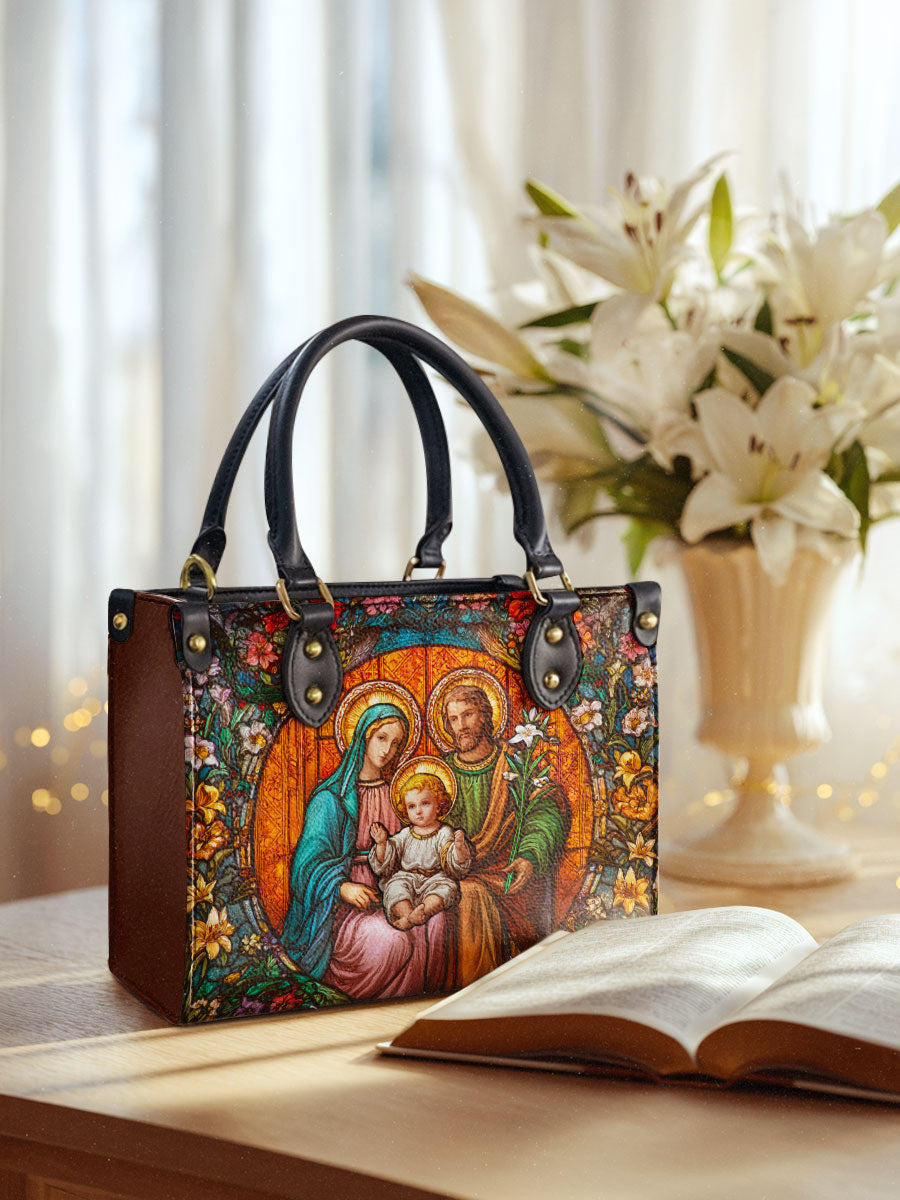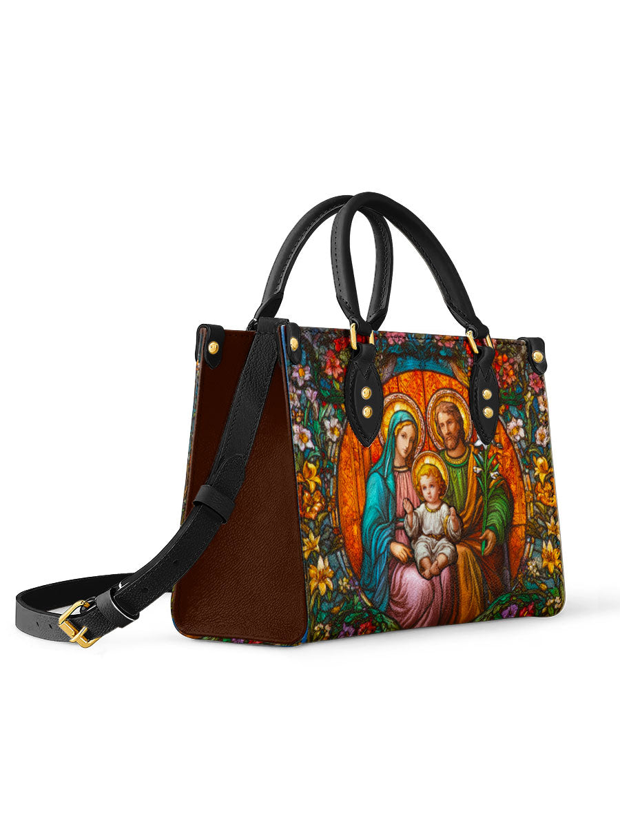 This exquisite handbag features the Holy Family — Mary, Joseph, and the Child Jesus — portrayed in radiant stained glass artistry. Surrounded by blooming lilies and roses, the design symbolizes purity, love, and the strength of family rooted in faith.