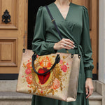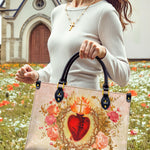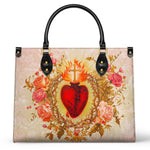 Questa elegante borsa in pelle presenta una straordinaria raffigurazione del Sacro Cuore di Gesù, circondato da vivaci rose e incorniciato da intricati dettagli dorati. Il Sacro Cuore, incoronato da fiamme e una croce, simboleggia l'amore divino di Cristo, il sacrificio e la compassione per l'umanità. Le morbide tonalità pastello dello sfondo e i fiori vivaci creano un design armonioso, evocando un senso di pace, fede e connessione spirituale. Questa borsa in pelle è una bella rappresentazione di devozione e amore per Cristo.