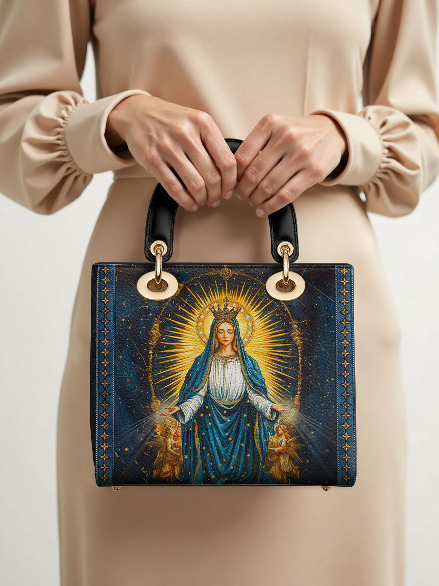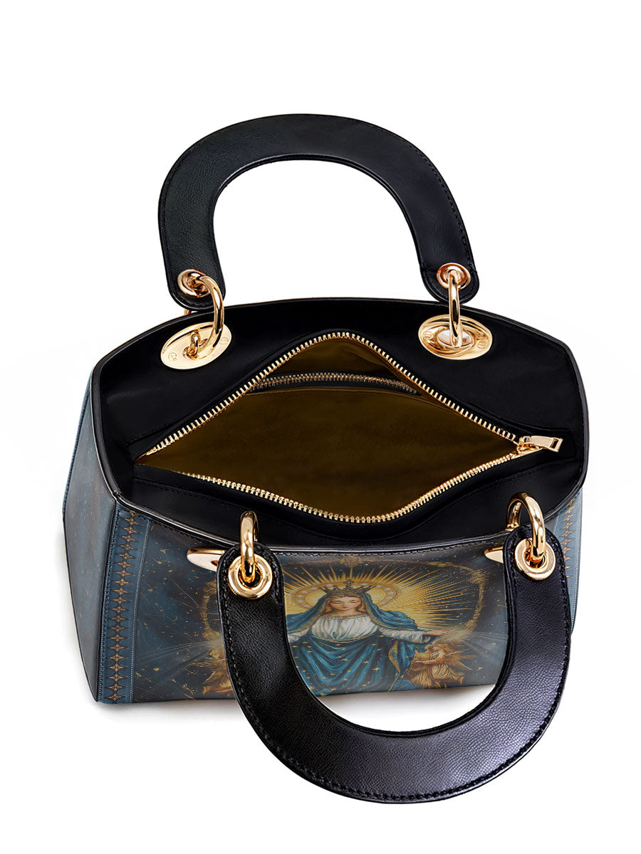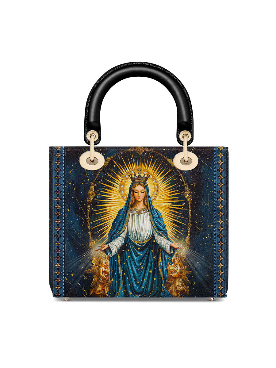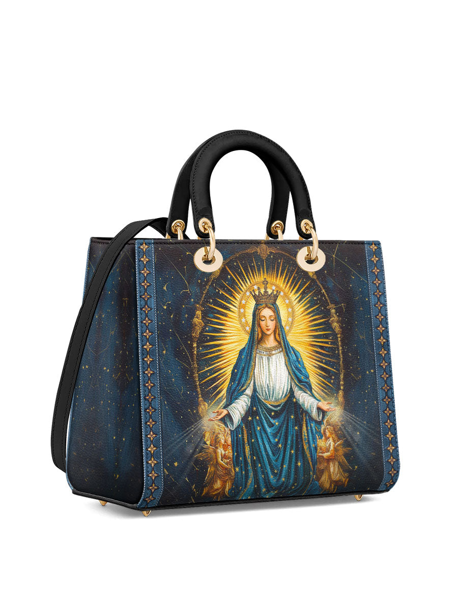 This exquisite leather bag features a radiant depiction of the Blessed Virgin Mary, standing in celestial majesty as the Queen of Heaven and Earth. Illuminated by a golden aura that radiates against a deep midnight-blue backdrop, Mary appears with open arms and a tender gaze—welcoming, comforting, and full of grace. Her flowing sapphire mantle, symbolic of purity and divine protection, drapes elegantly around her, while two angels at her feet lift her presence in reverence and awe.