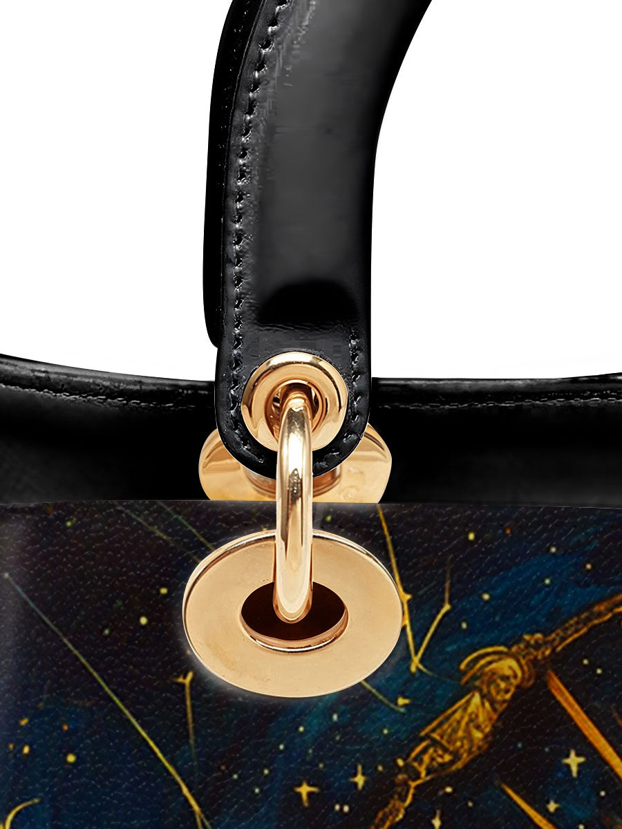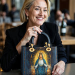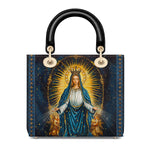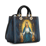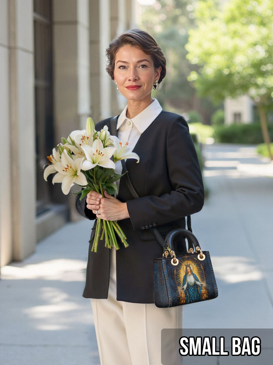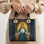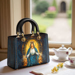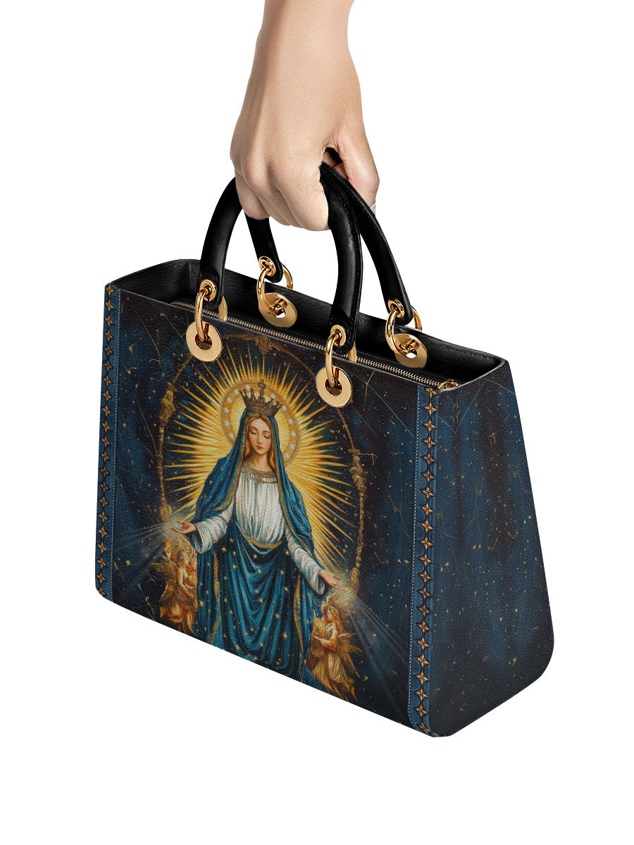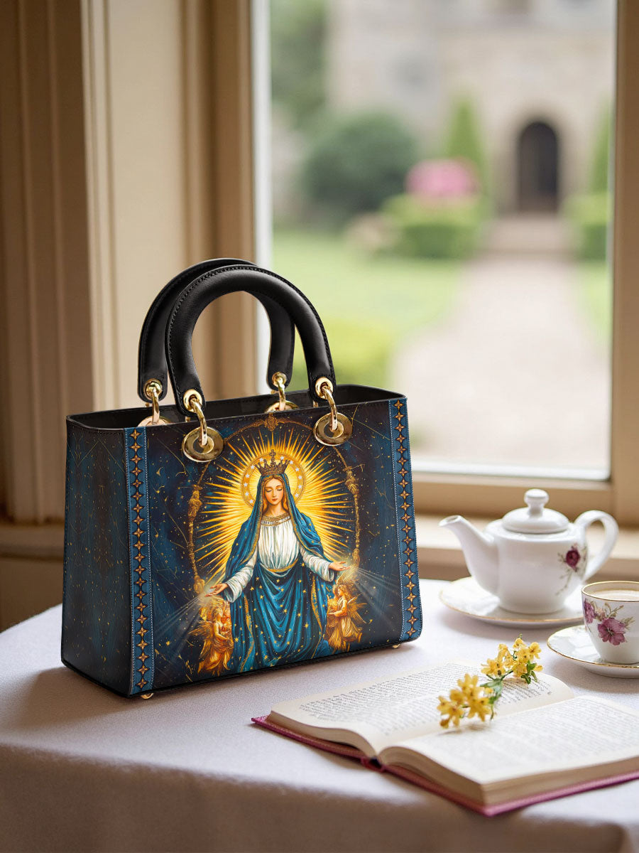 This exquisite leather bag features a radiant depiction of the Blessed Virgin Mary, standing in celestial majesty as the Queen of Heaven and Earth. Illuminated by a golden aura that radiates against a deep midnight-blue backdrop, Mary appears with open arms and a tender gaze—welcoming, comforting, and full of grace. Her flowing sapphire mantle, symbolic of purity and divine protection, drapes elegantly around her, while two angels at her feet lift her presence in reverence and awe.