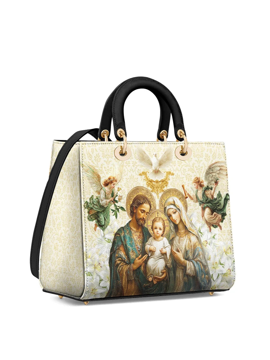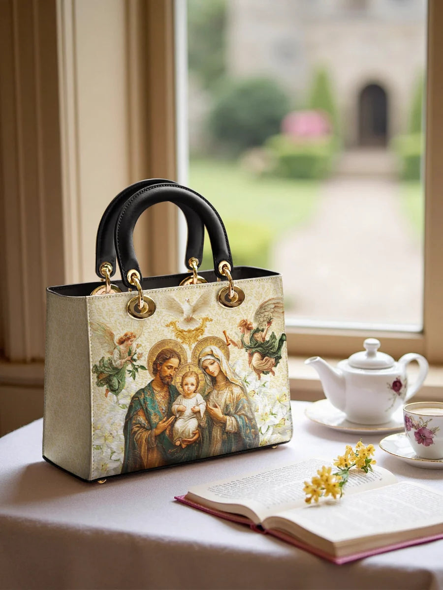 Carrying this bag brings a sense of spiritual connection and grace, a daily expression of faith and devotion. The intricate details of the art, from the heavenly doves to the tender embrace of the family, create a visual masterpiece that resonates deeply with the heart.