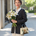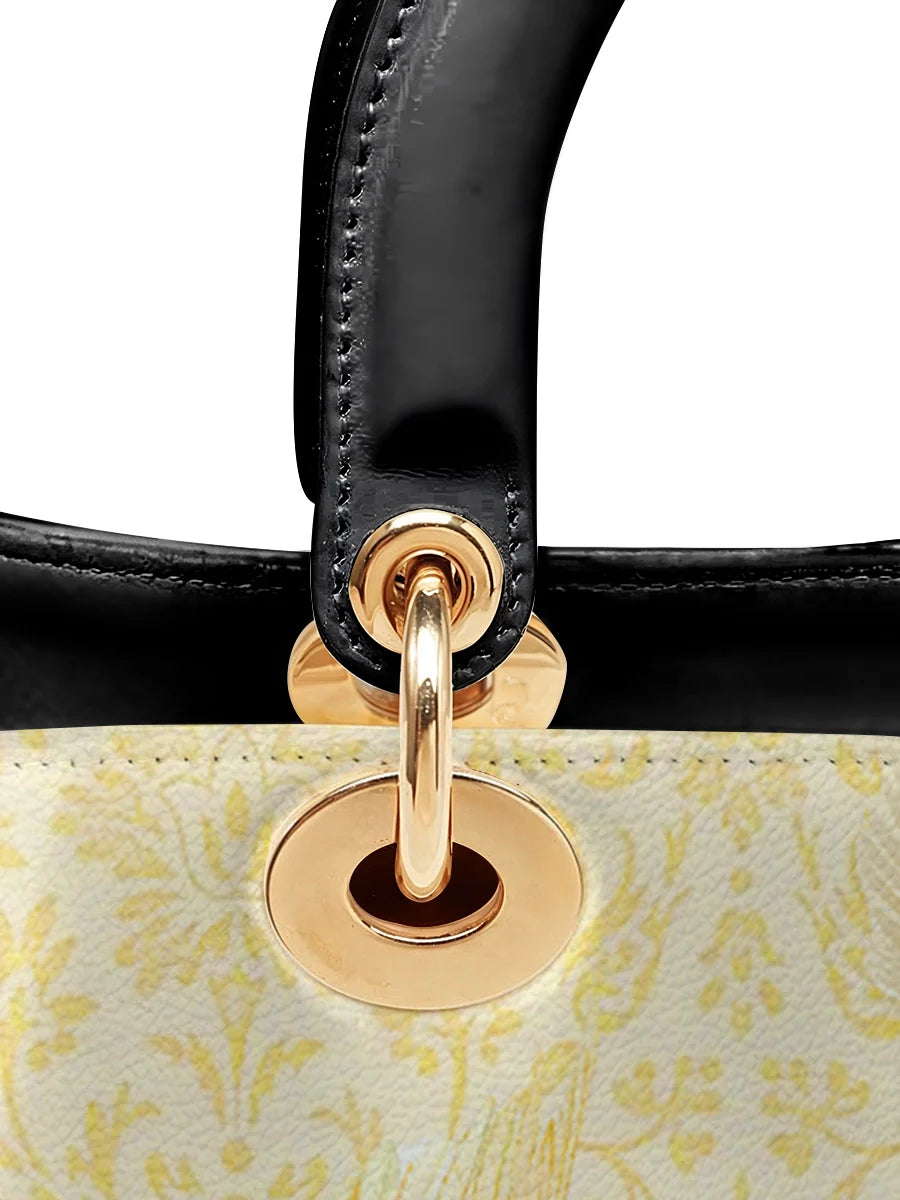This exquisite leather bag features a beautiful rendering of the Holy Family—Jesus, Mary, and Joseph—surrounded by angels and delicate lilies. The rich symbolism and peaceful colors evoke a sense of divine love, protection, and unity. The radiant, ethereal atmosphere of the artwork invites feelings of serenity and hope, making it a perfect reminder of the Holy Family’s sacred bond.