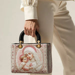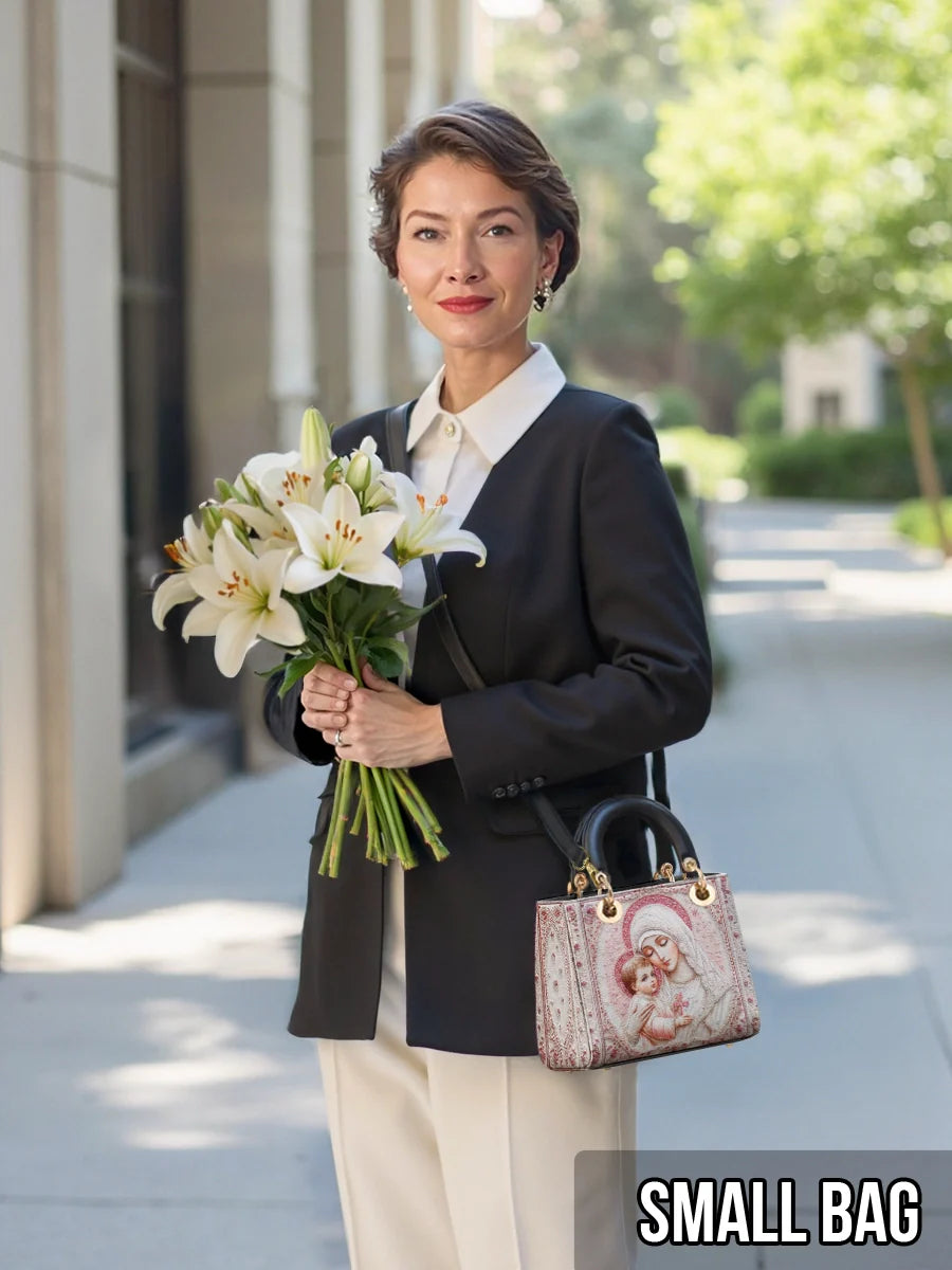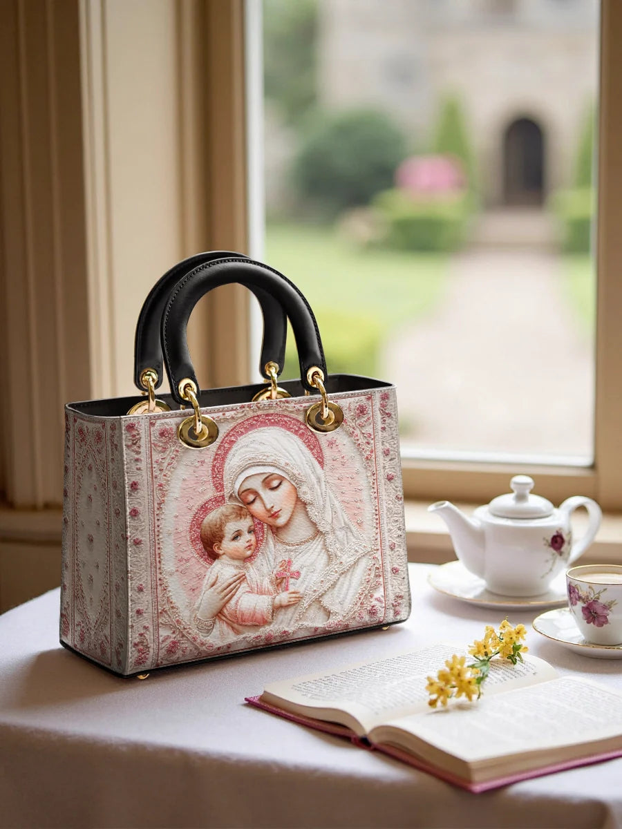 Sacred Serenity: The Madonna’s Tender Embrace Leather Bag is a masterpiece of faith and elegance, featuring an exquisite depiction of the Virgin Mary cradling Baby Jesus in a moment of divine love and devotion. Wrapped in soft hues of ivory and blush pink, this design radiates serenity, warmth, and grace. Intricate details and ornate textures enhance the ethereal beauty, making this bag a perfect blend of spirituality and timeless luxury.