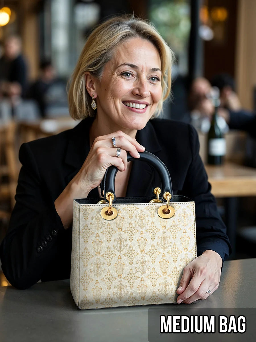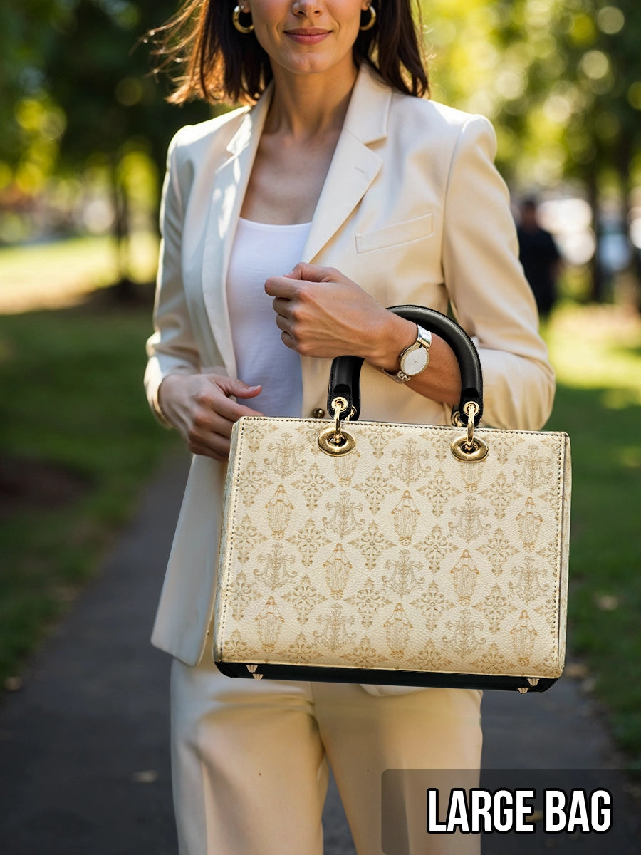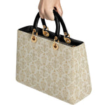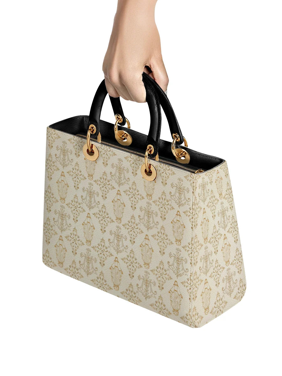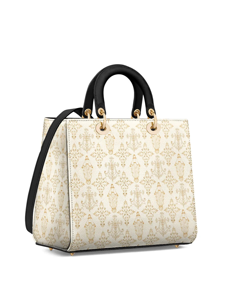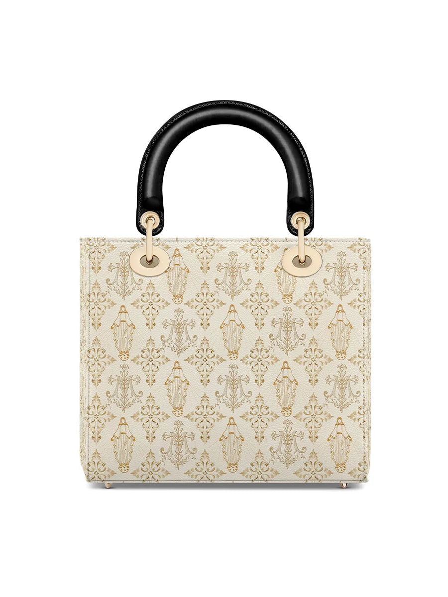 The leather bag is a stunning celebration of faith and devotion, featuring an intricate repeating design of the Blessed Virgin Mary intertwined with elegant floral and ornamental details. The soft, golden accents on the neutral background create a timeless and sophisticated look, symbolizing purity, grace, and divine serenity.