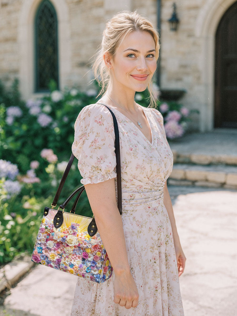 Questa vivace borsa in pelle presenta una straordinaria croce realizzata interamente con fiori colorati in fiore, simboleggiando la bellezza della resurrezione, del rinnovamento e dell'amore divino. Una luce dorata e radiosa emana da dietro la croce, evidenziando il suo significato sacro e creando un senso di speranza e elevazione spirituale. Le tonalità pastello di fiori rosa, blu, giallo e bianco riflettono gioia, grazia e fede, rendendo questo design una celebrazione della vita e della fede.