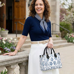 Intrecciati con i motivi floreali ci sono eleganti colombe e colibrì, che incarnano la pace e lo spirito di connessione divina. La raffinata palette monocromatica di blu profondo su uno sfondo bianco immacolato esalta la sofisticatezza della borsa e aggiunge un tocco di eleganza classica.