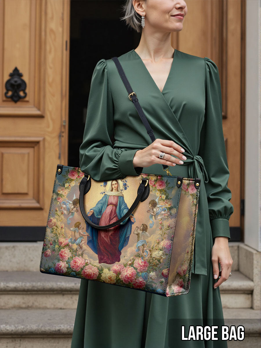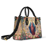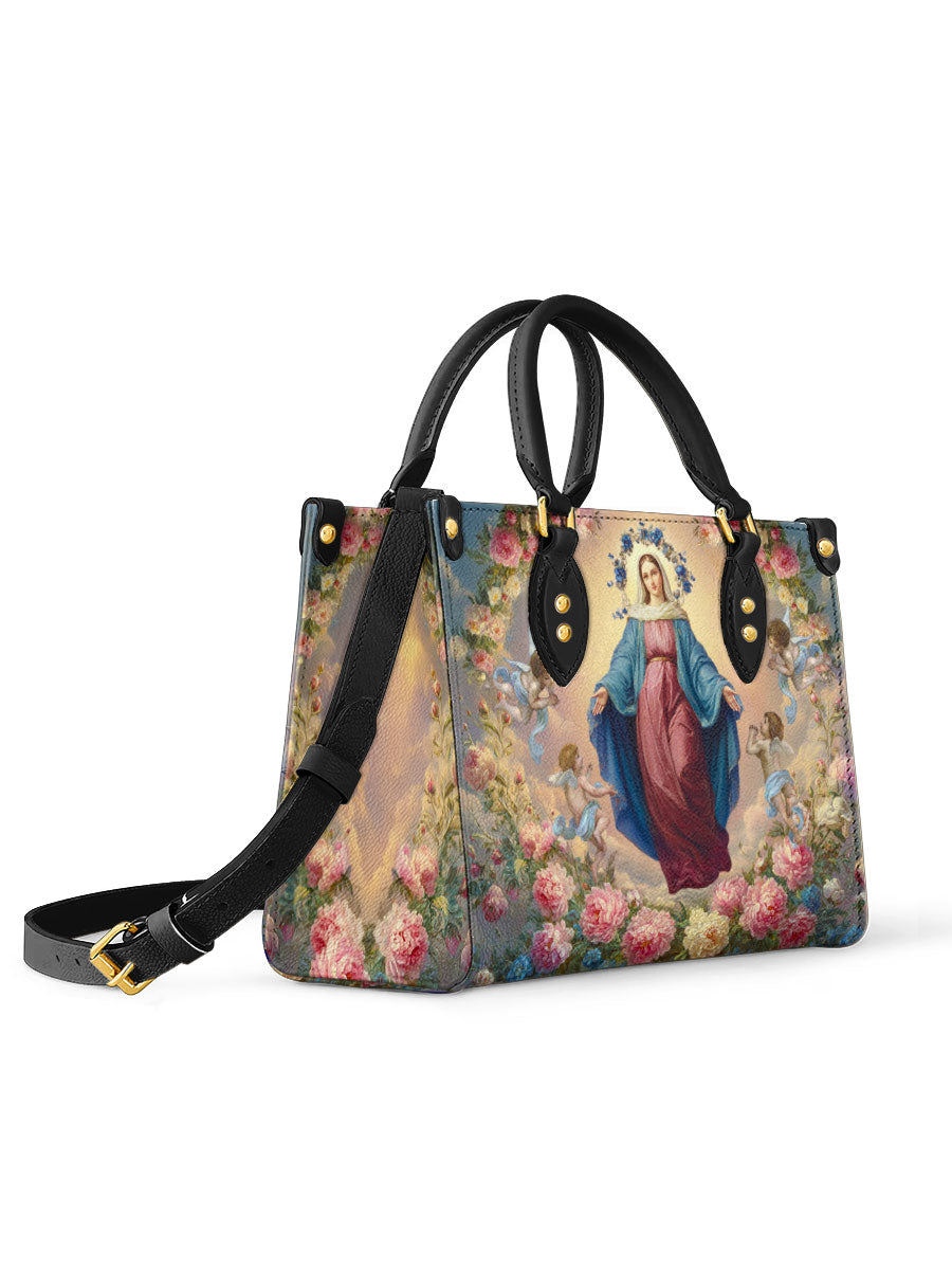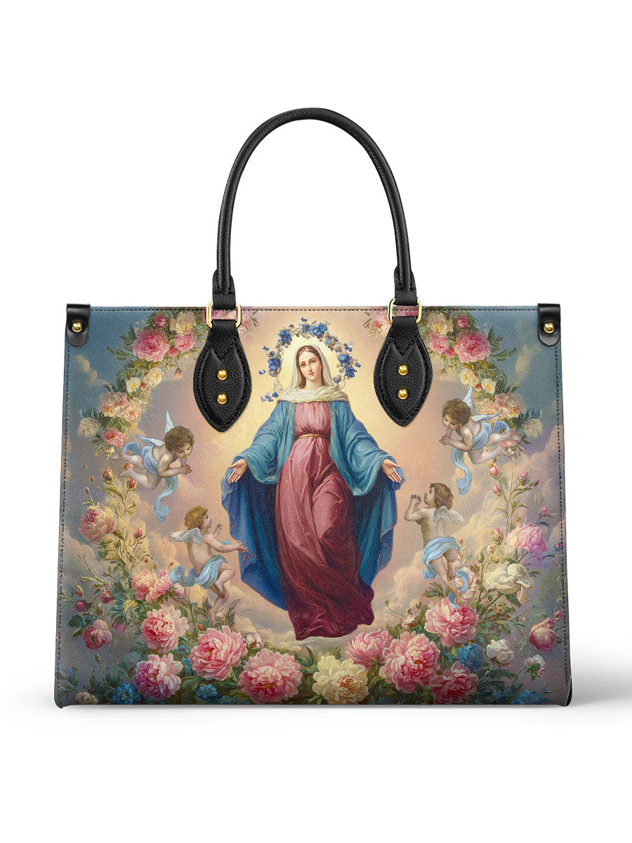 Framed by blooming peonies and soft golden skies, the artwork evokes both reverence and beauty, making it more than just a handbag—it’s a declaration of faith. Whether carried to church, prayer group, or everyday errands, this piece invites you to walk with Mary and carry her presence wherever you go.
