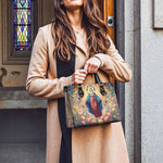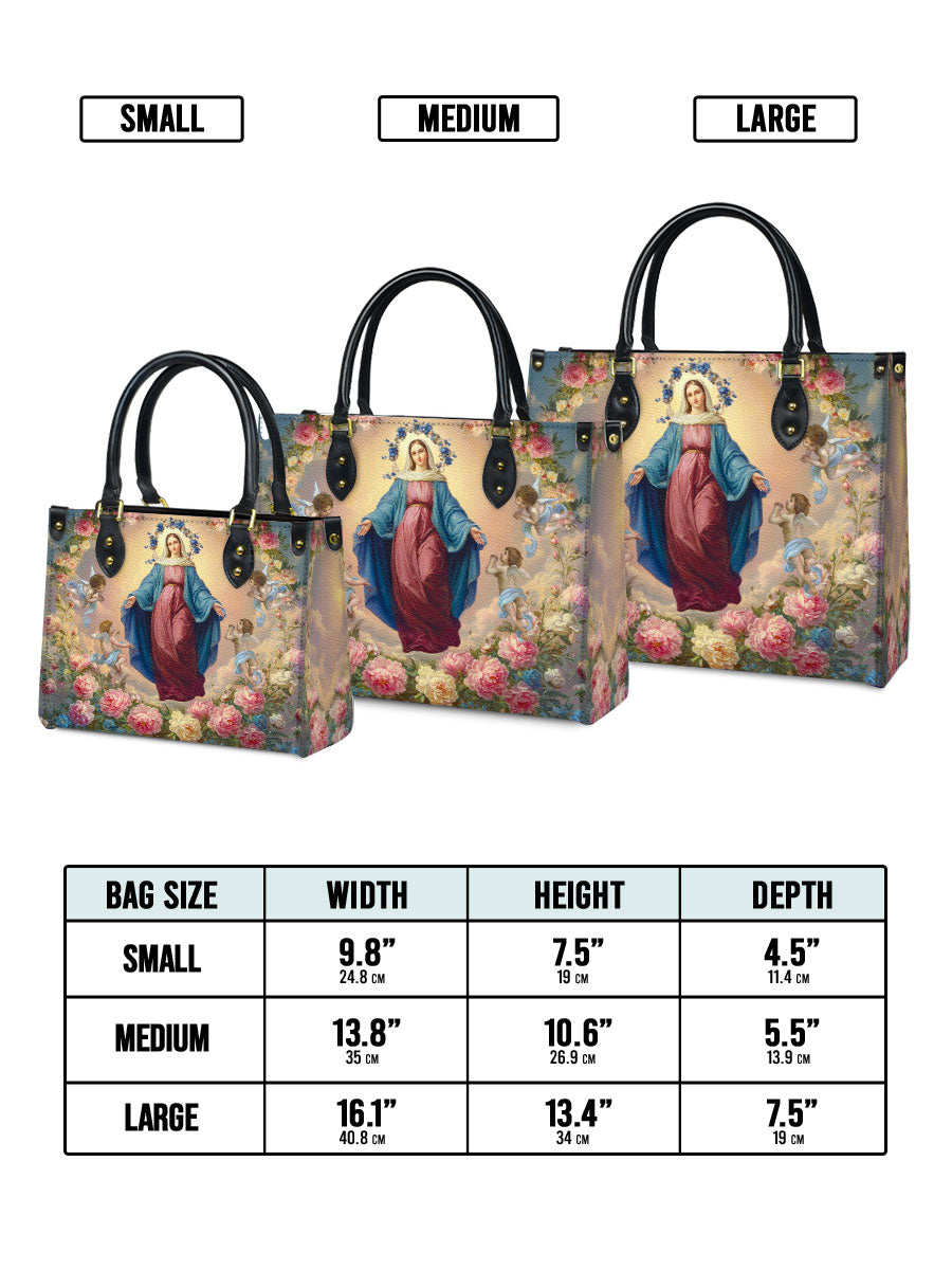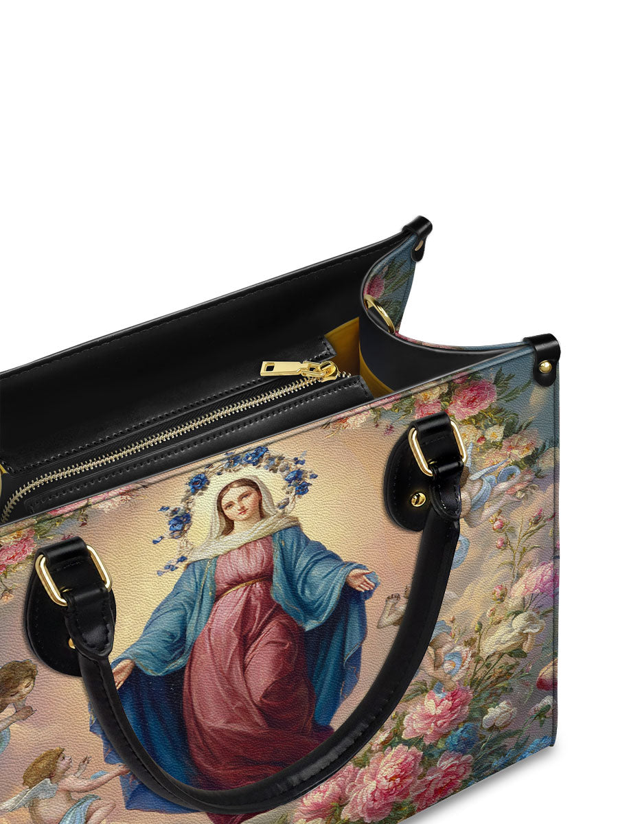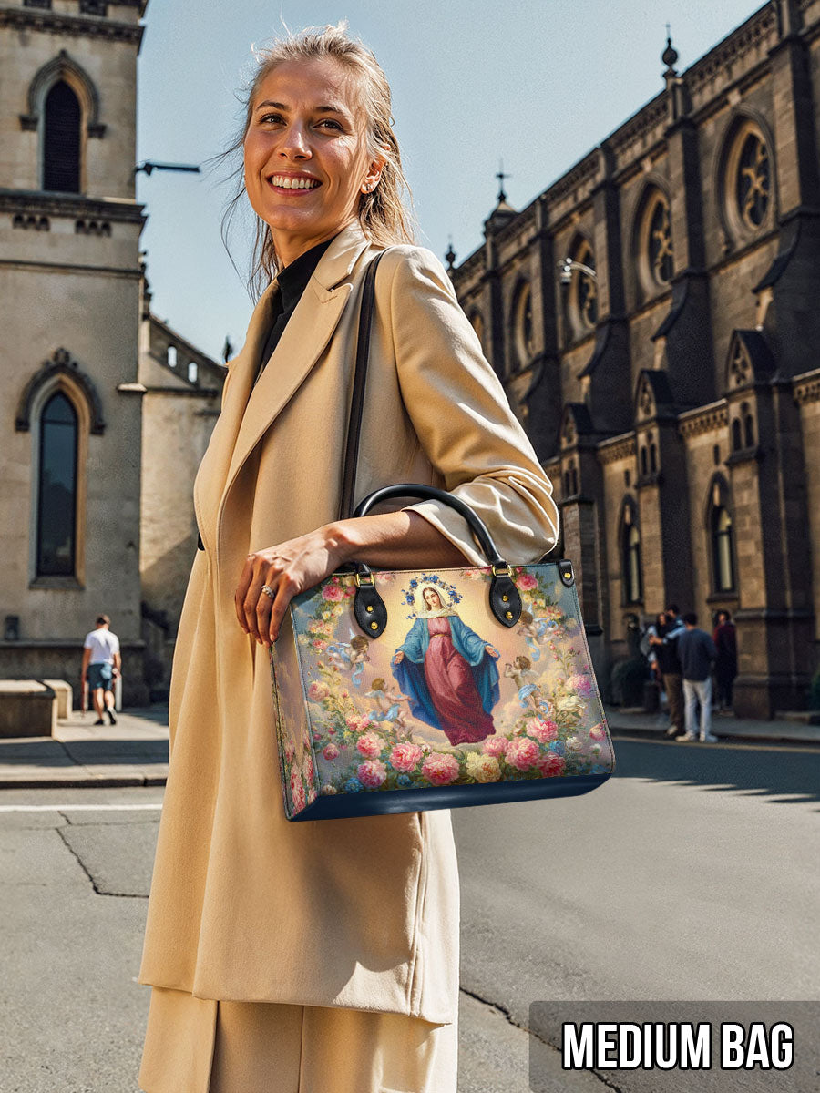 Framed by blooming peonies and soft golden skies, the artwork evokes both reverence and beauty, making it more than just a handbag—it’s a declaration of faith. Whether carried to church, prayer group, or everyday errands, this piece invites you to walk with Mary and carry her presence wherever you go.