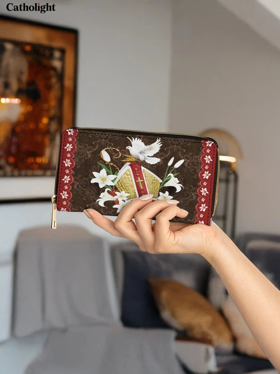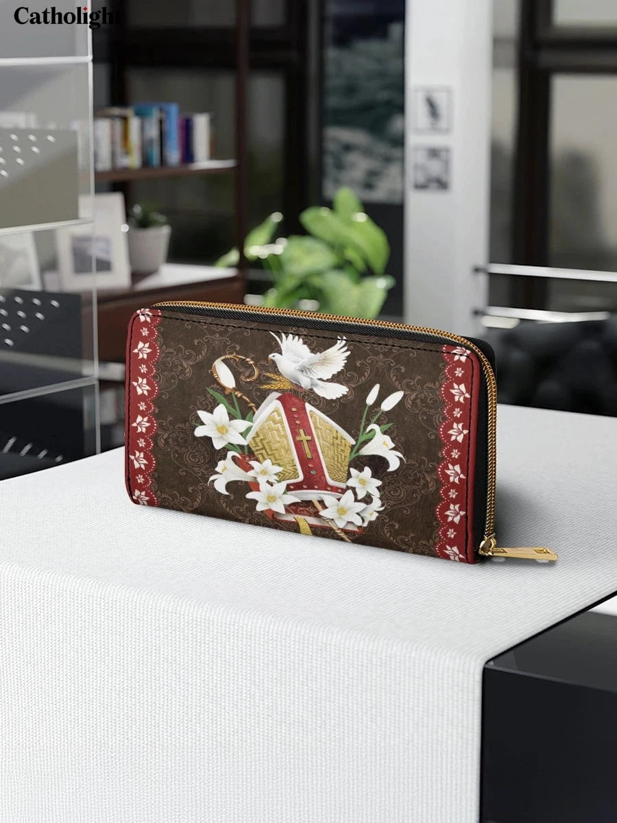 Questo portafoglio dal design elegante presenta una rappresentazione simbolica di fede, purezza e autorità spirituale. Al centro si trova un mitra vescovile adornato con dettagli dorati intricati e una croce, che rappresenta la leadership e la devozione all'interno della Chiesa. Attorno al mitra ci sono eleganti gigli bianchi, simbolo di purezza e rinnovamento, mentre una colomba, l'incarnazione dello Spirito Santo, riposa graziosamente sopra, emanando pace e guida divina.
