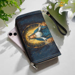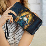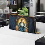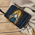 Questo portafoglio splendidamente progettato presenta la Beata Vergine Maria che irradia luce divina, i suoi fluttuanti abiti blu e bianchi rappresentano purezza e pace. Circondata da un'aura dorata e luminosa, Maria si erge come Regina del Cielo, con due figure angeliche in adorazione ai suoi piedi. Lo sfondo blu notte adornato con dettagli dorati evoca la maestà del cielo e l'amore sconfinato che Maria offre come intercessore e guida.
