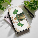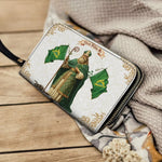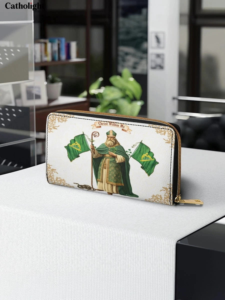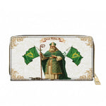 Questo straordinario portafoglio celebra l'eredità di San Patrizio, il caro santo patrono d'Irlanda, con un design che irradia fede, coraggio e patrimonio. Al centro si erge San Patrizio, vestito con splendidi abiti verdi adornati con intricati dettagli dorati, simboleggiando il suo ruolo di leader spirituale. Nelle sue mani, tiene un pastorale e un trifoglio, rappresentando la Trinità e i suoi insegnamenti di fede.