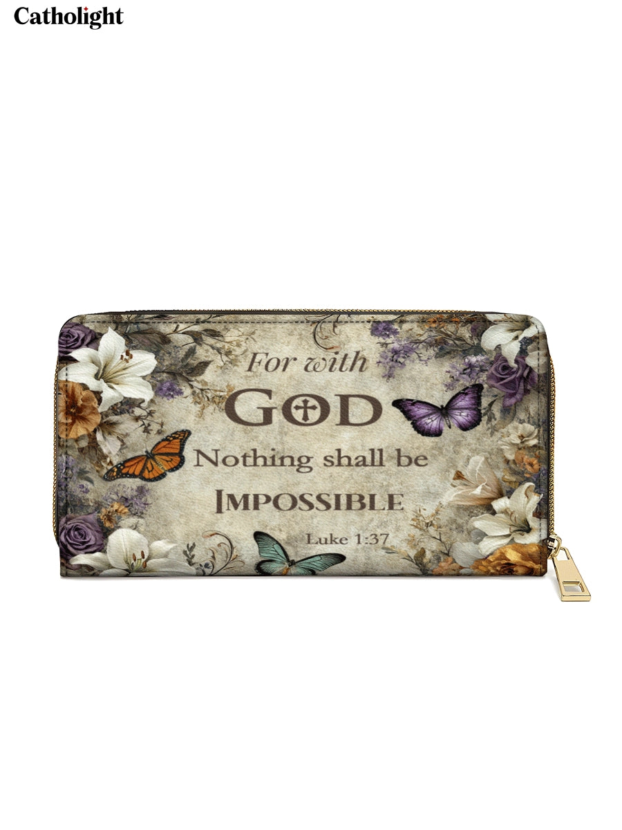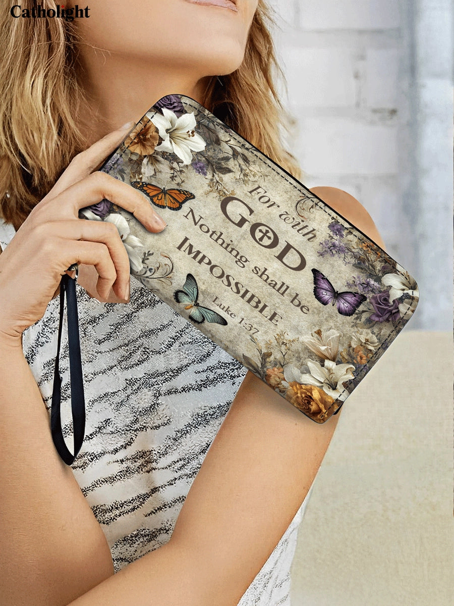 Radiando fede e ispirazione, Portafoglio in Pelle Faithful Blossom combina splendidamente il fascino della natura con un messaggio di divina certezza. I delicati motivi floreali e le farfalle che svolazzano su uno sfondo beige testurizzato incorniciano il potente versetto, "Perché con Dio nulla sarà impossibile" (Luca 1:37), ricordandoci le possibilità illimitate attraverso la fede.