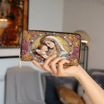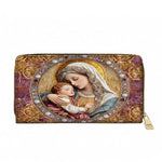 Lo sfondo ricco di viola e oro esalta il design intricato, evocando un senso di regalità e significato spirituale. Questo portafoglio è più di un accessorio funzionale: è un pezzo d'arte significativo che celebra il sacro legame tra madre e figlio.