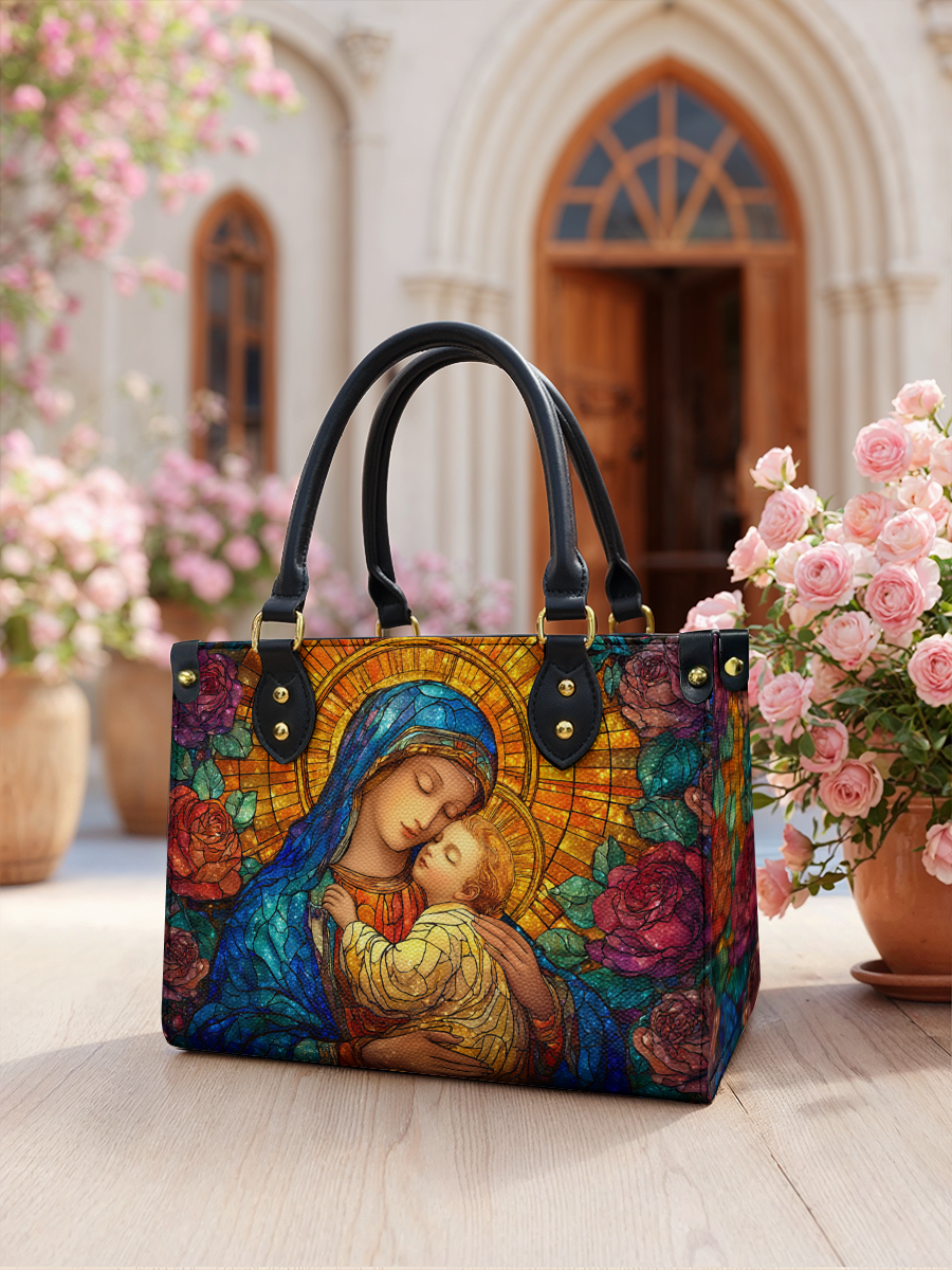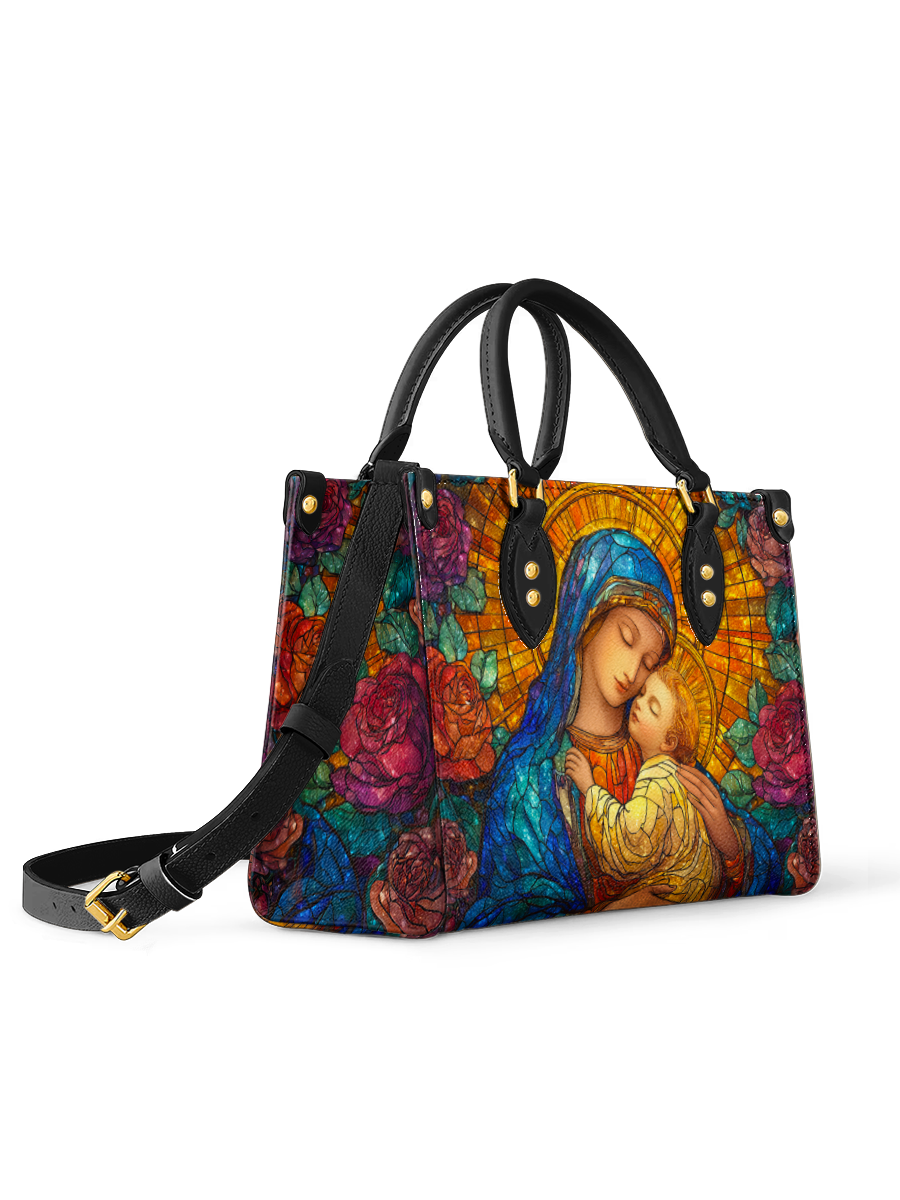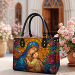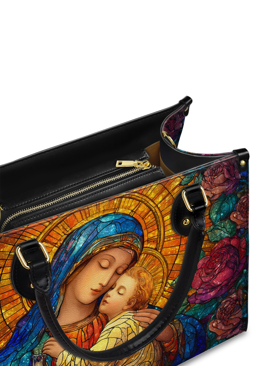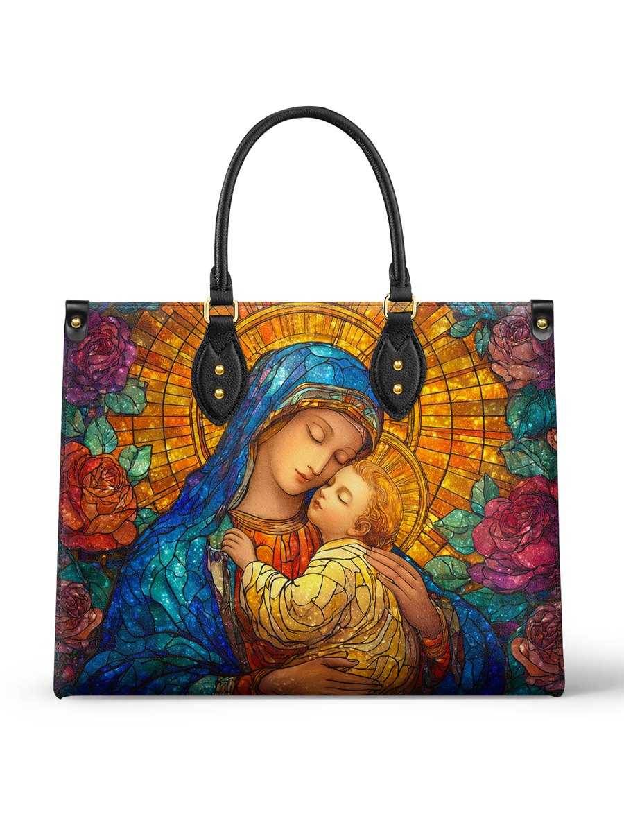 The Radiant Madonna Leather Bag tenderly portrays the Blessed Virgin cradling the Infant Jesus, surrounded by radiant golden light and blooming roses. The stained glass artistry captures both maternal warmth and heavenly grace, inspiring devotion and peace with every glance.