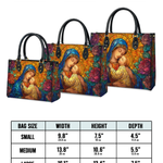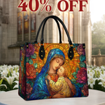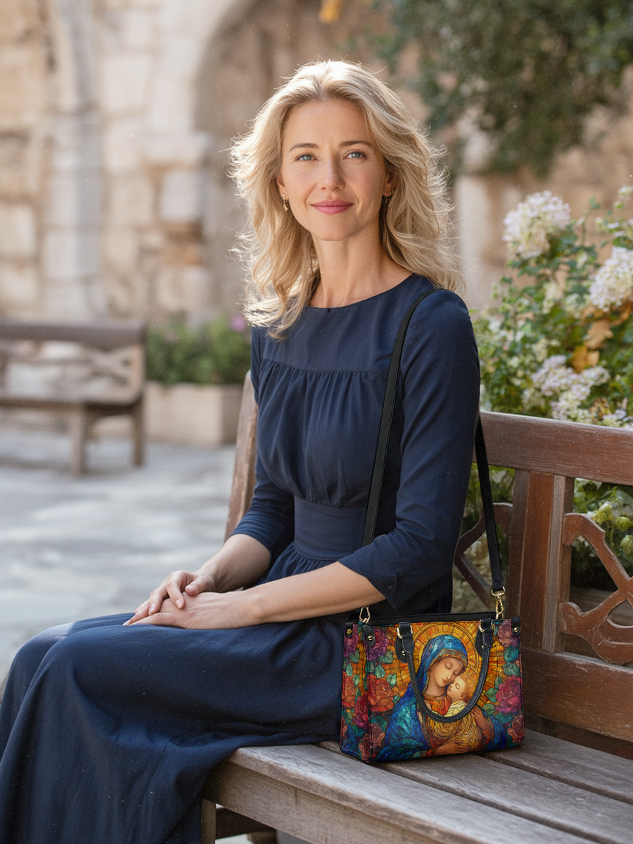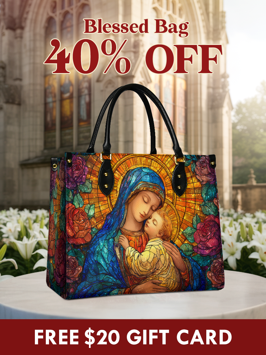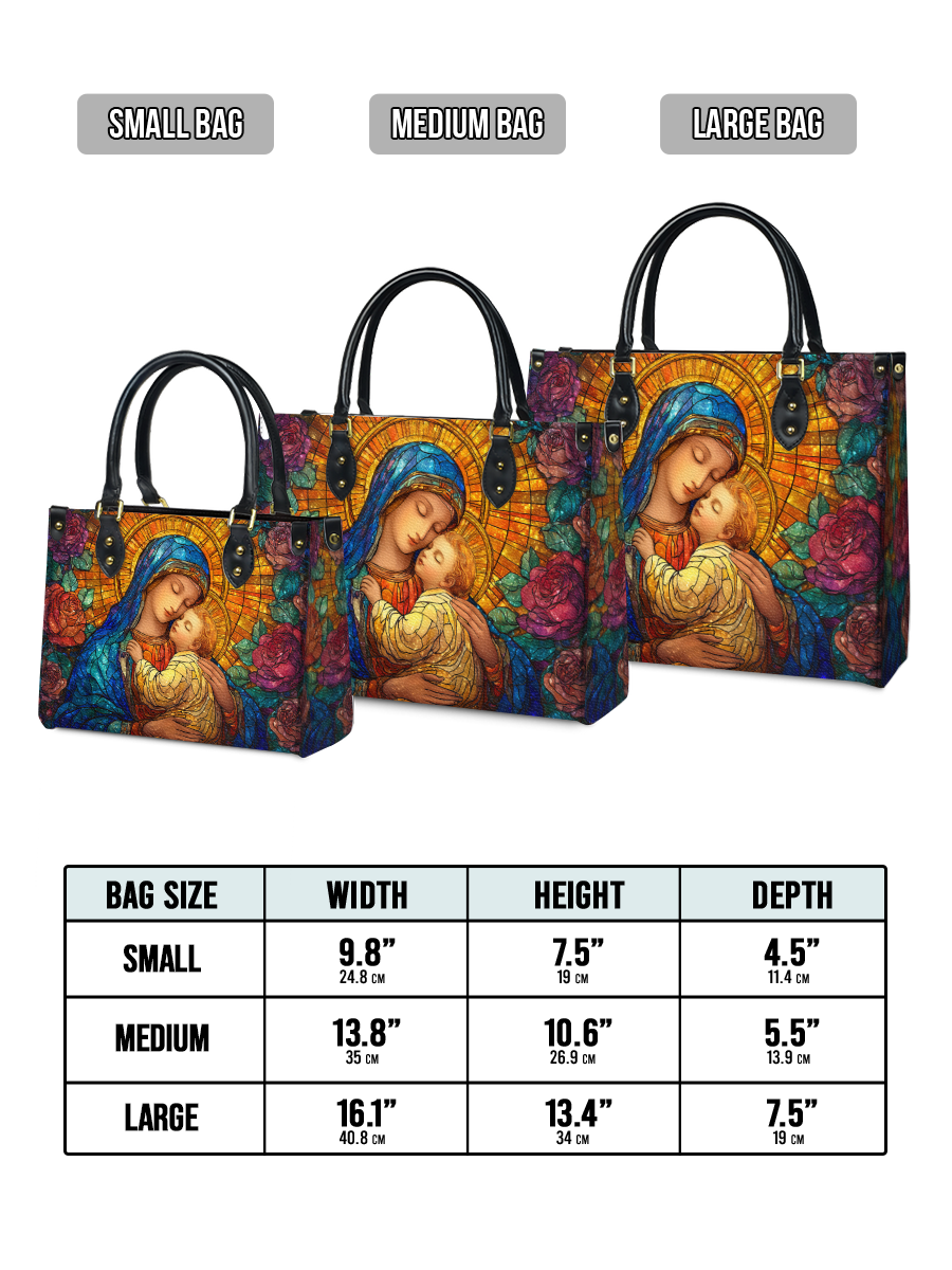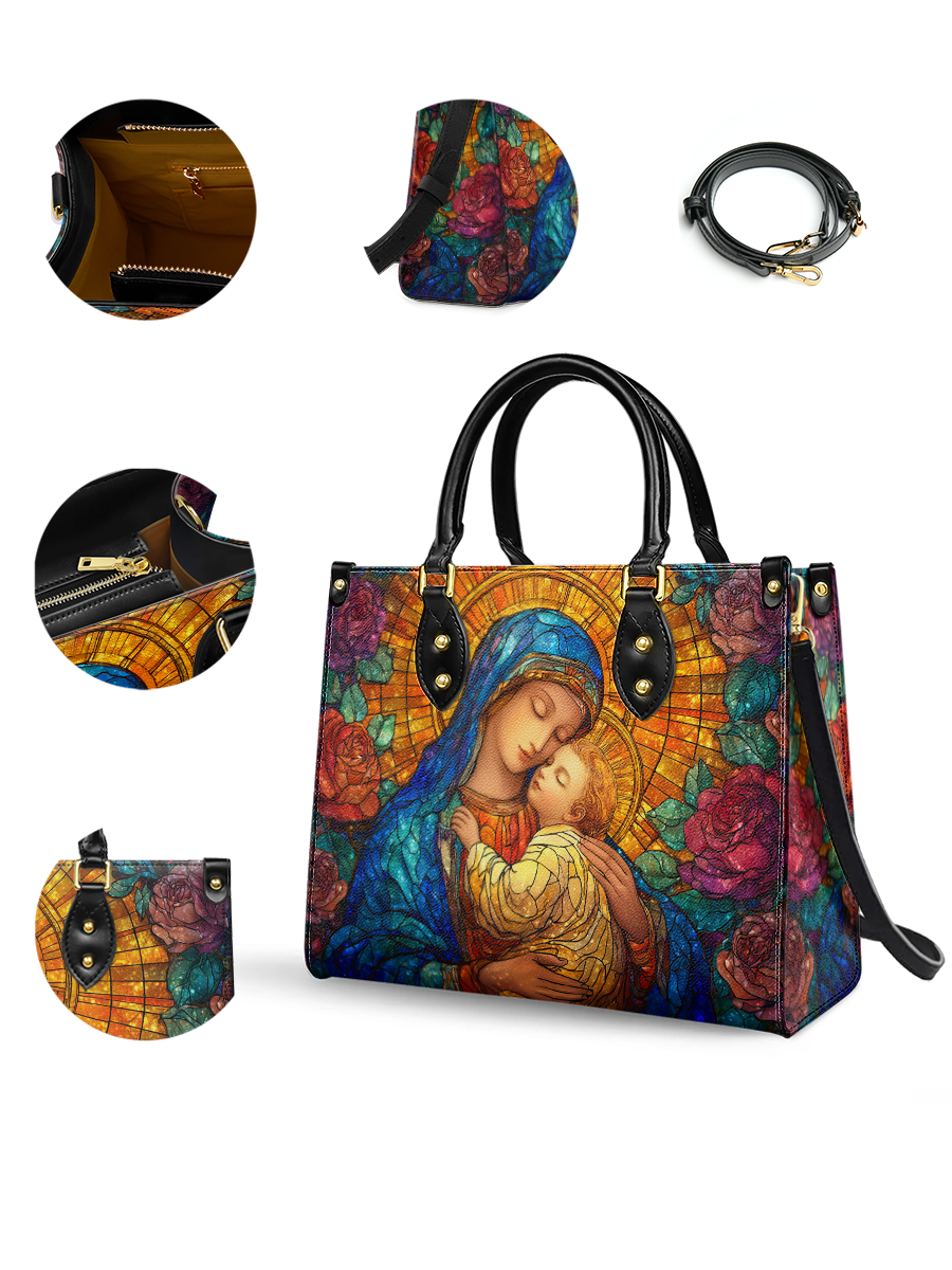 The Radiant Madonna Leather Bag tenderly portrays the Blessed Virgin cradling the Infant Jesus, surrounded by radiant golden light and blooming roses. The stained glass artistry captures both maternal warmth and heavenly grace, inspiring devotion and peace with every glance.