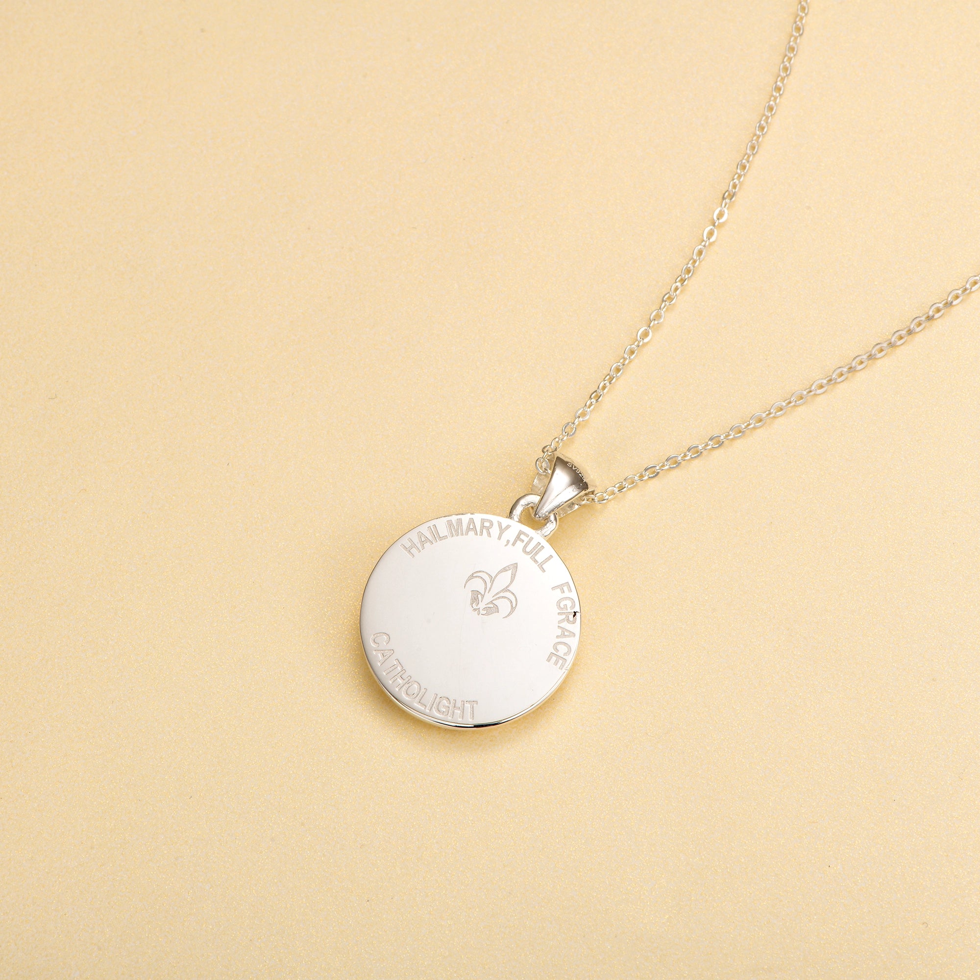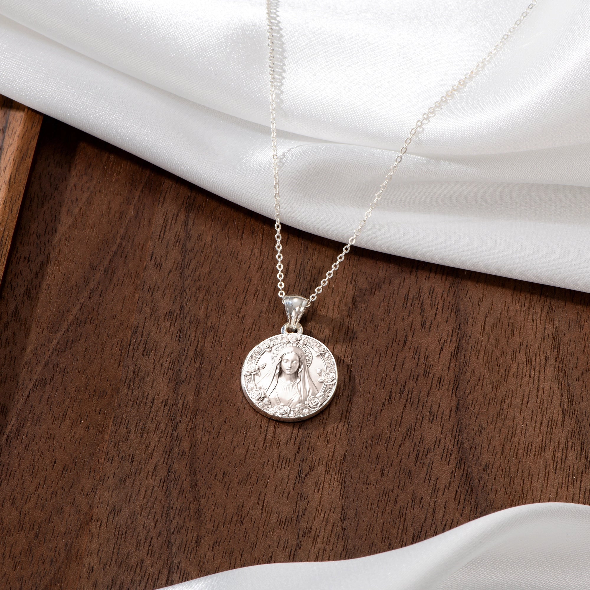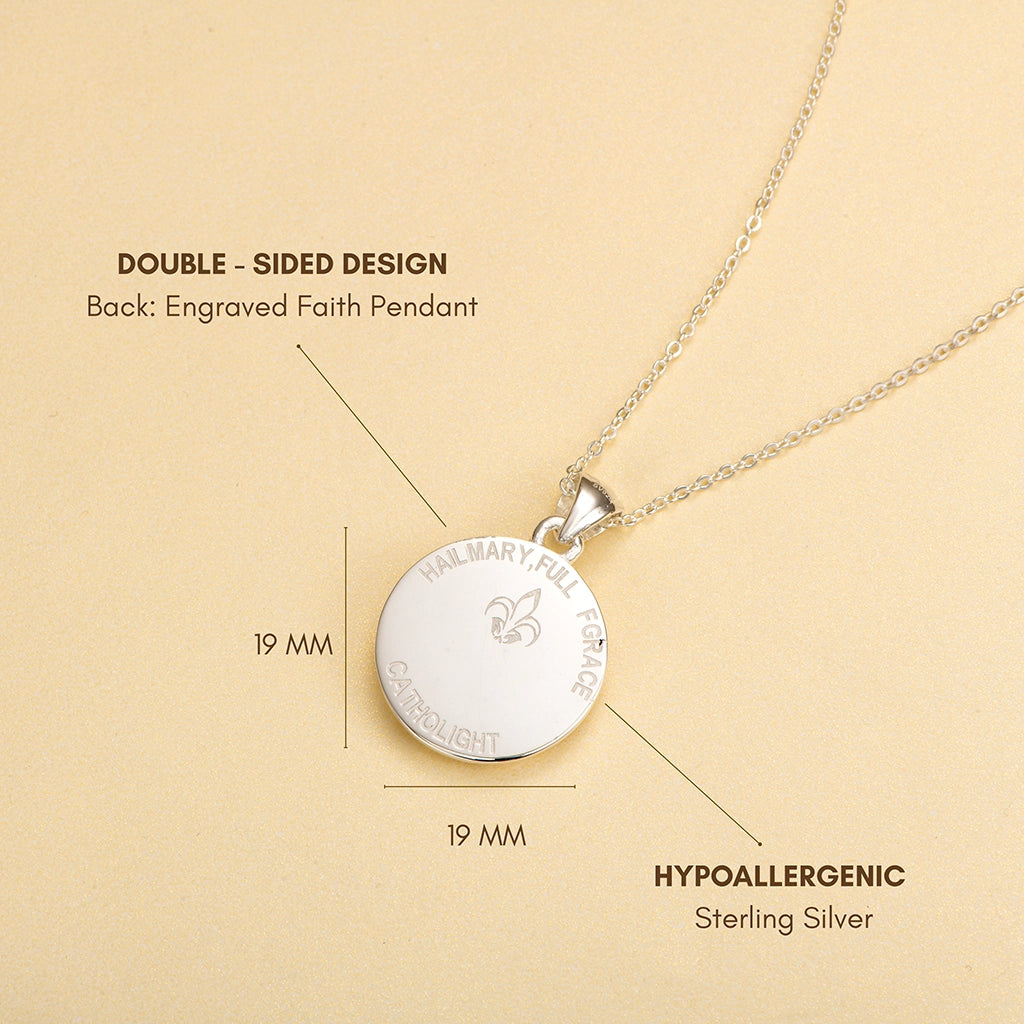 This pendant honors the Blessed Virgin Mary, surrounded by roses, the eternal symbol of purity, love, and devotion. Her serene gaze and flowing veil are delicately engraved, a timeless reminder of her intercession and maternal care.