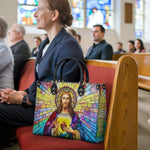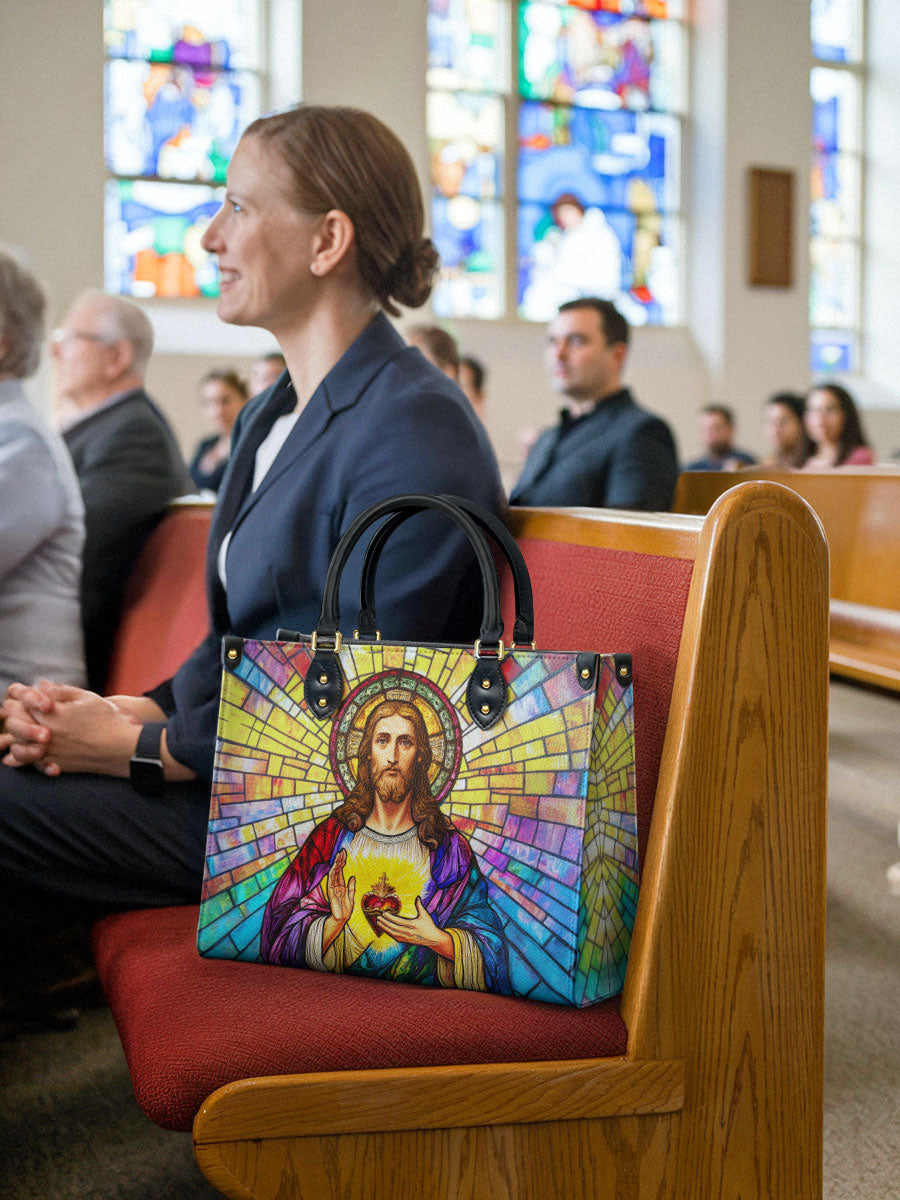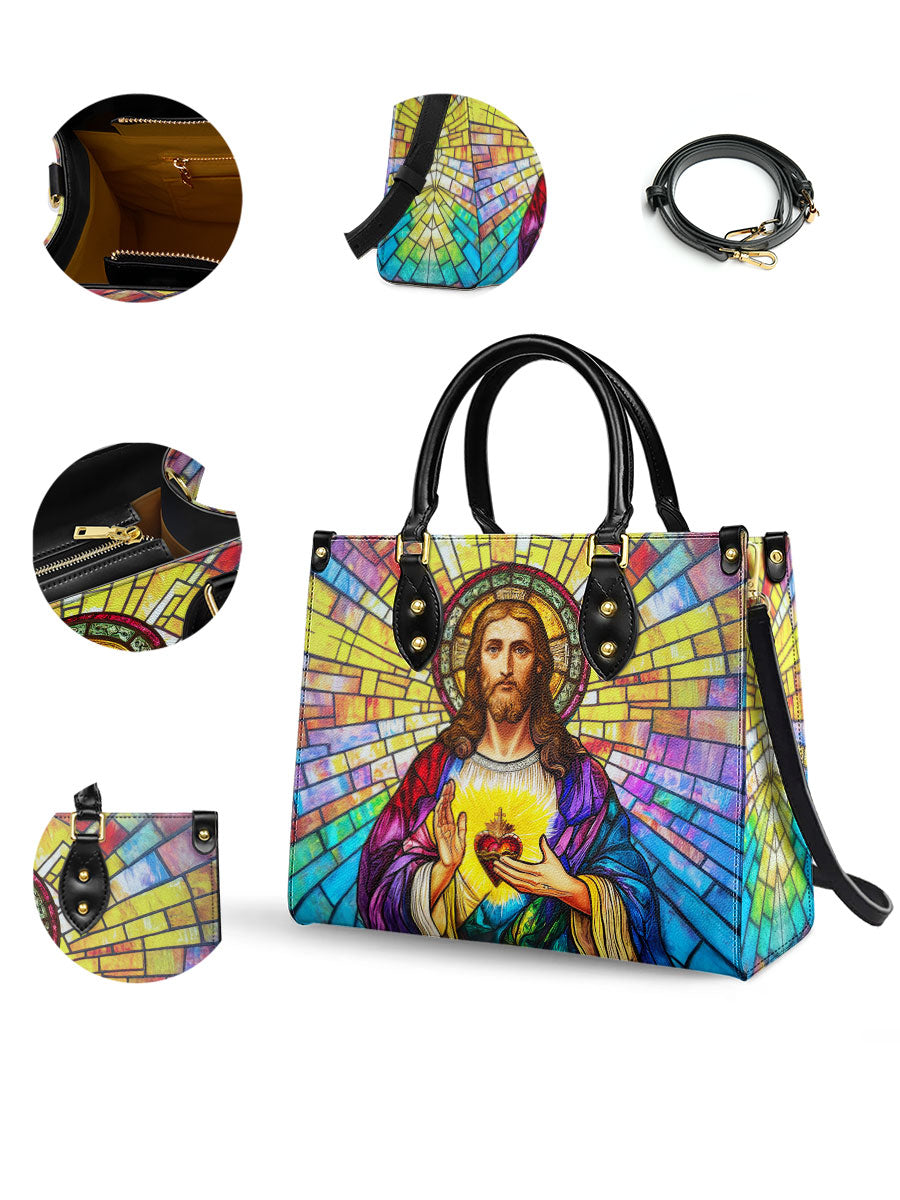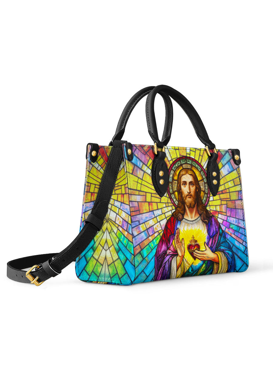 This striking handbag features the Sacred Heart of Jesus, radiating light and mercy in vibrant stained glass artistry. Every detail — from the golden rays to the vivid colors — symbolizes divine love, compassion, and strength.