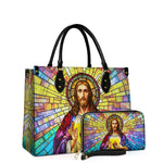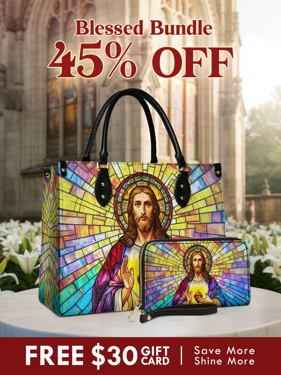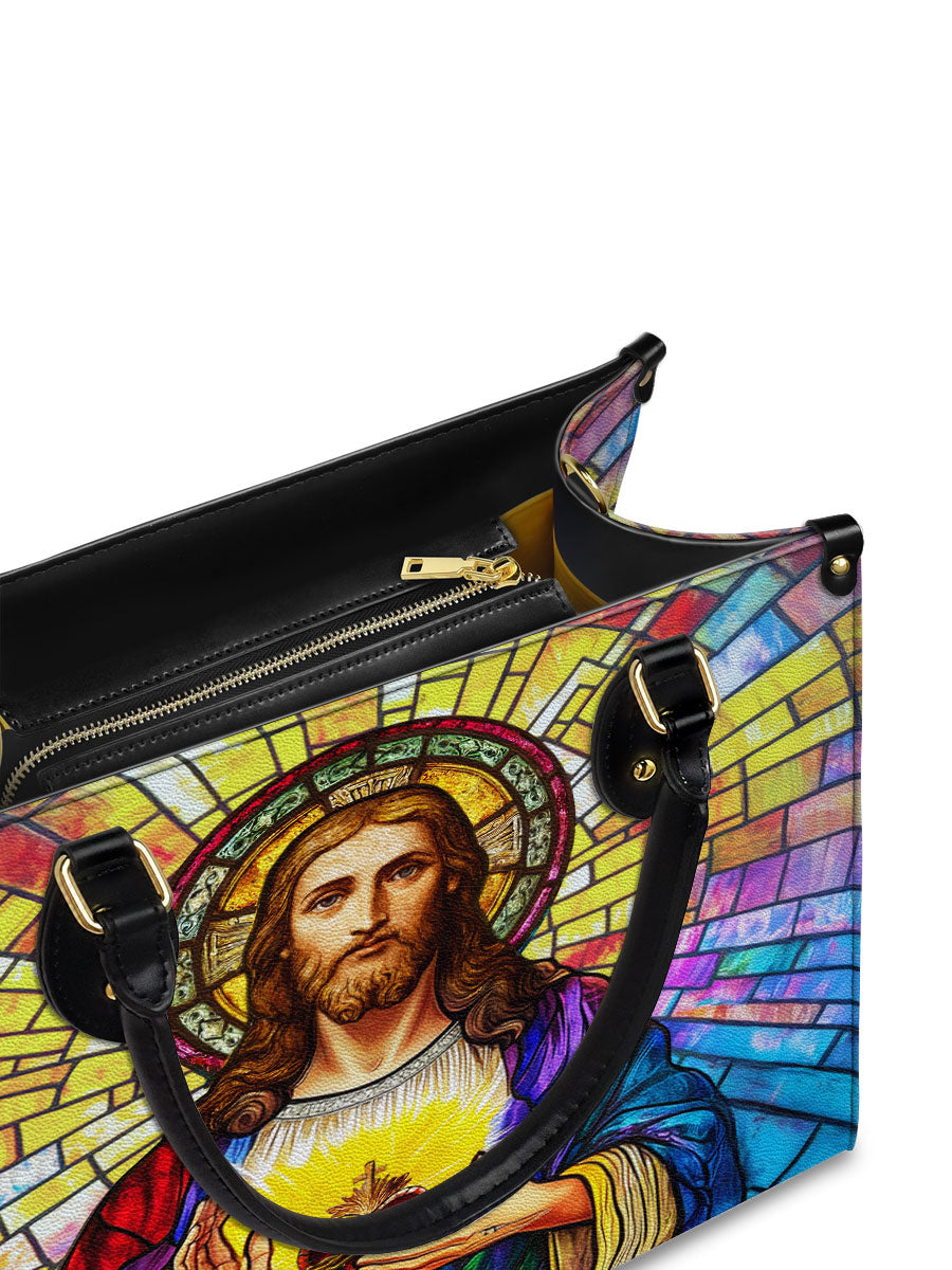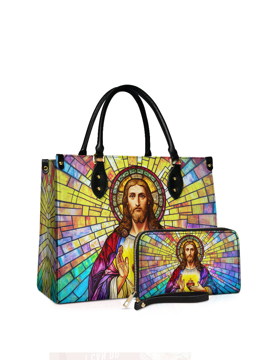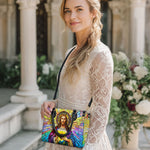 This striking handbag features the Sacred Heart of Jesus, radiating light and mercy in vibrant stained glass artistry. Every detail — from the golden rays to the vivid colors — symbolizes divine love, compassion, and strength.