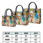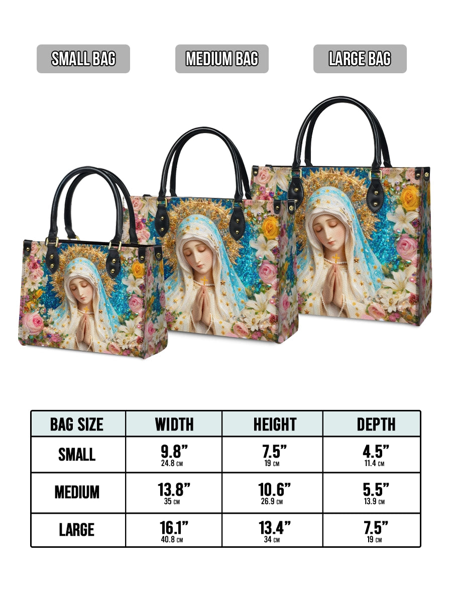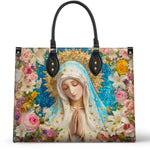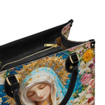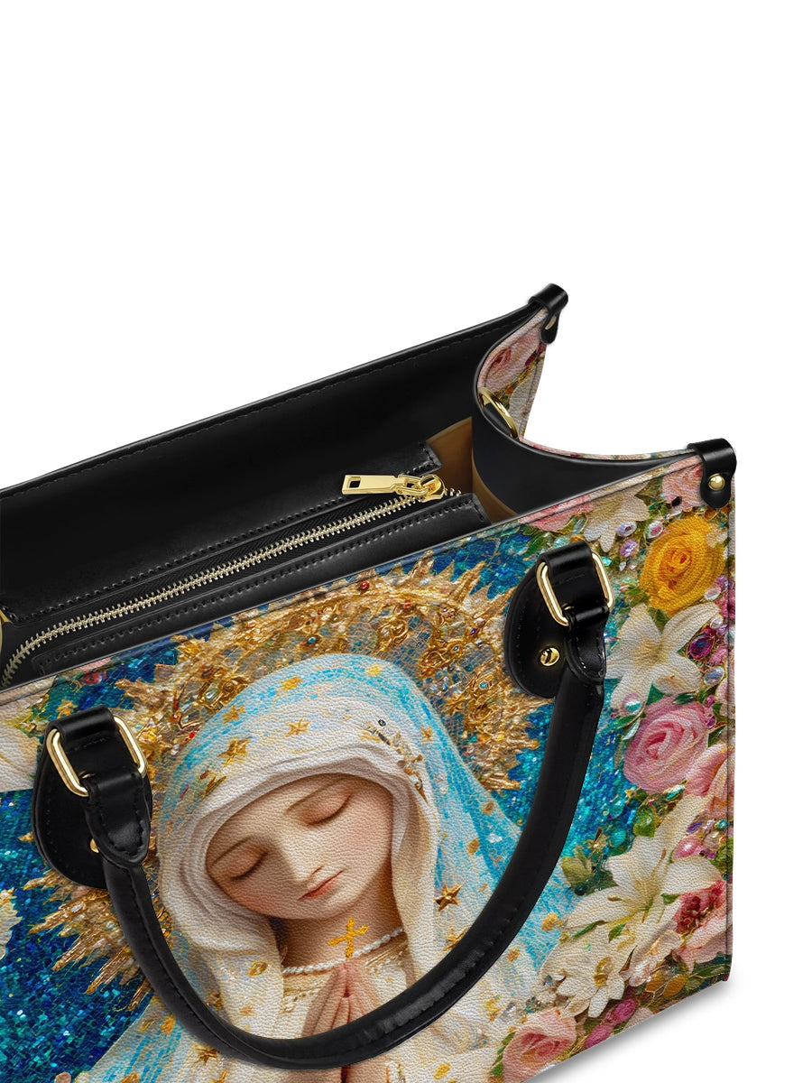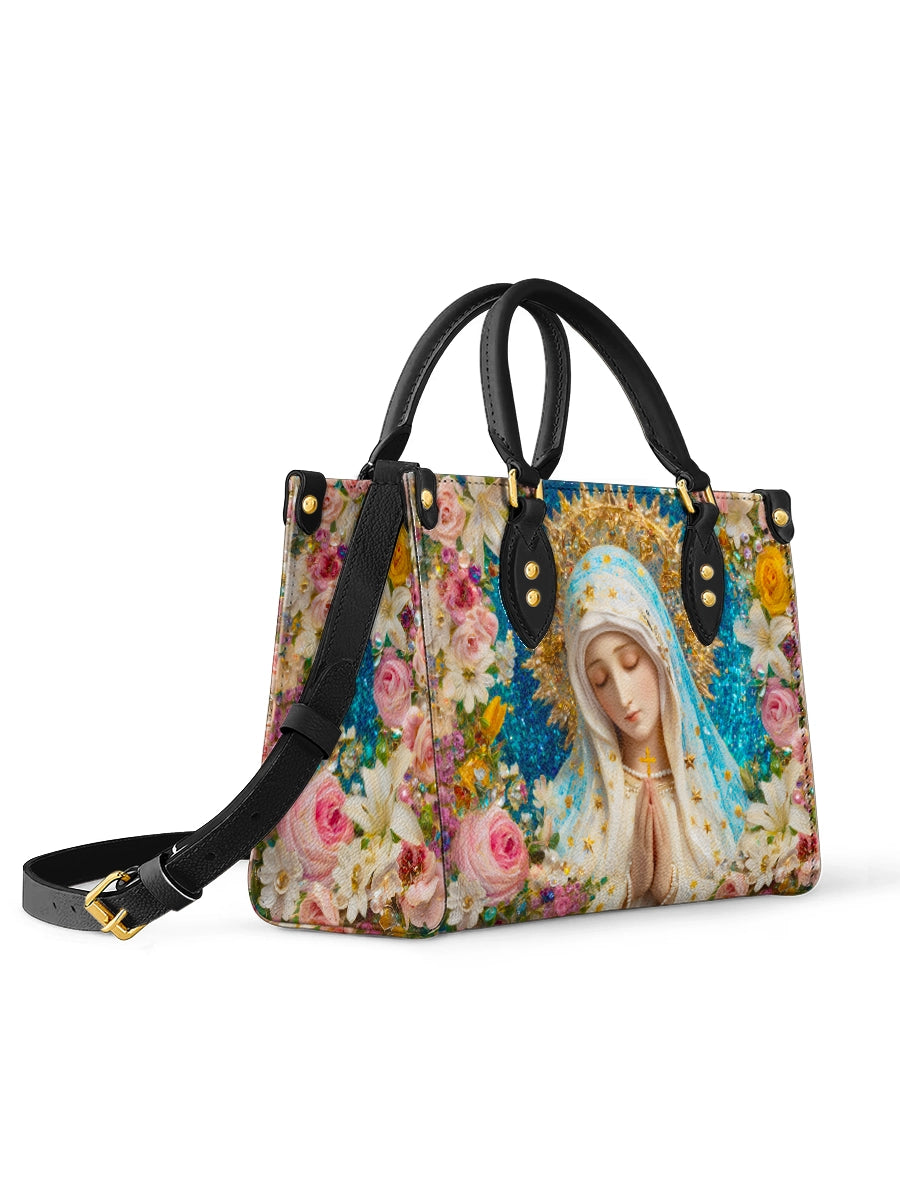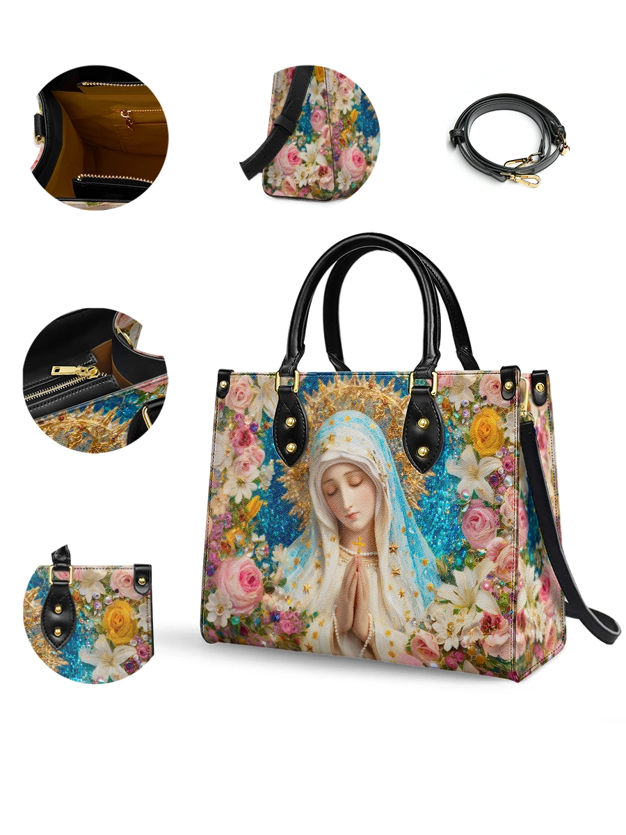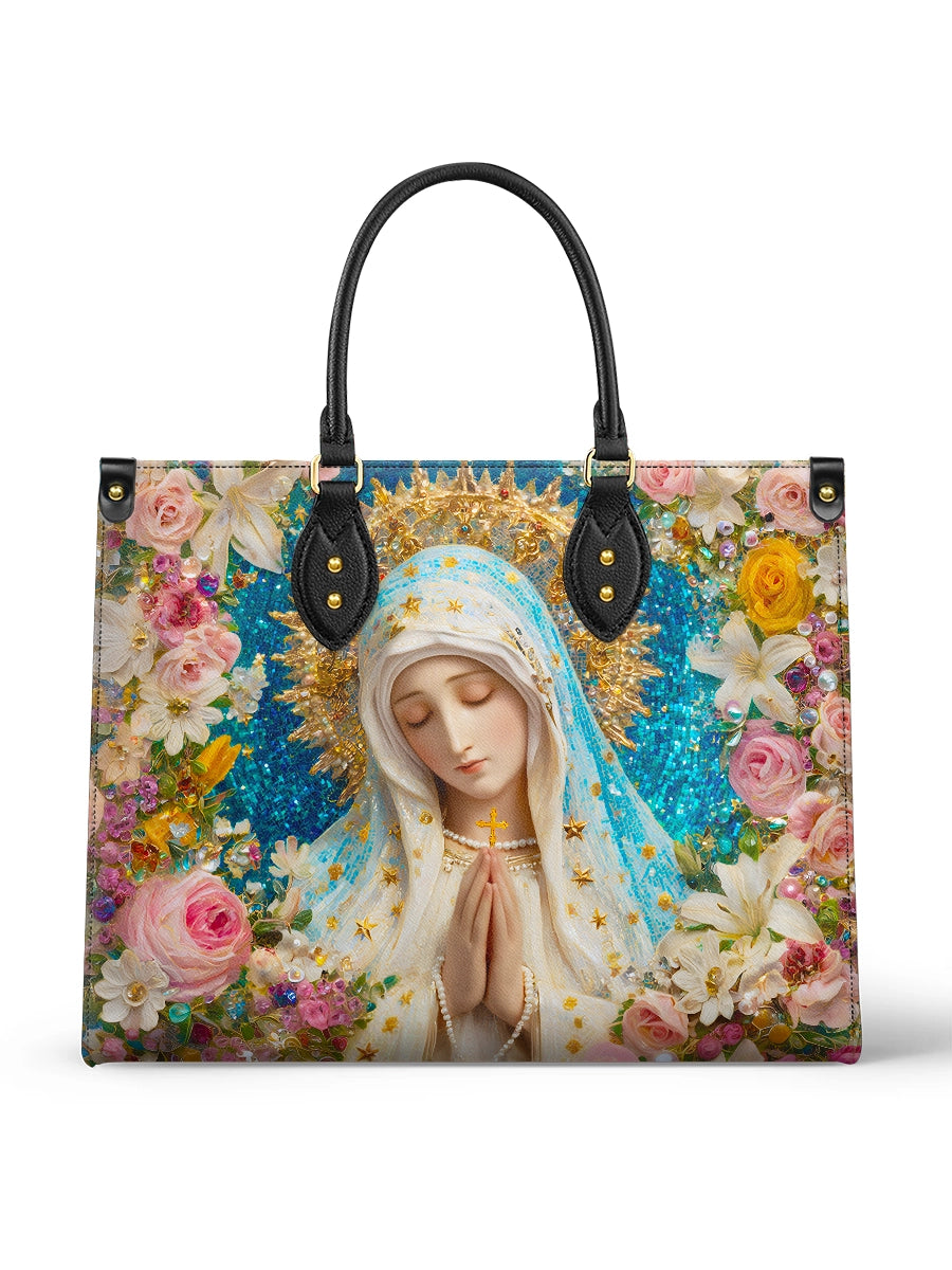 This exquisite bag presents a serene and luminous portrayal of the Blessed Virgin Mary in a moment of quiet prayer and deep contemplation. At the center of the design, Mary gently bows her head, her eyes closed in peaceful devotion, hands softly clasped together as a golden cross rests between her fingers. Her expression radiates humility, trust, and calm surrender, inviting a sense of stillness and grace to the viewer.