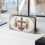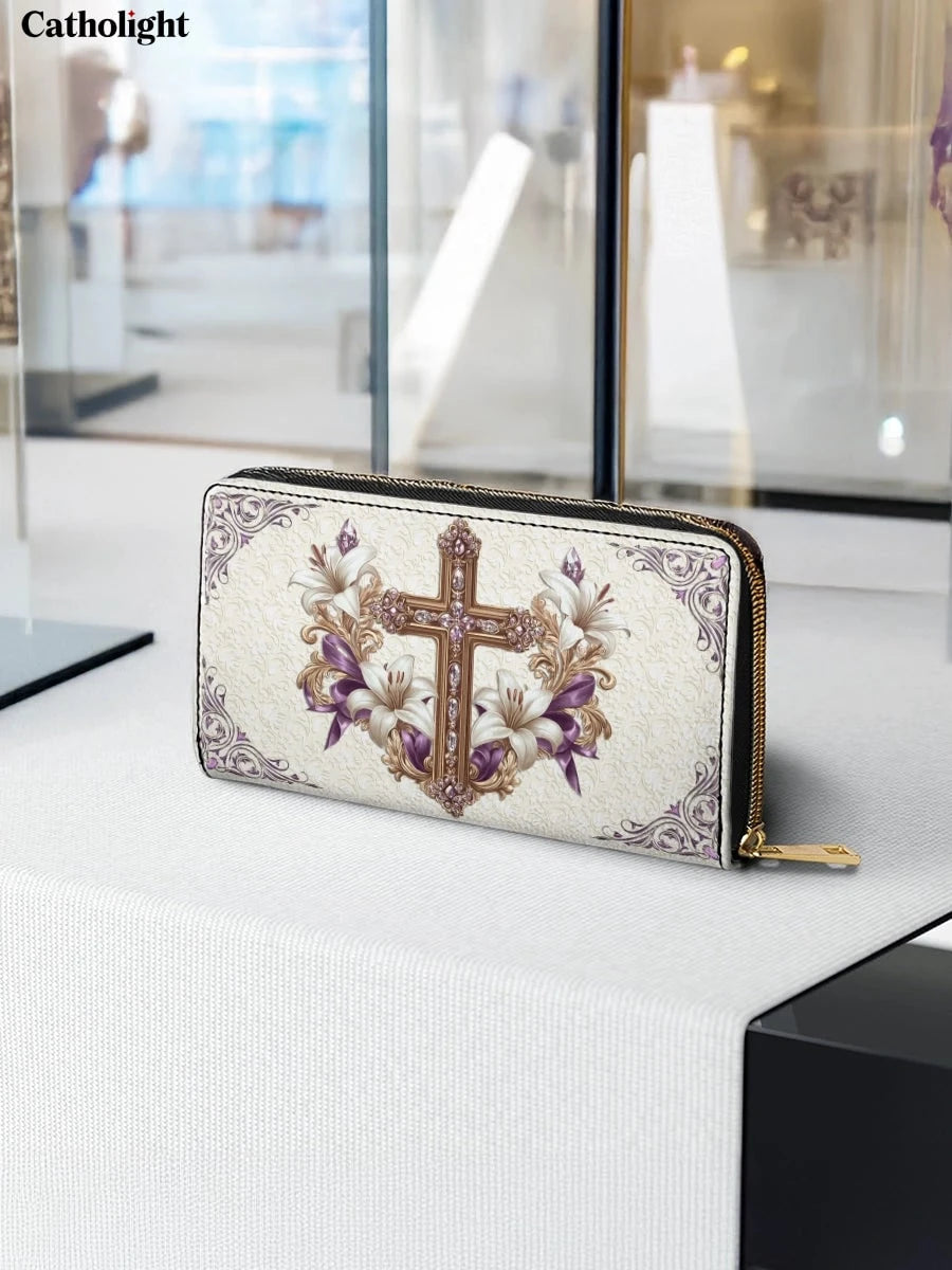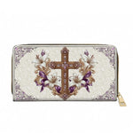 This stunning wallet showcases a beautifully detailed golden cross adorned with sparkling gemstones, exuding a sense of reverence and elegance. Surrounding the cross are graceful white lilies and soft purple accents, symbolizing purity, faith, and devotion. The intricate, embossed background adds depth and texture, with delicate scrollwork enhancing its sophisticated appeal.