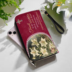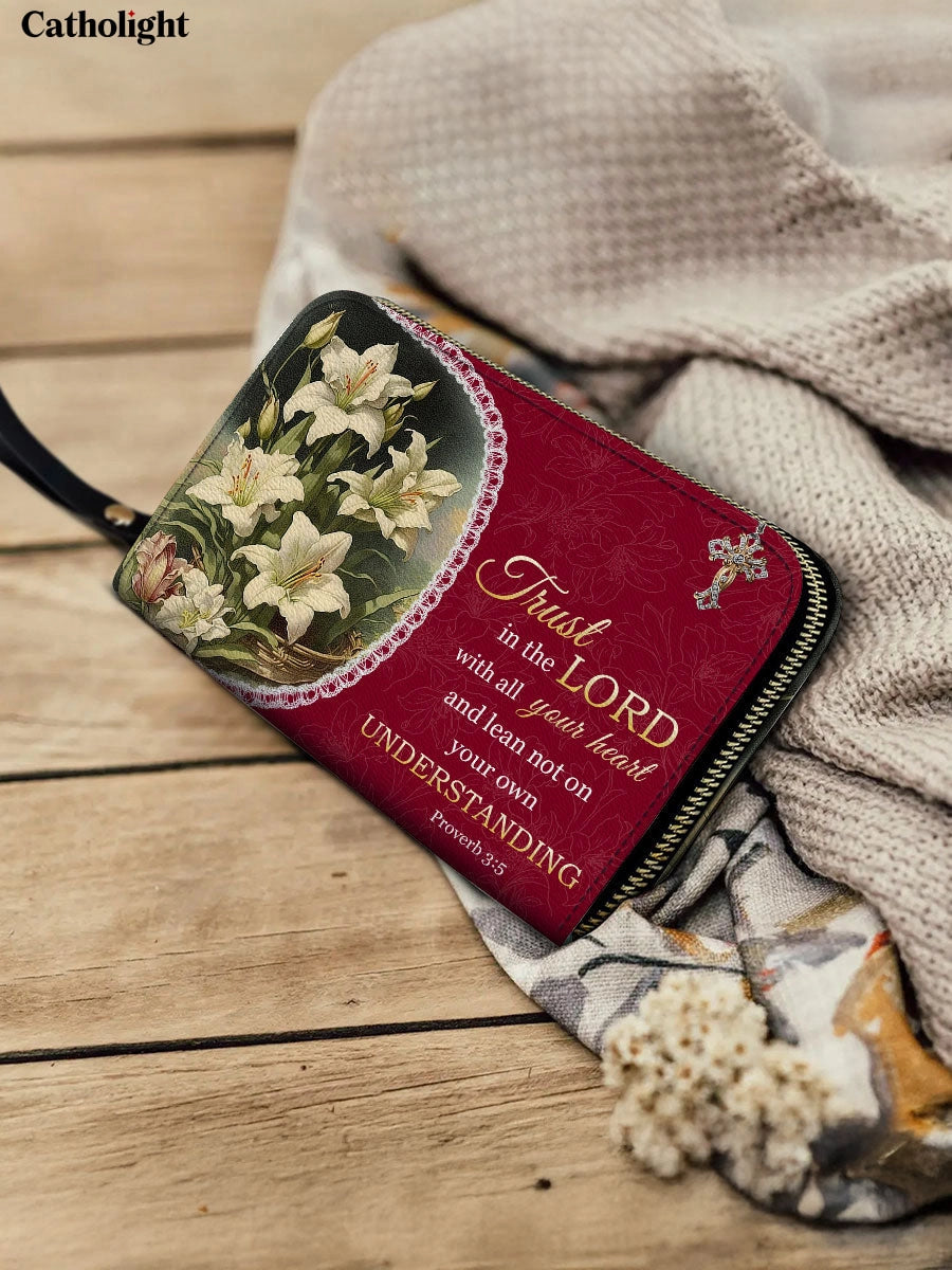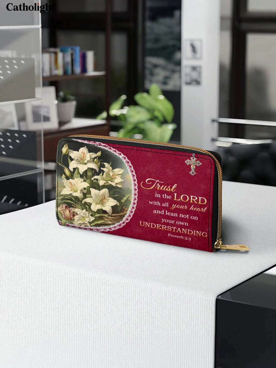 This beautifully crafted wallet features the inspiring verse “Trust in the Lord with all your heart and lean not on your own understanding” from Proverbs 3:5, framed by delicate white lilies and a rich crimson background. The lilies symbolize faith and hope, while the intricate details and elegant design evoke serenity and spiritual connection.