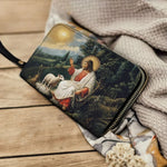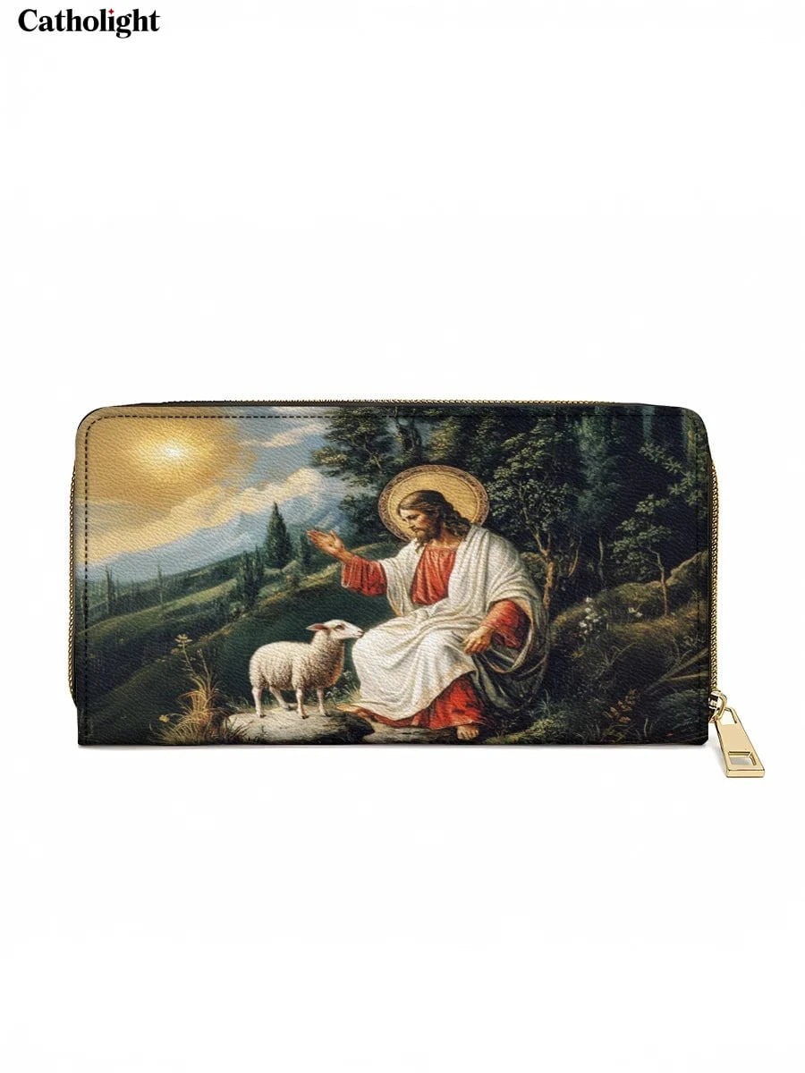 The intricate details of Christ’s robes, the lamb’s soft presence, and the glowing halo around His head bring the scene to life, making this wallet a meaningful representation of faith and trust in divine care.