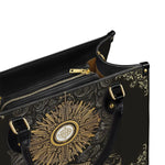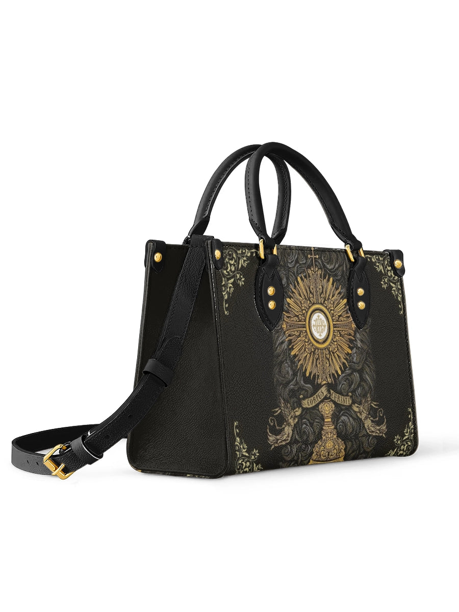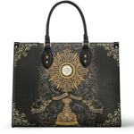 This sophisticated leather bag showcases a magnificent depiction of the sacred monstrance, adorned with radiant golden rays and intricate detailing that honors the divine presence in the Eucharist. Surrounded by delicate floral designs and angelic motifs, the artwork beautifully embodies the reverence and splendor of the Corpus Christi tradition. The deep black background enhances the brilliance of the gold accents, creating a striking and spiritual design.