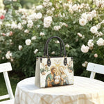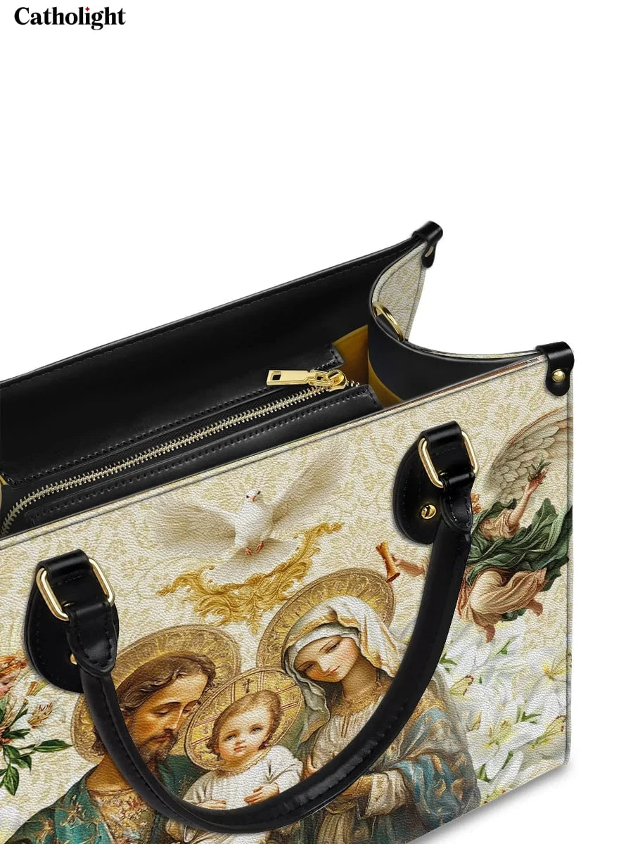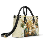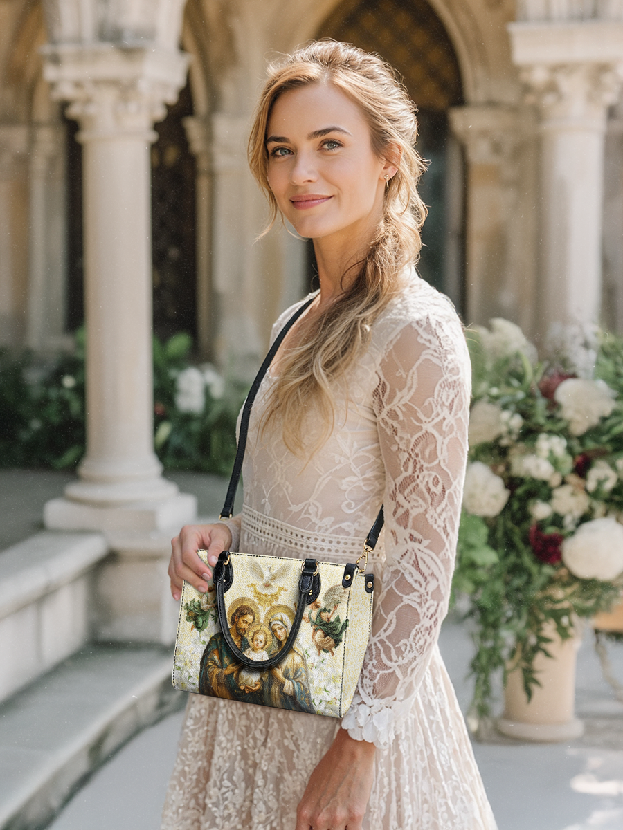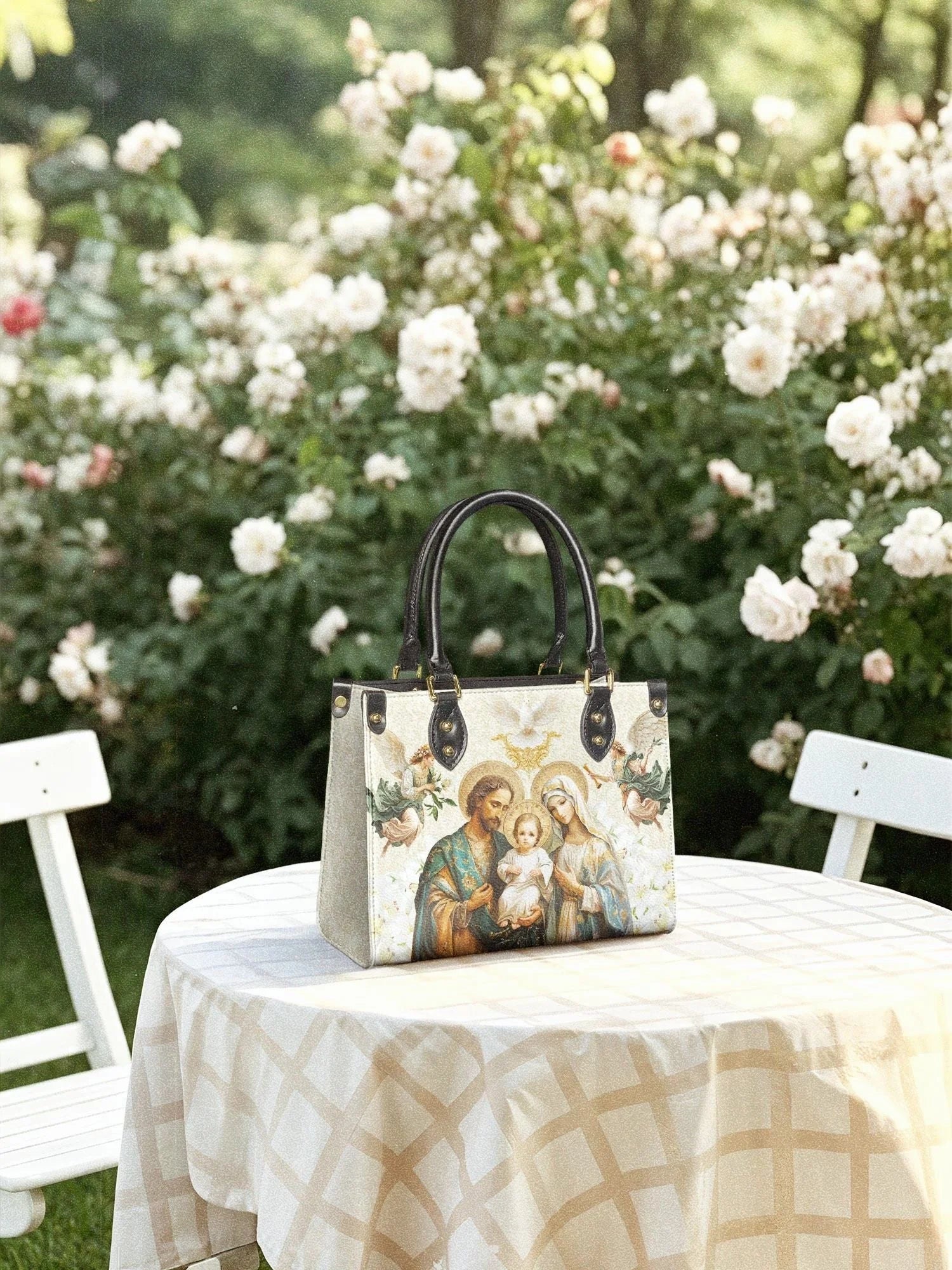 This exquisite leather bag features a beautiful rendering of the Holy Family—Jesus, Mary, and Joseph—surrounded by angels and delicate lilies. The rich symbolism and peaceful colors evoke a sense of divine love, protection, and unity. The radiant, ethereal atmosphere of the artwork invites feelings of serenity and hope, making it a perfect reminder of the Holy Family’s sacred bond.