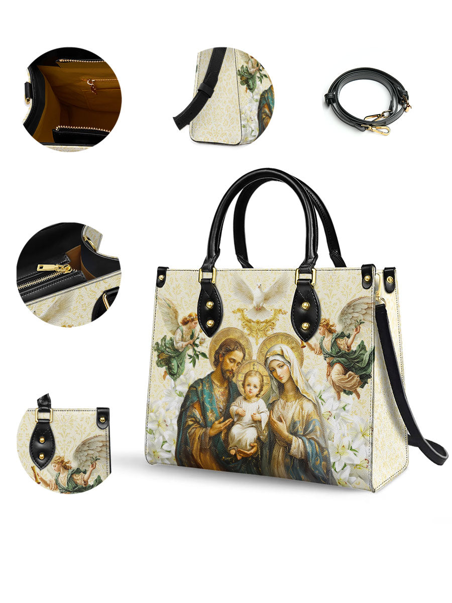 Carrying this bag brings a sense of spiritual connection and grace, a daily expression of faith and devotion. The intricate details of the art, from the heavenly doves to the tender embrace of the family, create a visual masterpiece that resonates deeply with the heart.