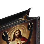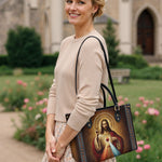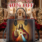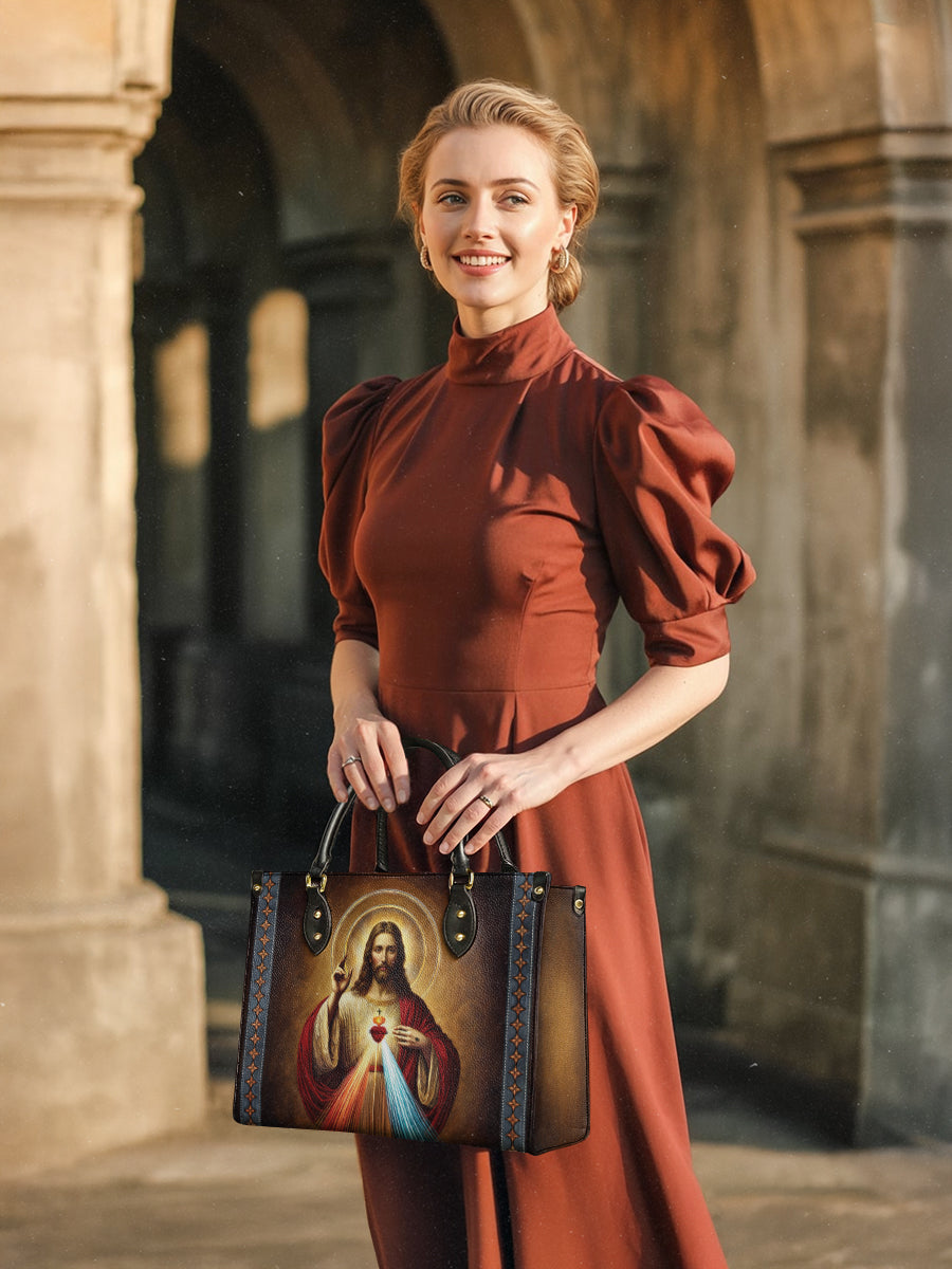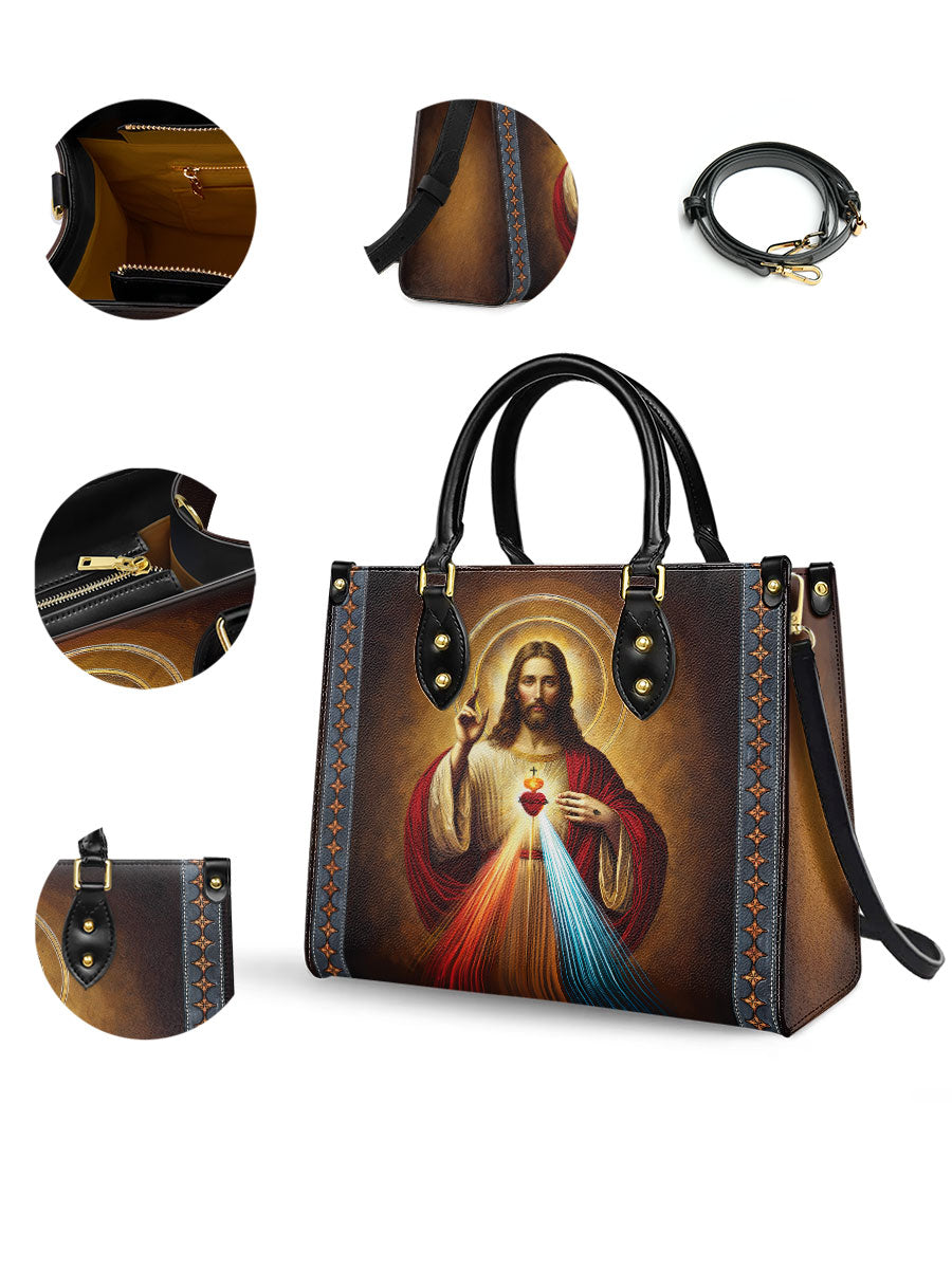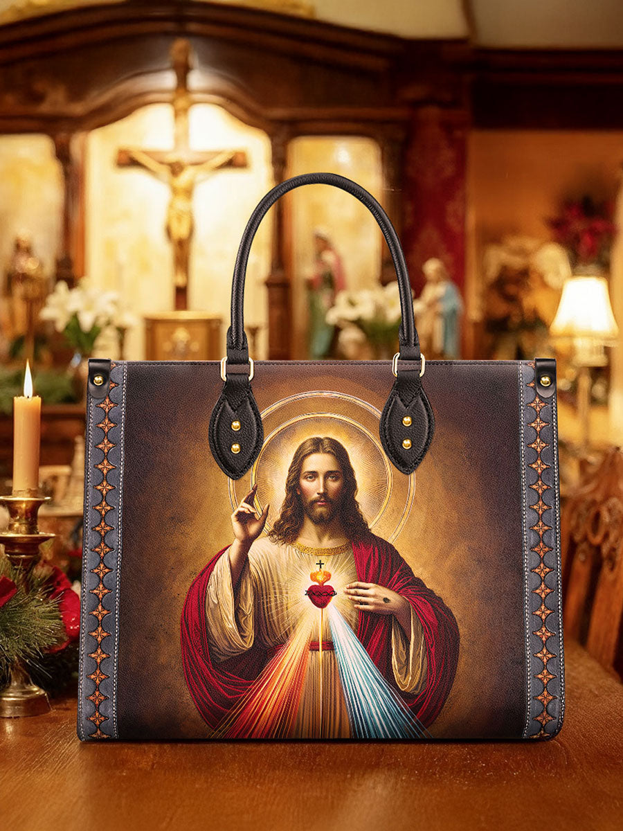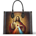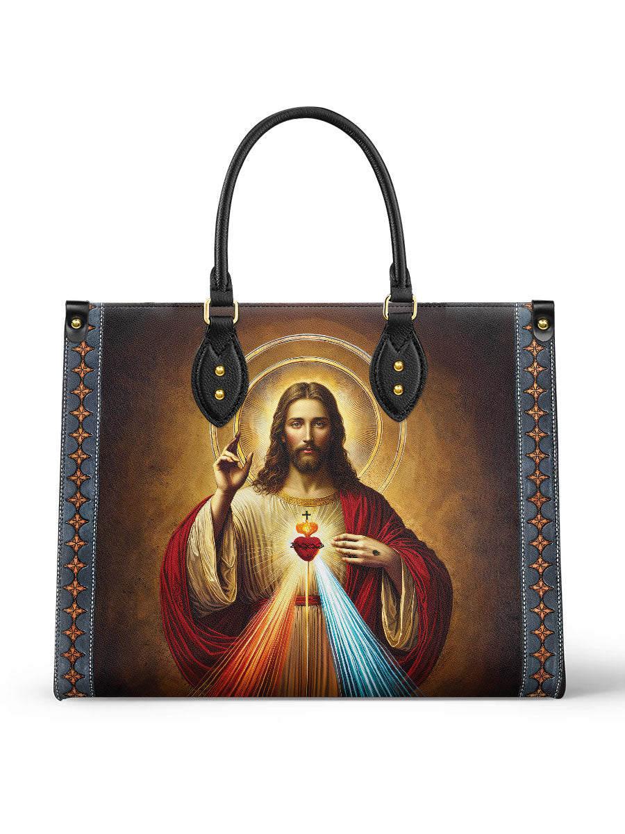 This exceptional leather bag features an awe-inspiring depiction of the Divine Mercy, radiating love, forgiveness, and boundless grace. At the center is the serene image of Jesus Christ, His Sacred Heart illuminated with divine light, emanating rays of red and white to symbolize the blood and water that flow as a source of mercy for humanity.
