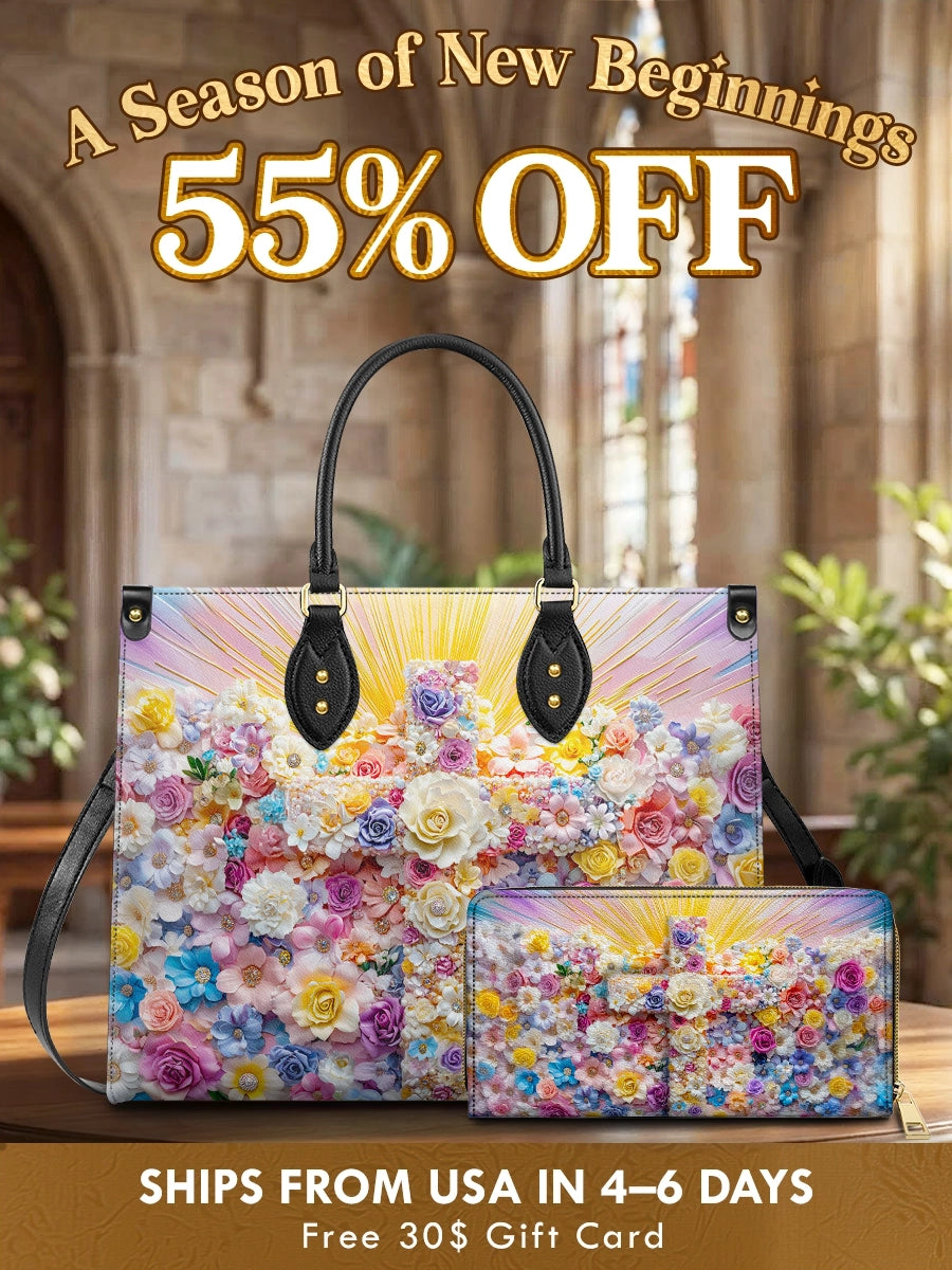 Carry beauty with light. This radiant set captures the joyful spirit of creation, featuring a blooming tapestry of flowers bathed in golden light — a subtle reflection of divine renewal and hope. It’s designed for women who walk with both faith and grace.