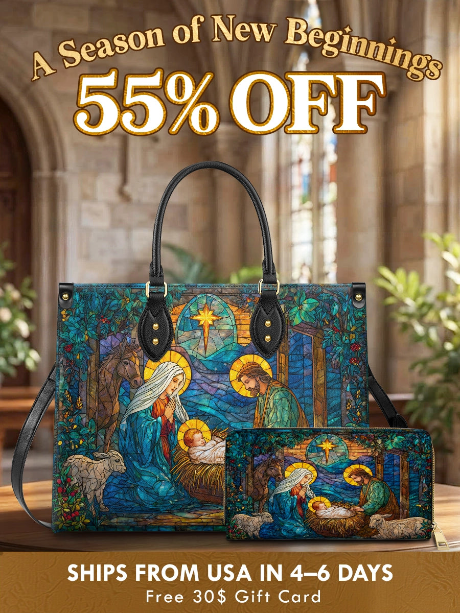 This radiant handbag captures the Holy Nativity — Mary and Joseph gazing upon the newborn Christ beneath the Star of Bethlehem, surrounded by the humble beauty of creation. Rendered in timeless stained glass artistry, the scene reflects peace, devotion, and the miracle of God’s love made flesh.