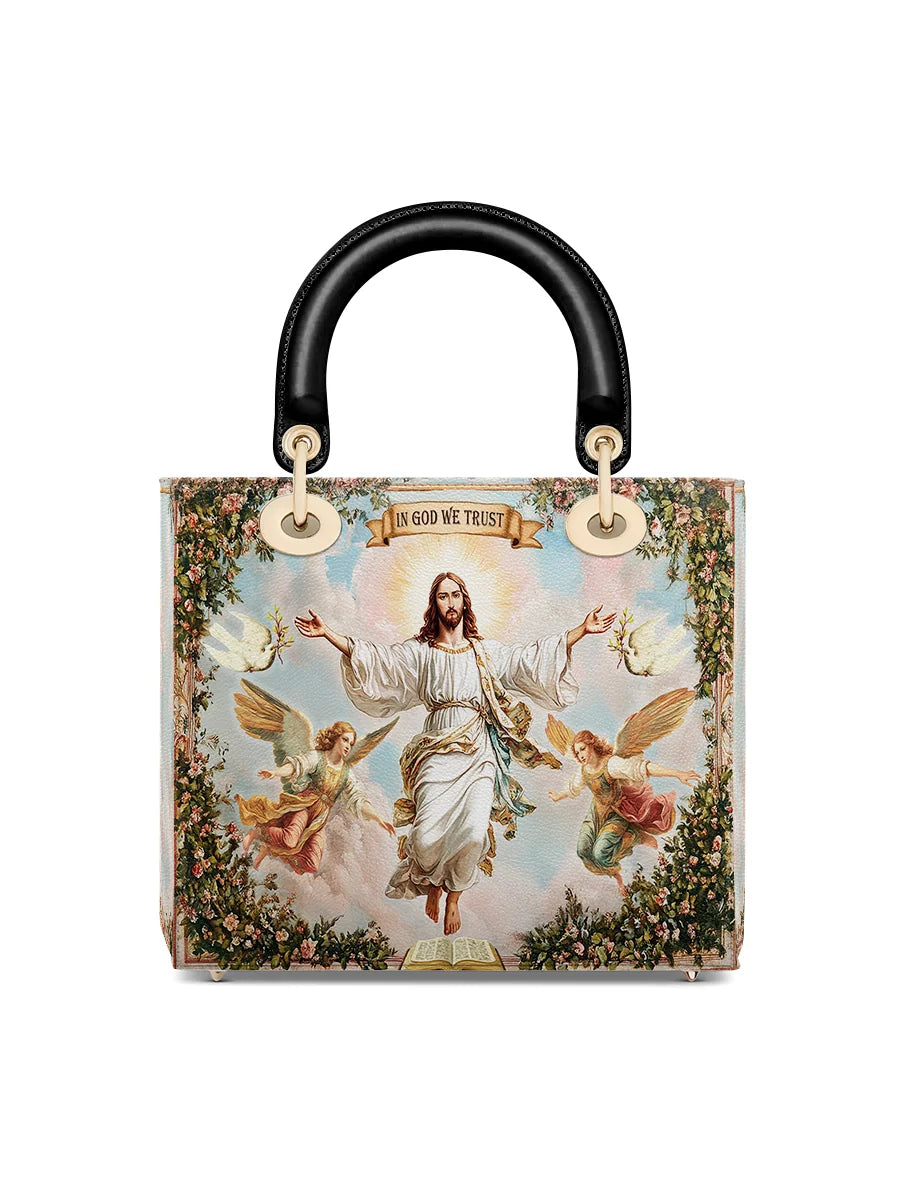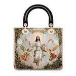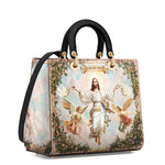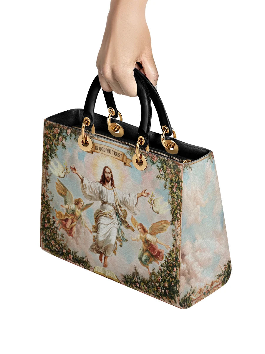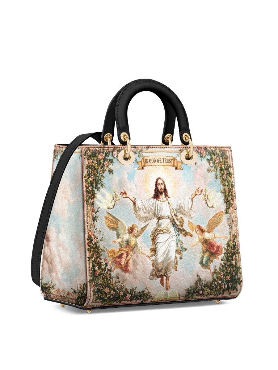 This beautifully designed leather bag captures the majestic scene of Jesus Christ’s Ascension, surrounded by divine light and heavenly elements. At the heart of the composition, Jesus is depicted in flowing white robes, rising gracefully into the sky with arms outstretched in a gesture of blessing and welcome. His serene expression radiates peace and love, while golden rays emanate behind him, symbolizing his divine glory.