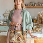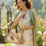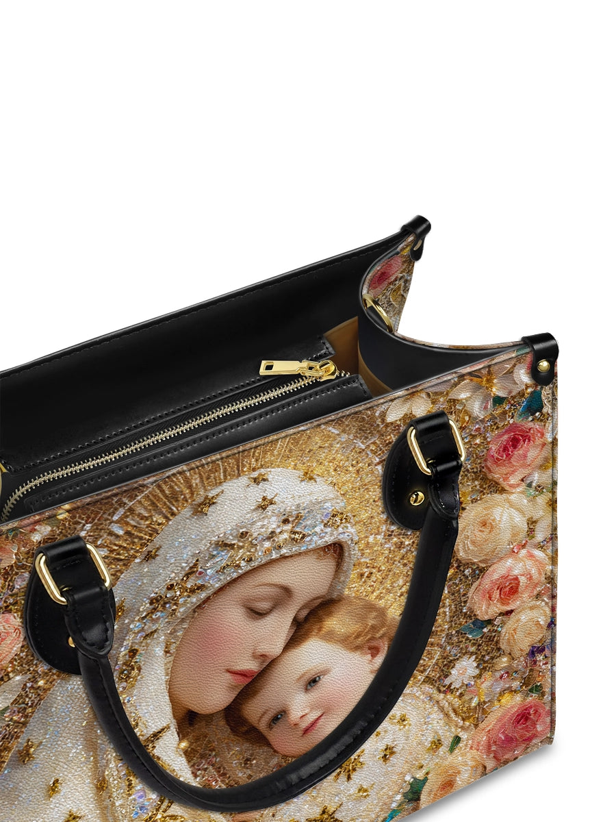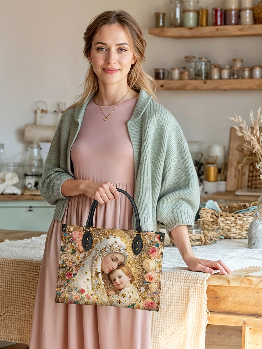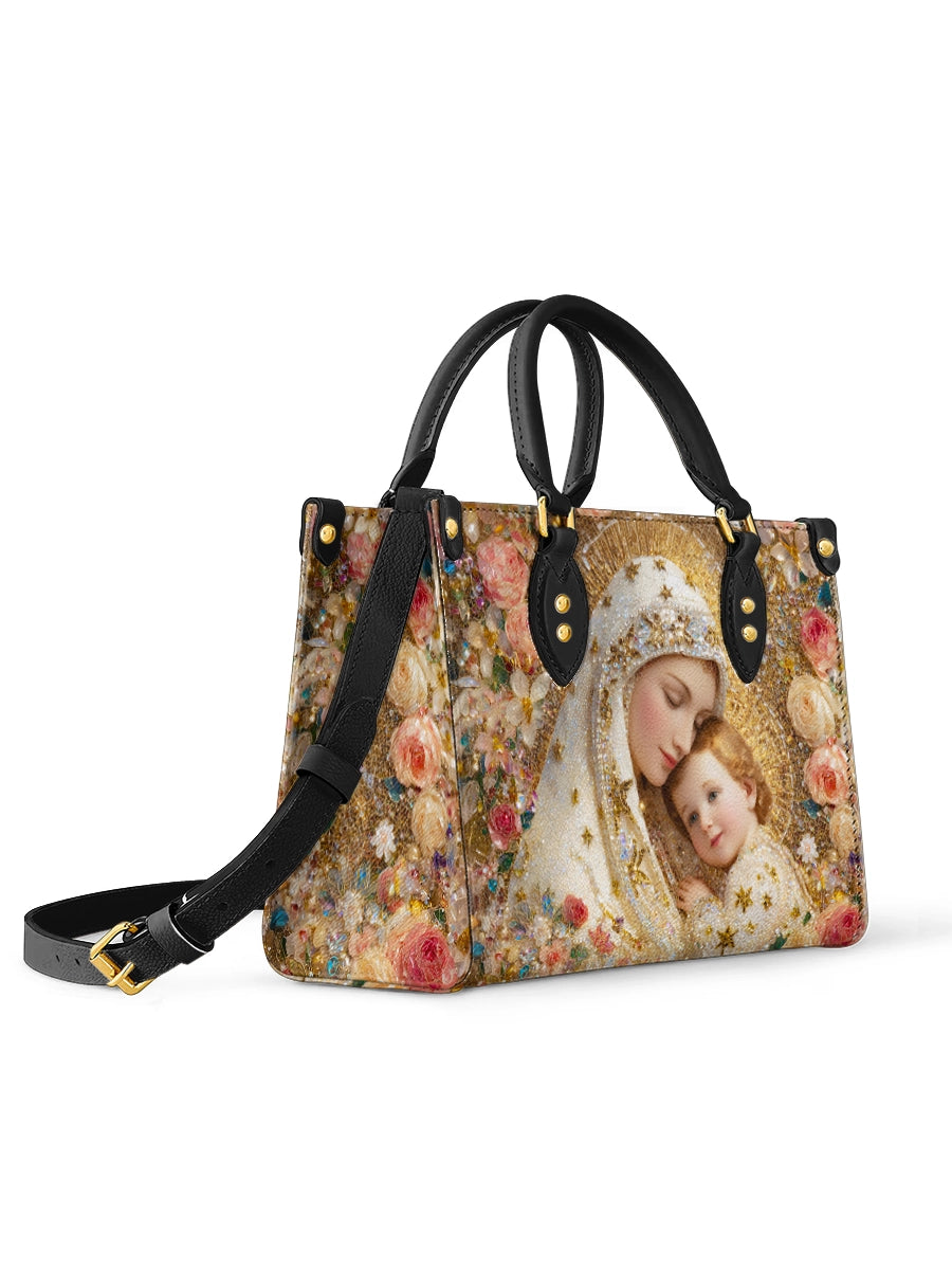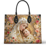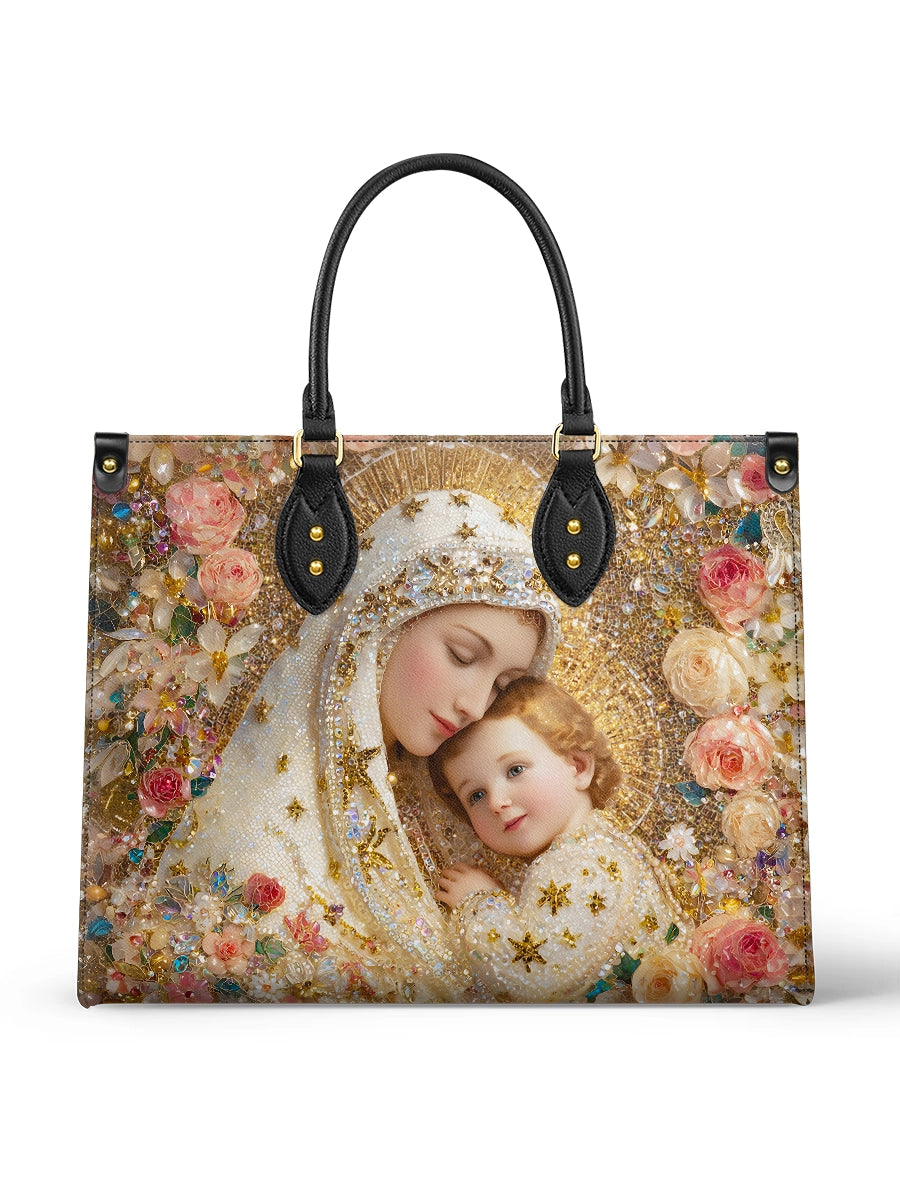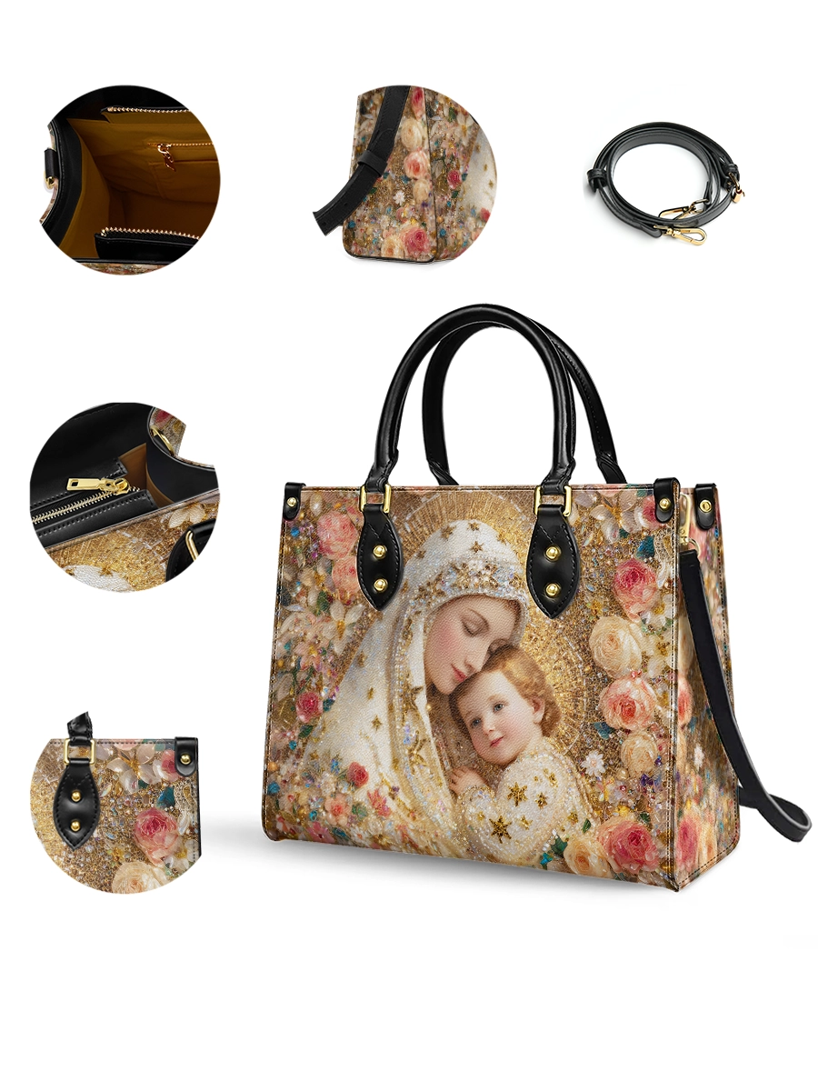 This exquisite bag features a deeply tender and radiant depiction of the Blessed Virgin Mary gently embracing the Christ Child, a timeless image of divine love, protection, and sacred intimacy. At the heart of the design, Mary inclines her head with serene devotion, her expression filled with warmth and quiet grace, while the Child rests lovingly against her, gazing outward with gentle light and innocence. Together, they form a powerful symbol of maternal care and heavenly comfort.