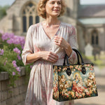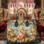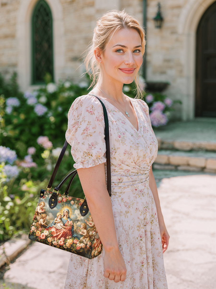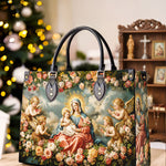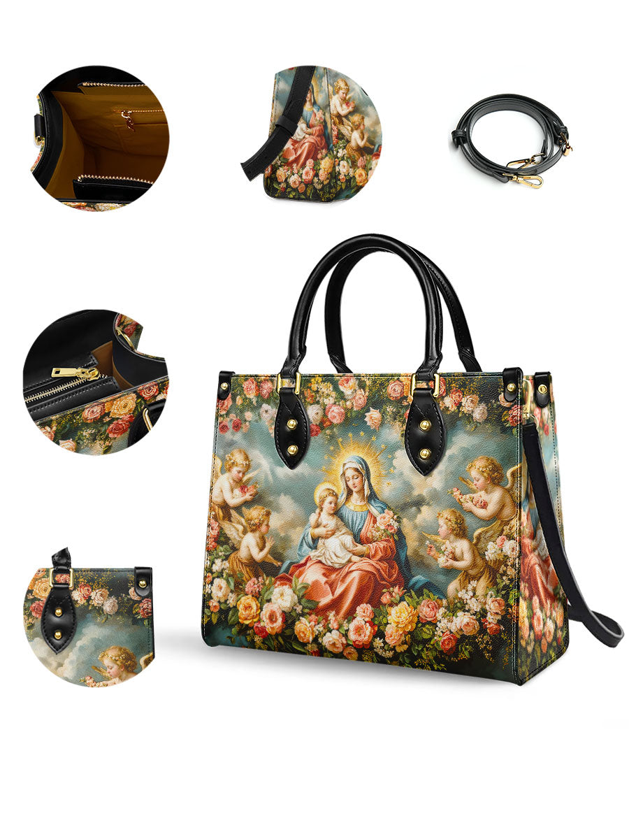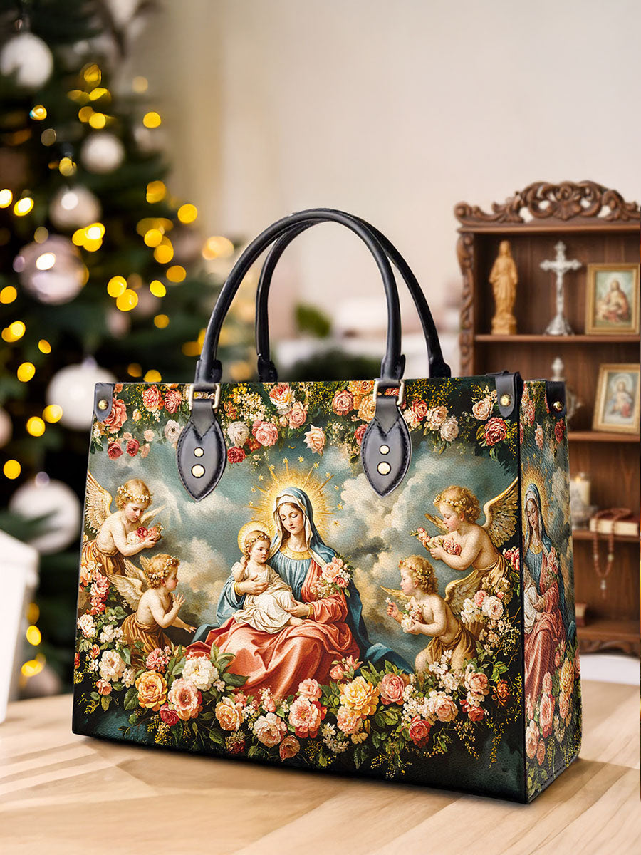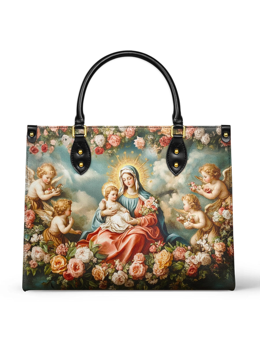 This exquisitely designed leatherbag features a serene and tender depiction of the Madonna and Child, surrounded by a heavenly host of cherubic angels. At the heart of the design, the Virgin Mary cradles the Christ Child in her arms, her gentle gaze radiating love and maternal devotion. Both are encircled by a golden halo, symbolizing their divine nature and sacred bond.
