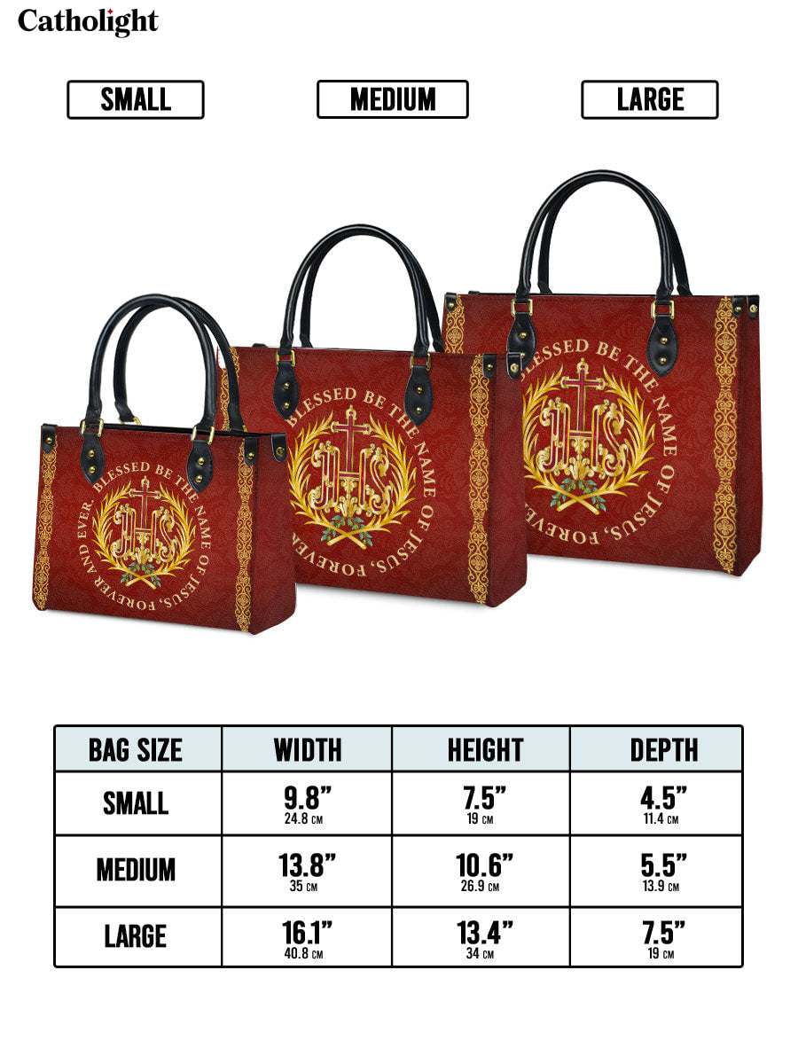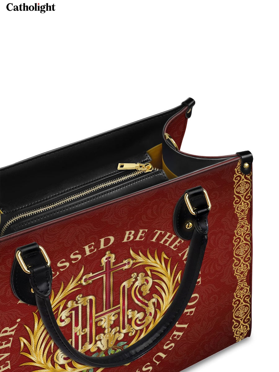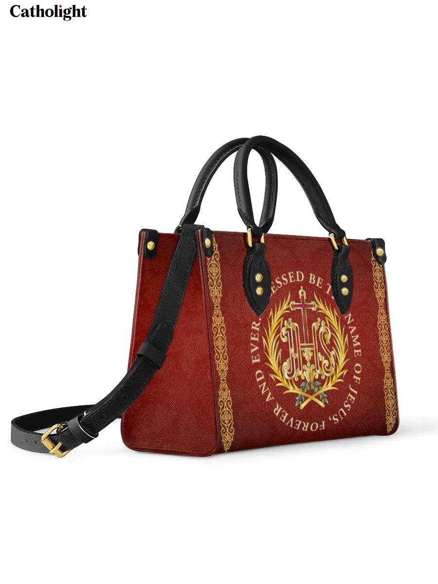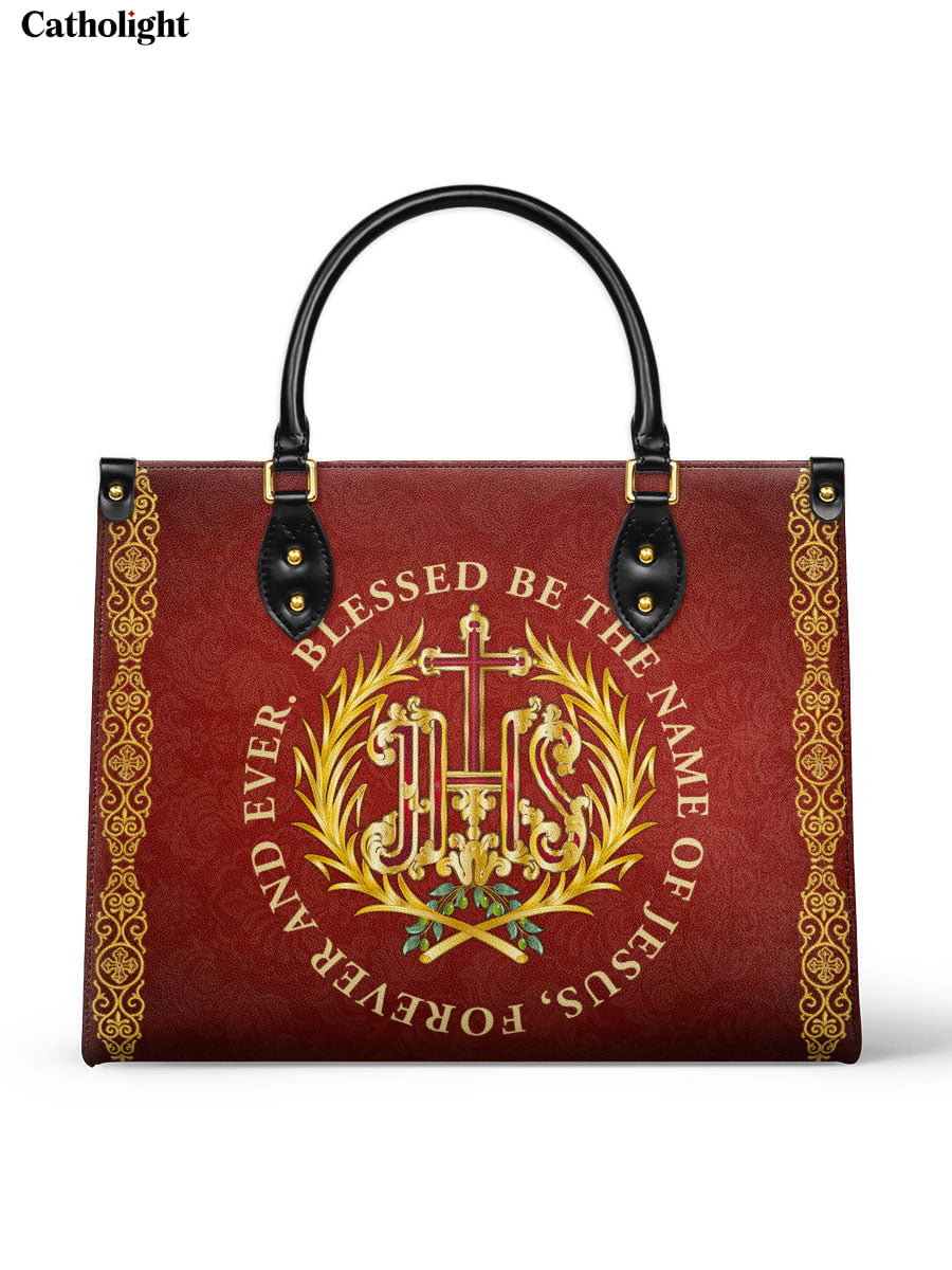 Questa squisita borsa in pelle presenta il sacro monogramma "IHS", che rappresenta il Santo Nome di Gesù, circondato da una radiosa corona dorata e adornato con delicati accenti floreali. La frase edificante “Benedetto sia il Nome di Gesù, nei secoli dei secoli” è elegantemente esposta attorno all'emblema, offrendo un potente promemoria di devozione e rispetto. Lo sfondo di un profondo cremisi, arricchito da intricate decorazioni dorate, crea un design senza tempo che emana fede e grazia.