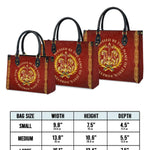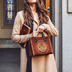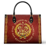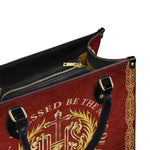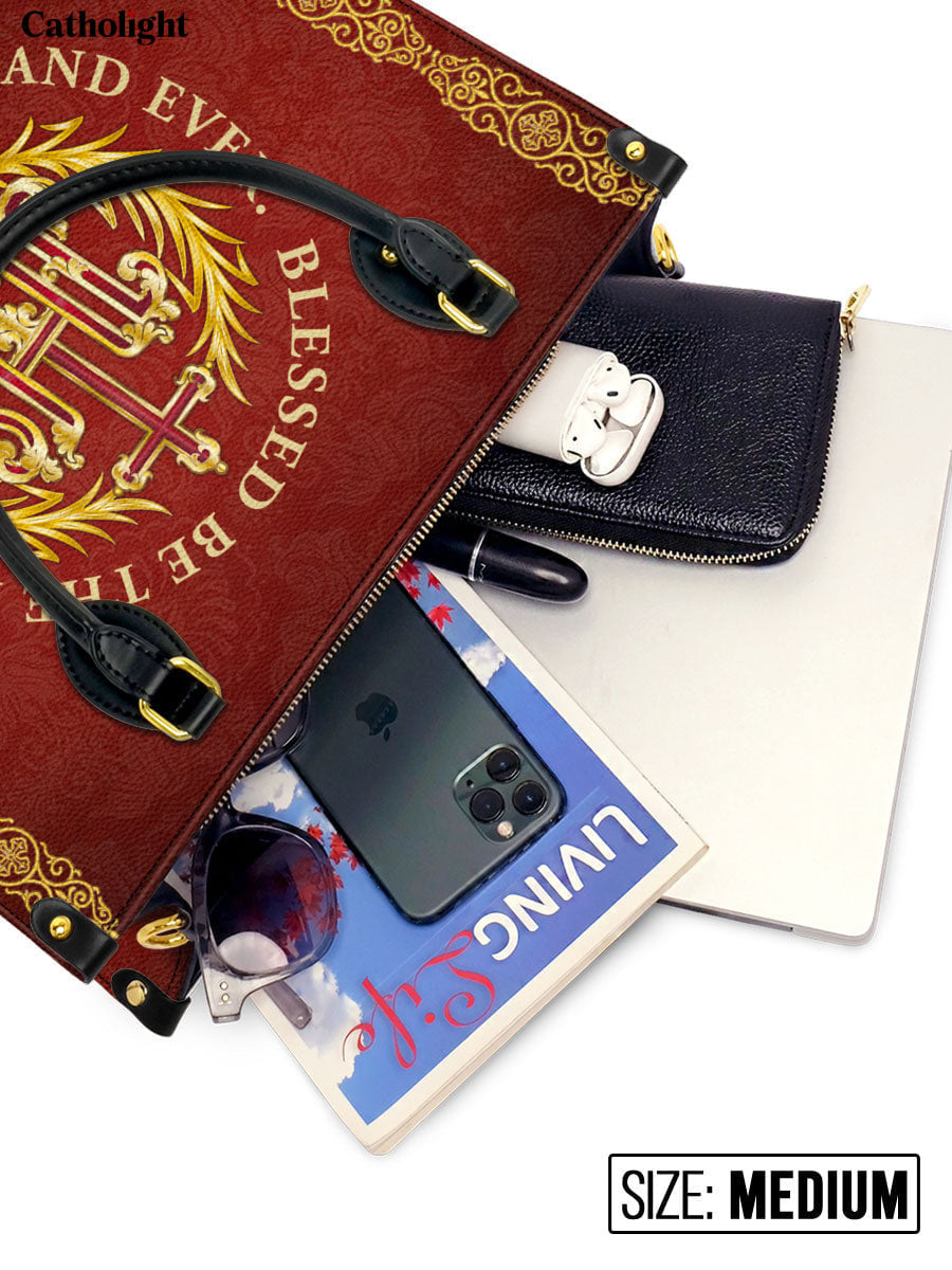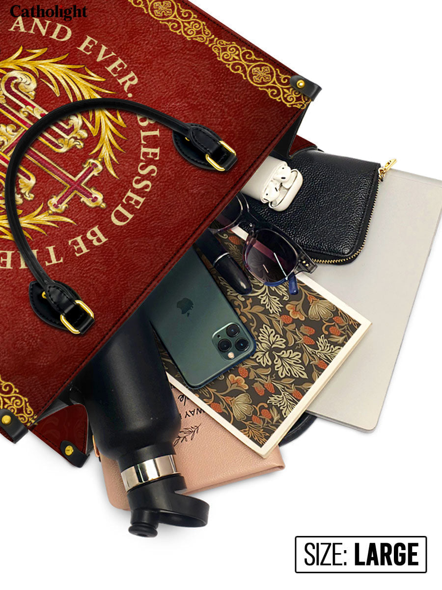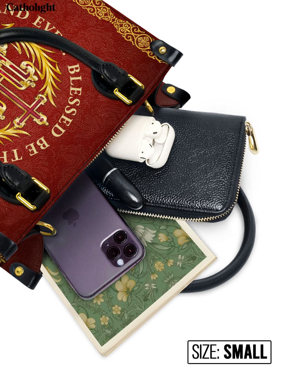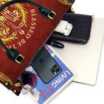 Questa squisita borsa in pelle presenta il sacro monogramma "IHS", che rappresenta il Santo Nome di Gesù, circondato da una radiosa corona dorata e adornato con delicati accenti floreali. La frase edificante “Benedetto sia il Nome di Gesù, nei secoli dei secoli” è elegantemente esposta attorno all'emblema, offrendo un potente promemoria di devozione e rispetto. Lo sfondo di un profondo cremisi, arricchito da intricate decorazioni dorate, crea un design senza tempo che emana fede e grazia.