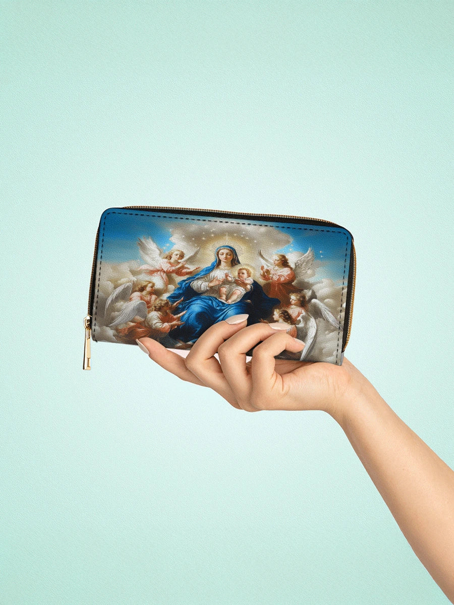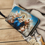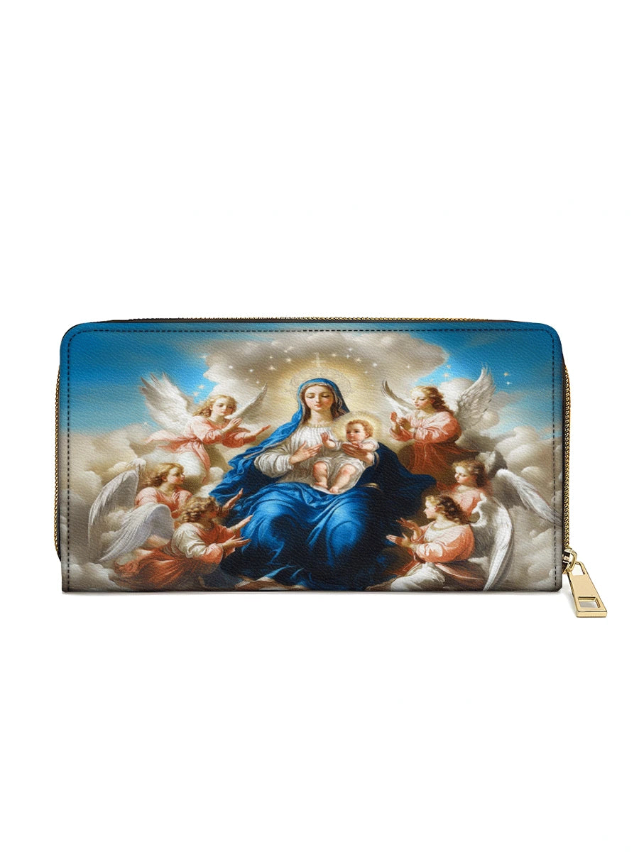 This exquisite Catholight Leather Wallet Purse is a stunning blend of faith and fashion, featuring a beautifully detailed depiction of the Virgin Mary holding baby Jesus, surrounded by adoring angels. With a heavenly glow radiating from the artwork, the Leather Wallet Purse exudes divinity, making it a perfect statement piece for those who cherish their Catholic faith and love elegant, artistic accessories.