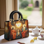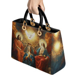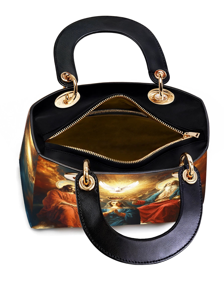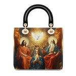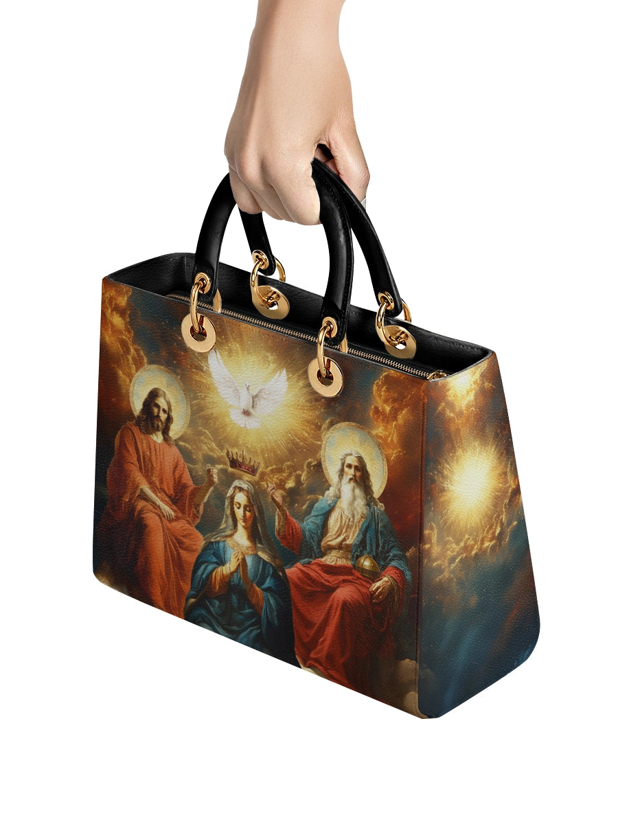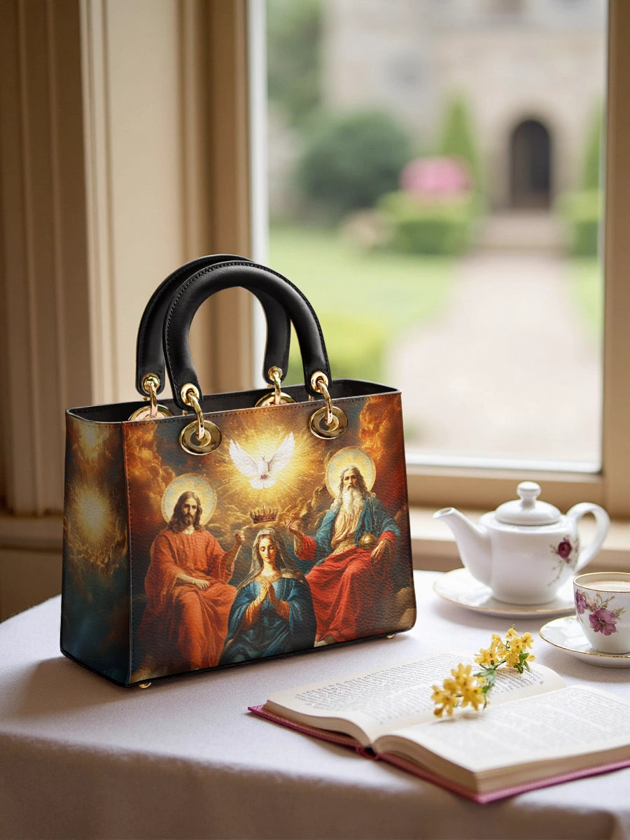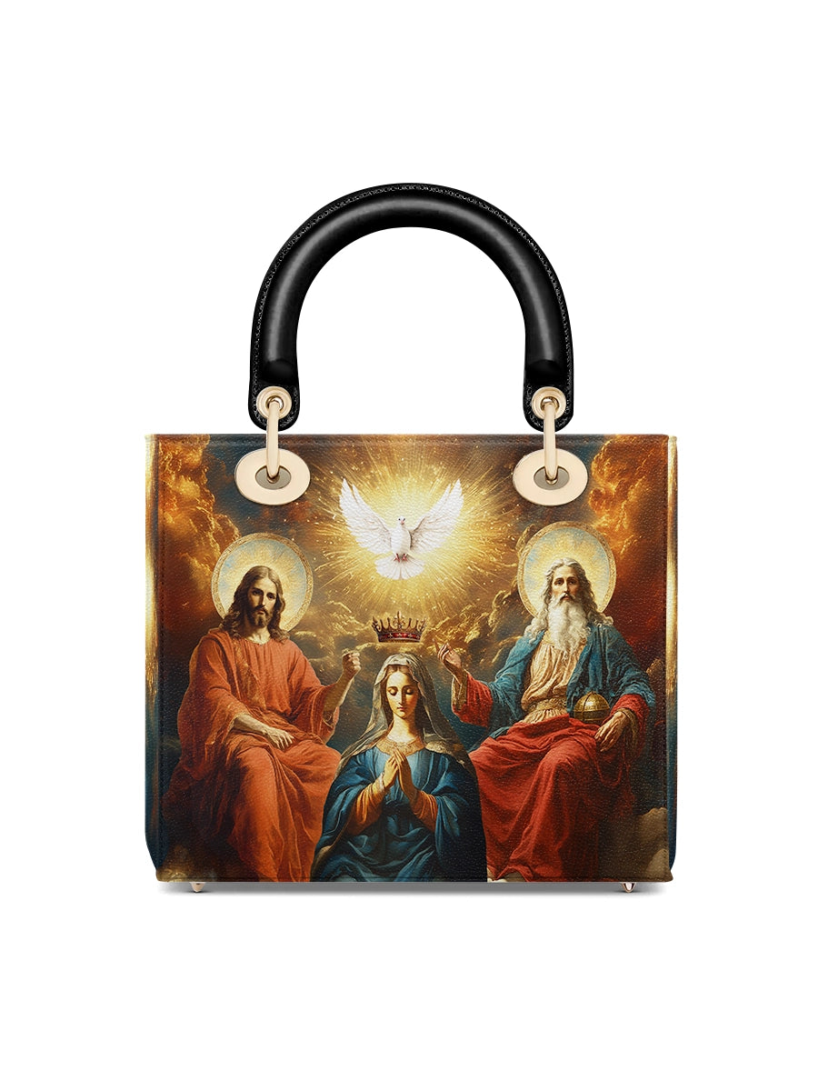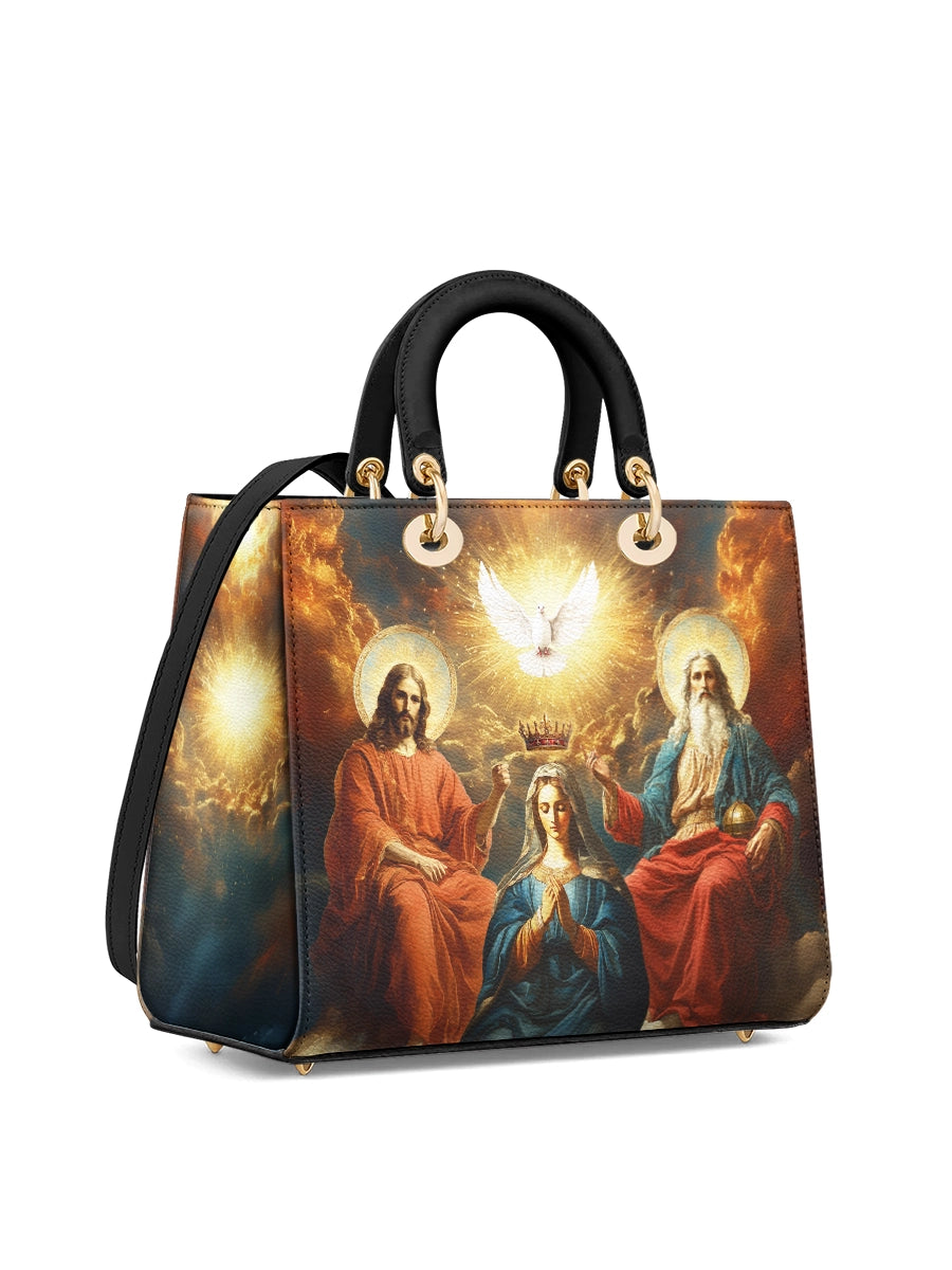 This beautifully crafted bag portrays the Coronation of the Virgin Mary, a scene rich with spiritual symbolism and divine grace. At the center, Mary is depicted in a serene pose, her hands clasped in prayer, as a golden crown is placed upon her head by God the Father and Jesus Christ, representing her exaltation as the Queen of Heaven. The Holy Spirit, symbolized as a radiant dove, hovers above, emanating divine light that fills the composition with warmth and reverence.