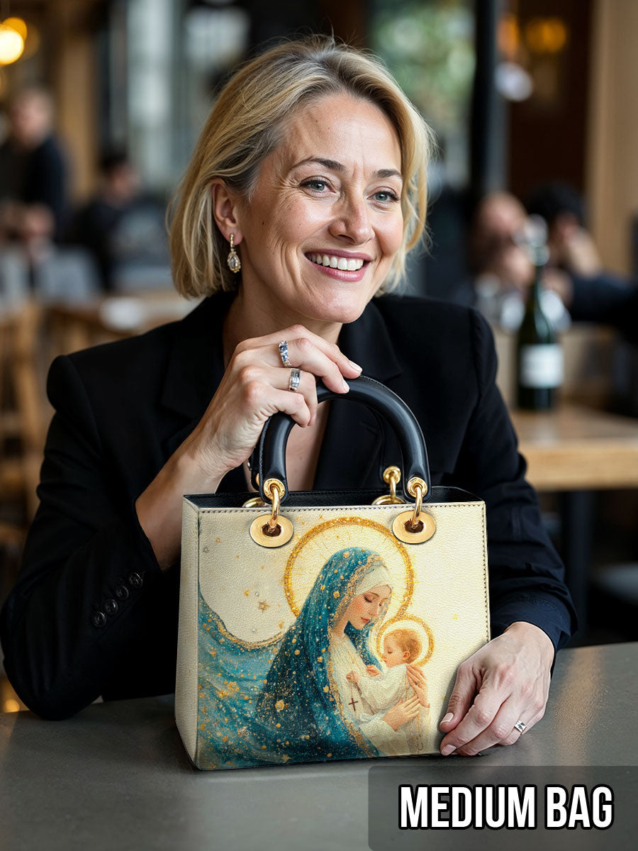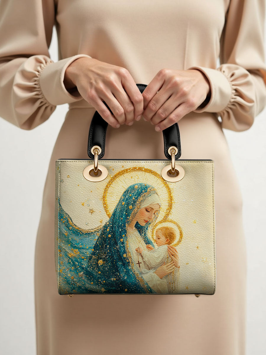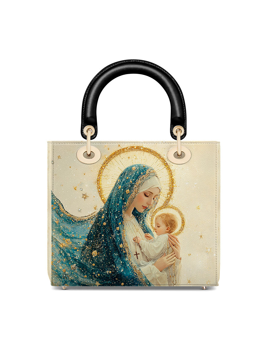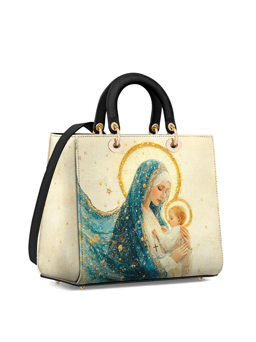 This beautifully crafted lady leather bag features a serene and radiant image of the Blessed Virgin Mary cradling the Christ Child, surrounded by a heavenly aura of gold and deep celestial blue. The delicate stars adorning Mary’s flowing veil and the luminous halos symbolize her divine role as the Mother of God, embodying purity, love, and unwavering faith. The intricate details and rich colors evoke a sense of peace and spiritual connection.