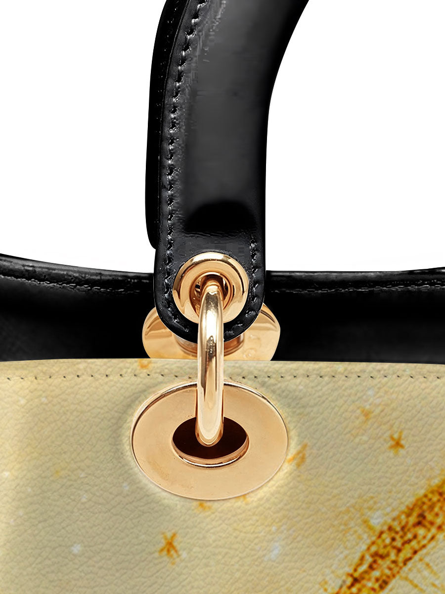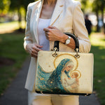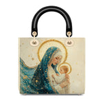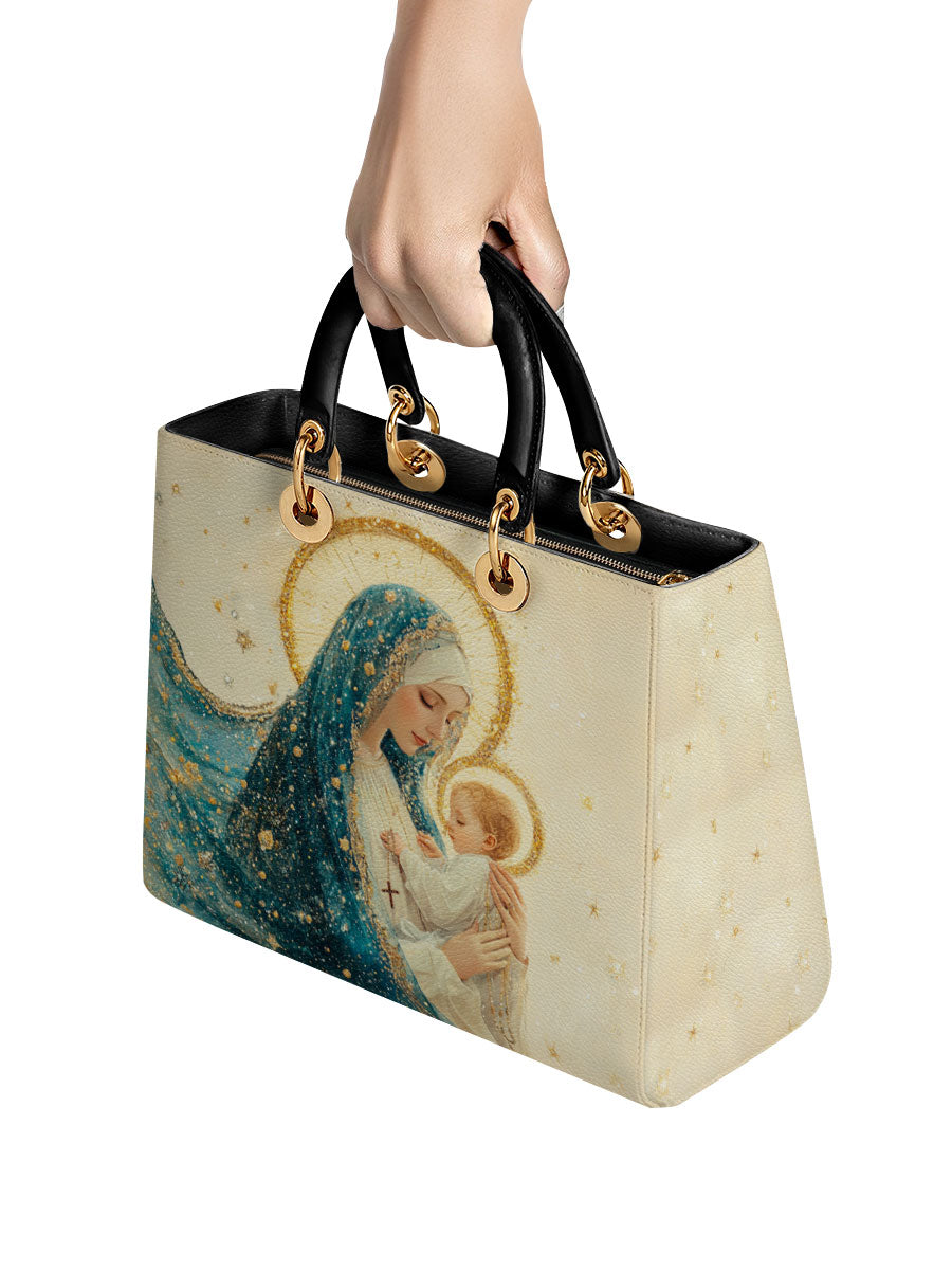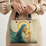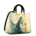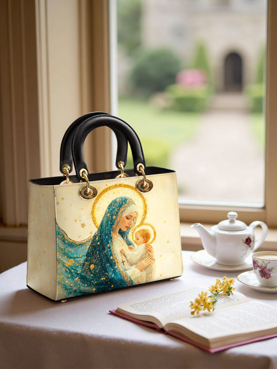 This beautifully crafted lady leather bag features a serene and radiant image of the Blessed Virgin Mary cradling the Christ Child, surrounded by a heavenly aura of gold and deep celestial blue. The delicate stars adorning Mary’s flowing veil and the luminous halos symbolize her divine role as the Mother of God, embodying purity, love, and unwavering faith. The intricate details and rich colors evoke a sense of peace and spiritual connection.