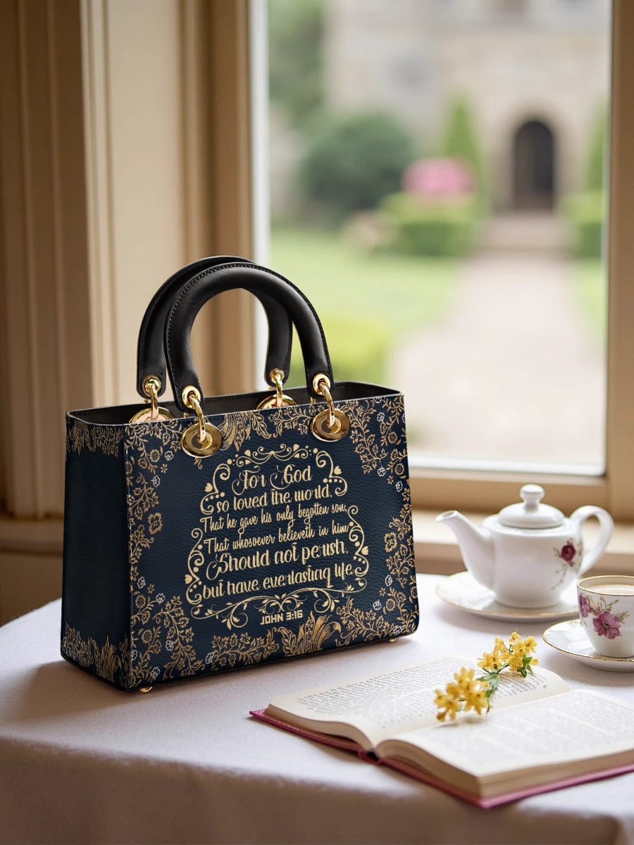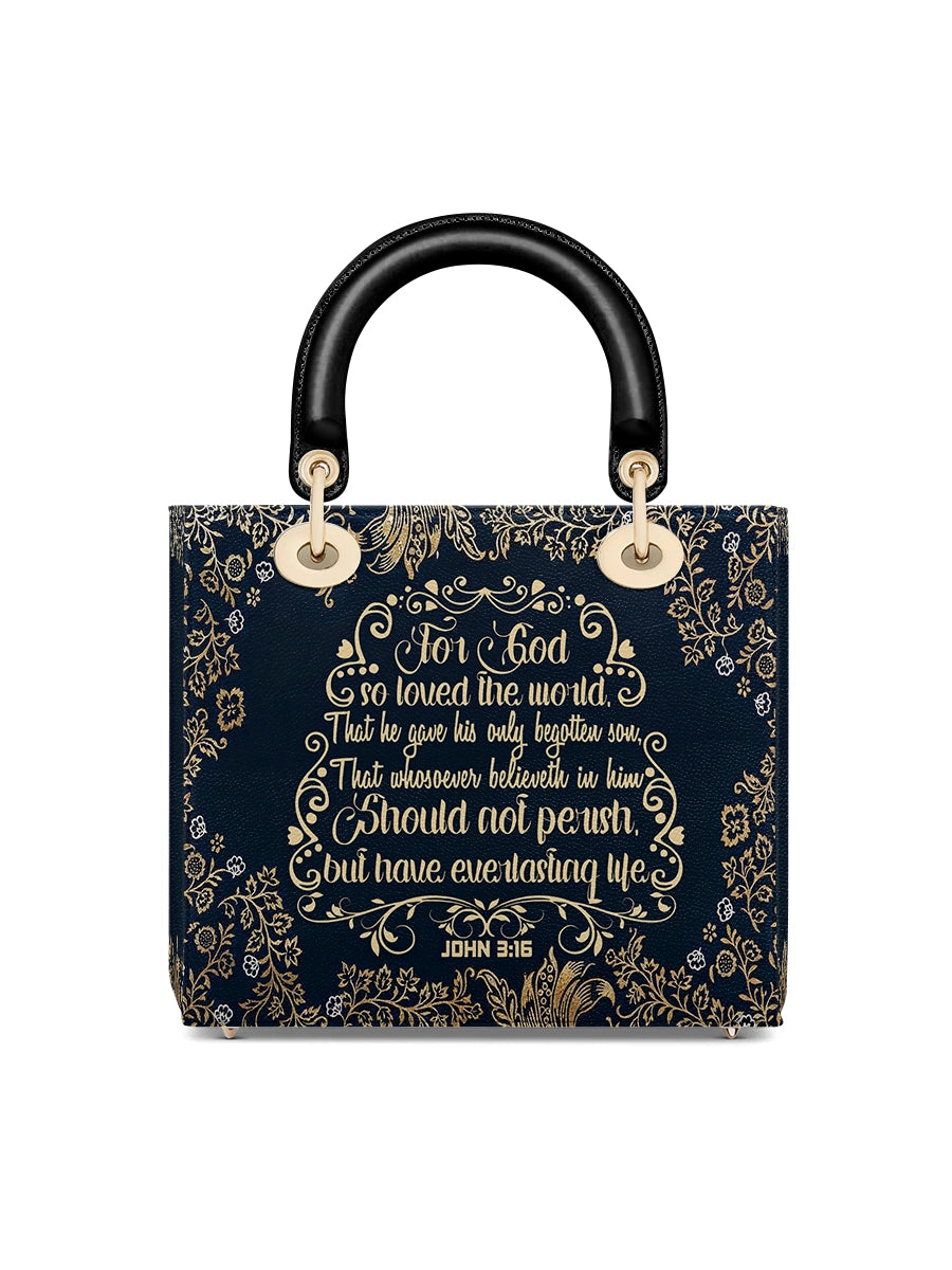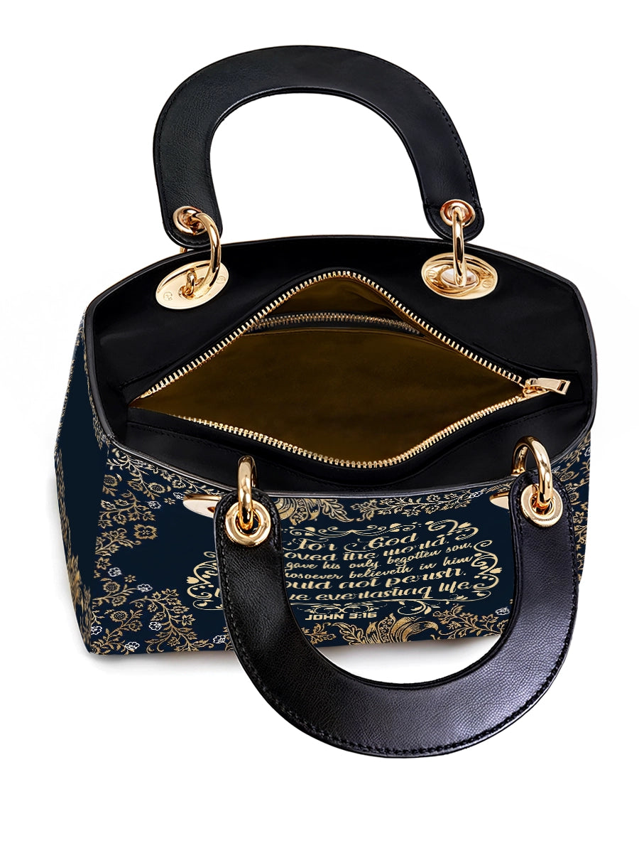 This elegant leatherbag features a profound and timeless display of the scripture from John 3:16, beautifully rendered in golden lettering against a deep navy background. The verse, "For God so loved the world, that He gave His only begotten Son, that whosoever believeth in Him should not perish, but have everlasting life," is framed with ornate floral and scrollwork patterns, evoking a sense of divine beauty and reverence.