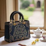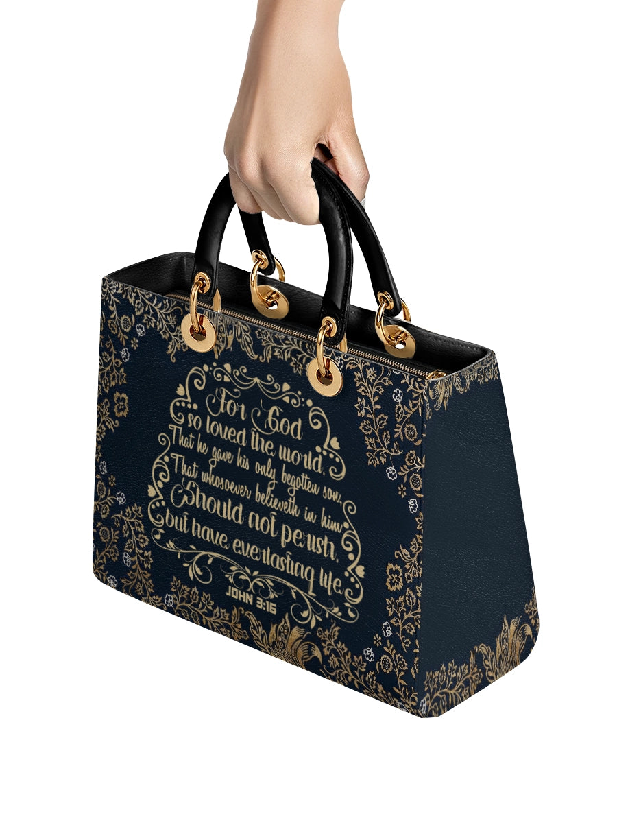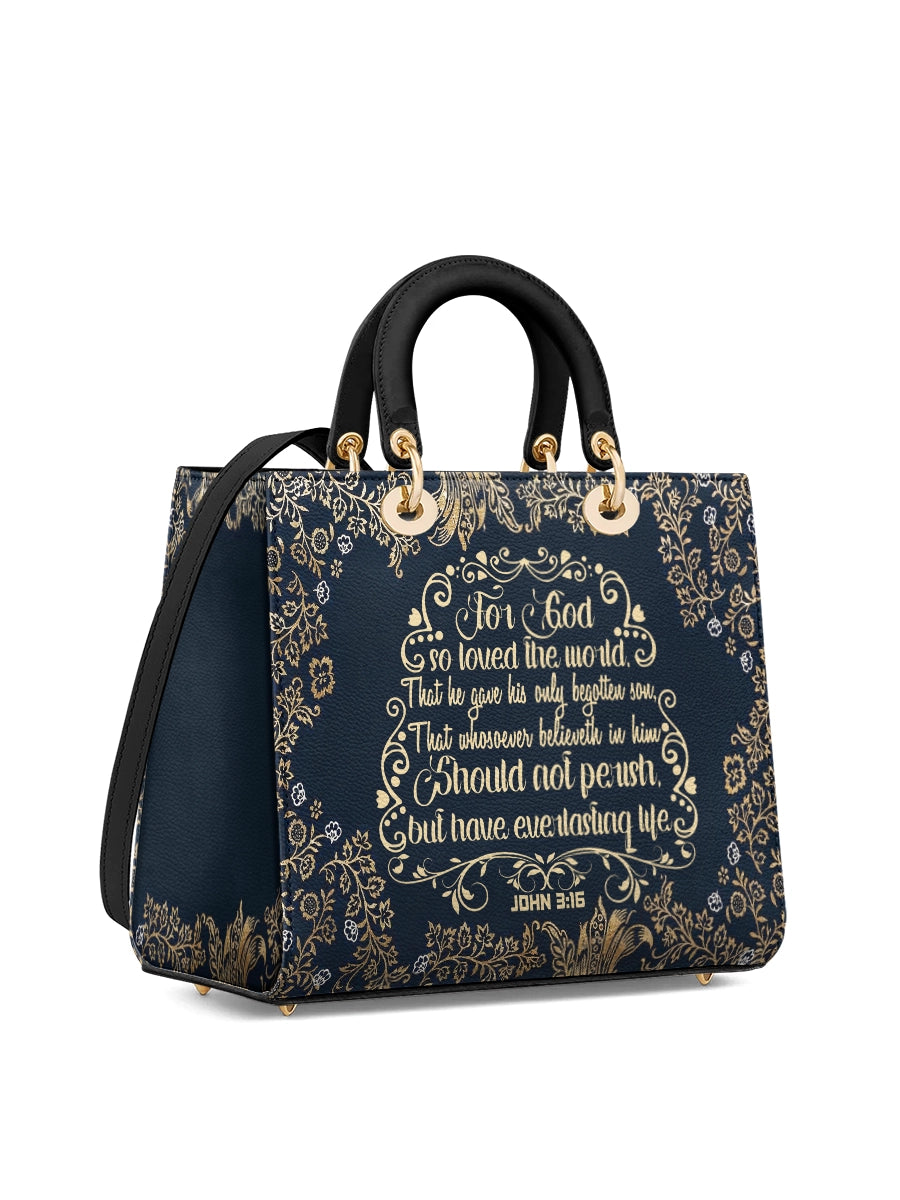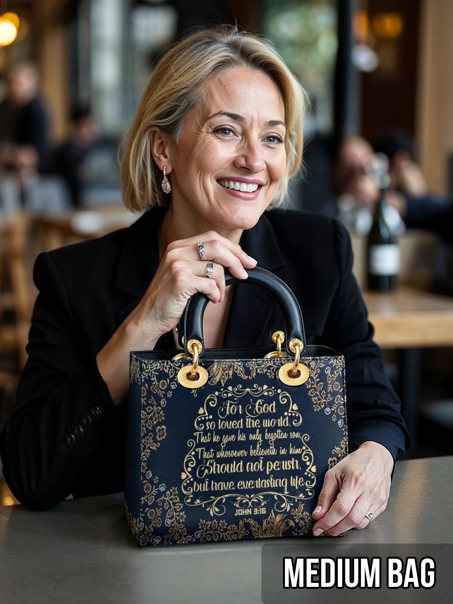 This elegant leatherbag features a profound and timeless display of the scripture from John 3:16, beautifully rendered in golden lettering against a deep navy background. The verse, "For God so loved the world, that He gave His only begotten Son, that whosoever believeth in Him should not perish, but have everlasting life," is framed with ornate floral and scrollwork patterns, evoking a sense of divine beauty and reverence.