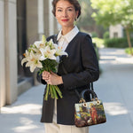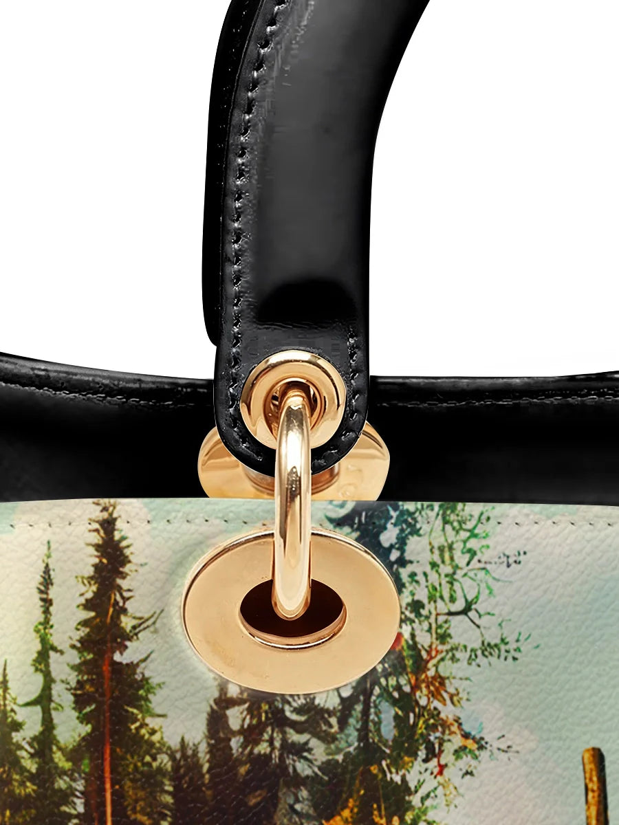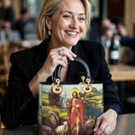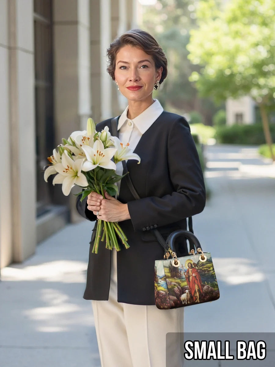 The "Saint John the Baptist Shepherd" leather bag features a breathtaking depiction of Saint John the Baptist, the herald of Christ, walking through a serene countryside with a lamb by his side. Clothed in a flowing robe, he carries a staff adorned with a cross, symbolizing his role as the forerunner of the Messiah. The vibrant scenery, complete with lush greenery and tranquil waters, enhances the sense of peace and divine purpose reflected in this artwork.