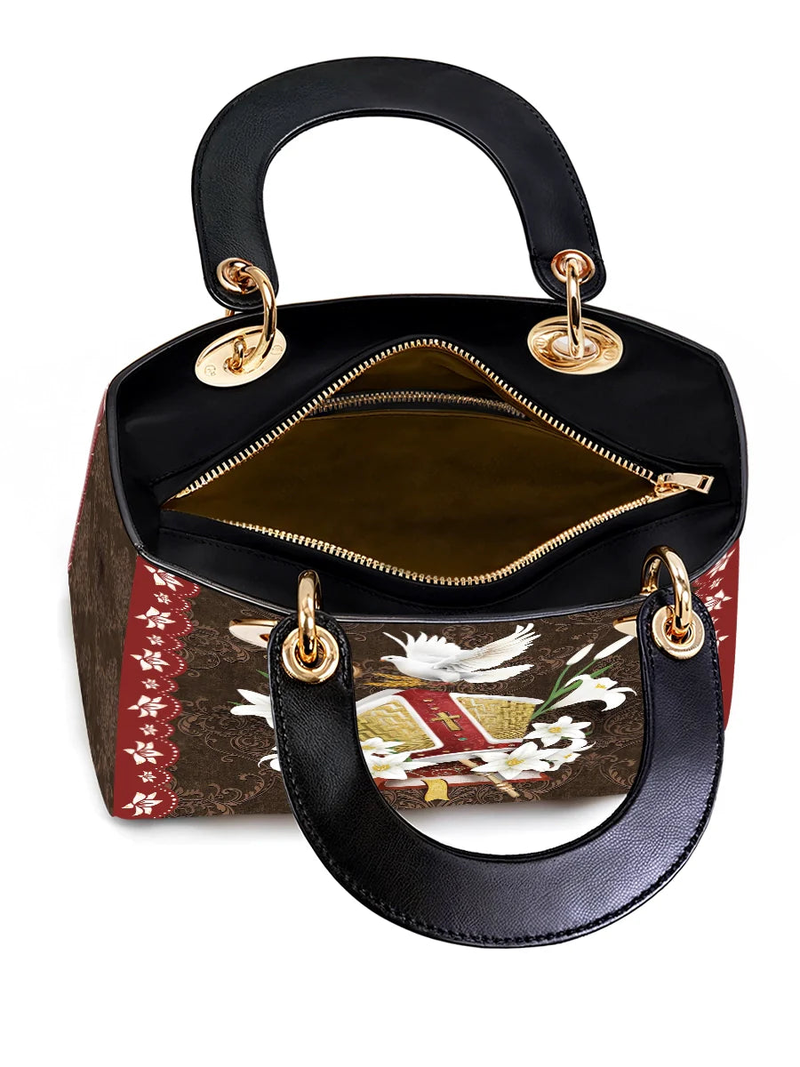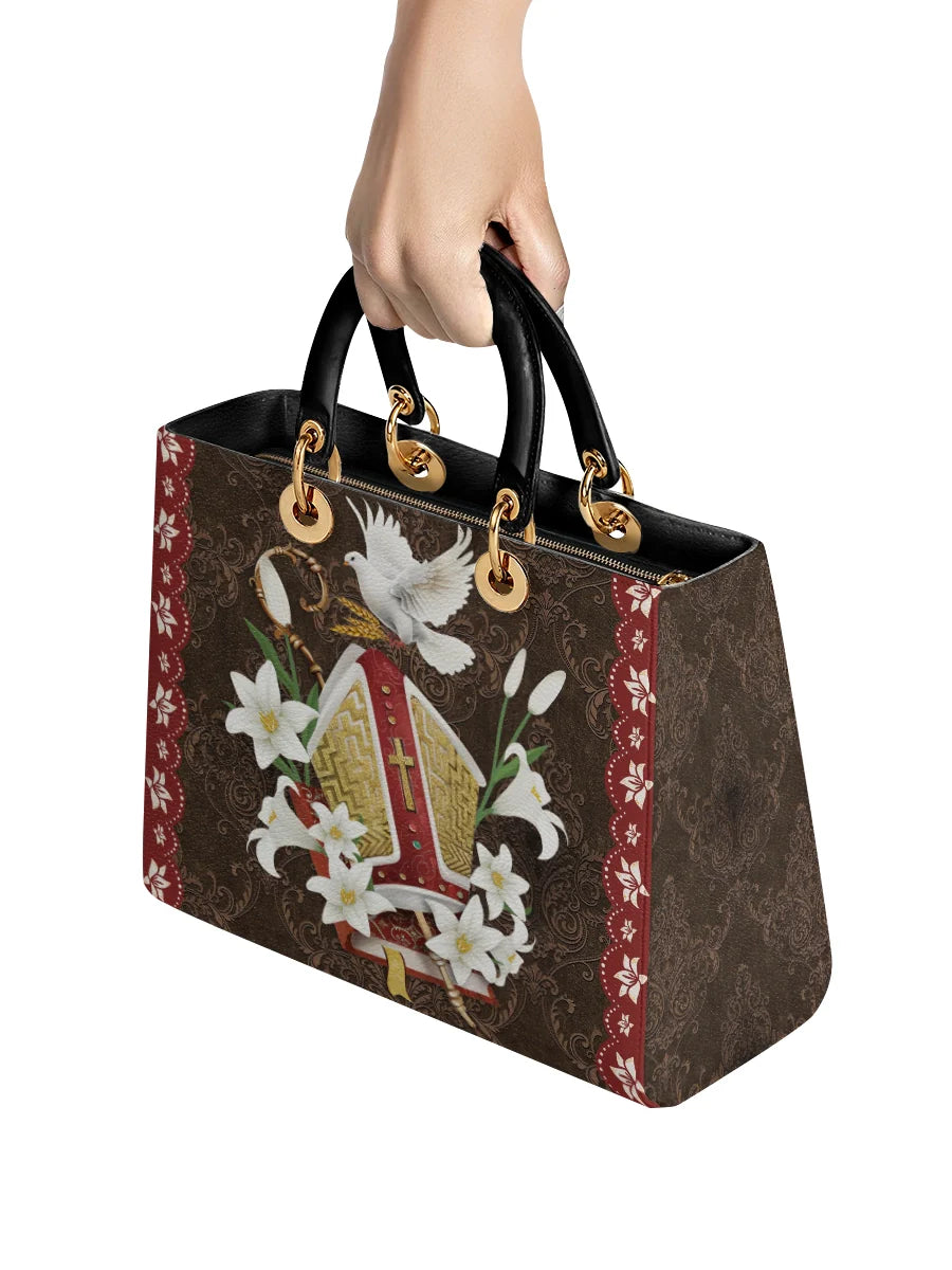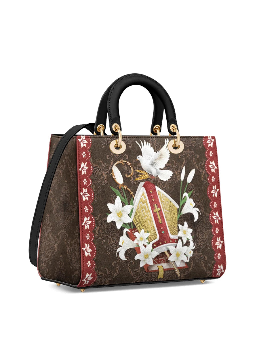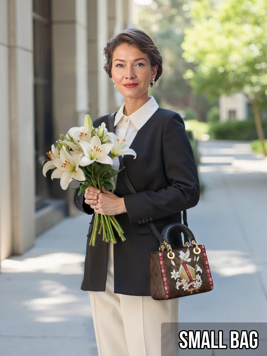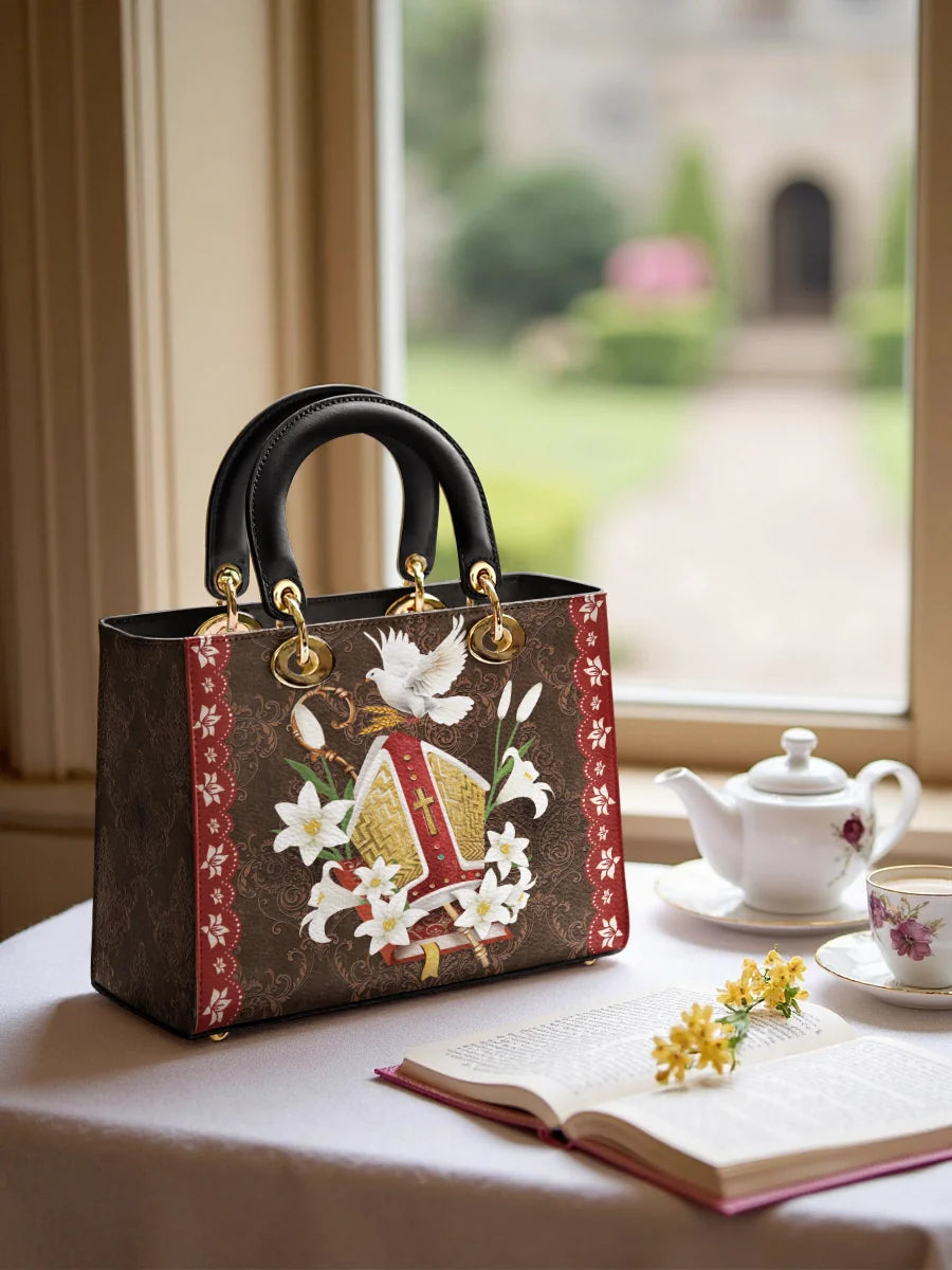 This leather bag showcases an elegant and symbolic design, featuring a beautifully detailed bishop's mitre surrounded by blooming white lilies, signifying purity and divine devotion. A radiant dove, representing the Holy Spirit, gracefully rests above the mitre, symbolizing peace, guidance, and spiritual blessings. The intricate golden embroidery and ornate red accents evoke a sense of reverence and majesty, making this bag a stunning tribute to the sacred traditions of faith.