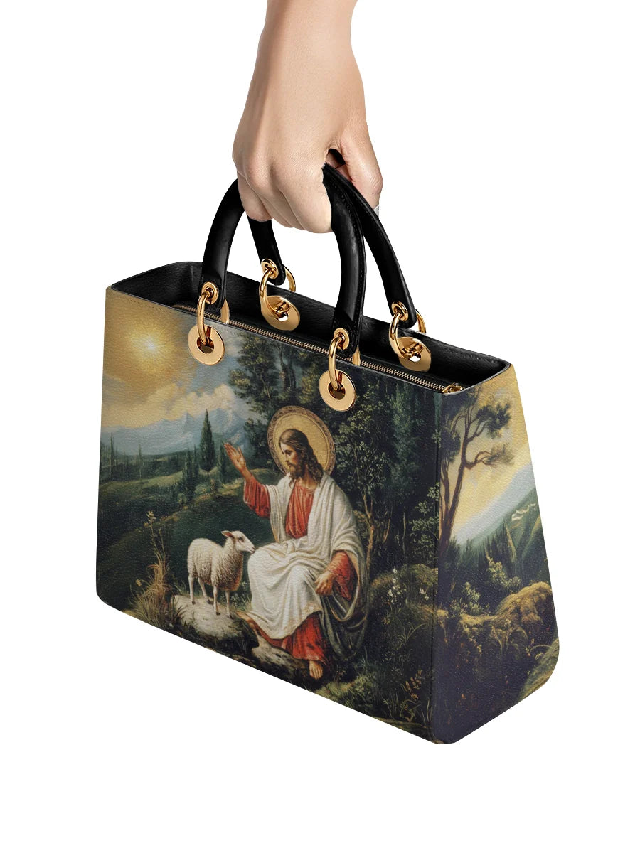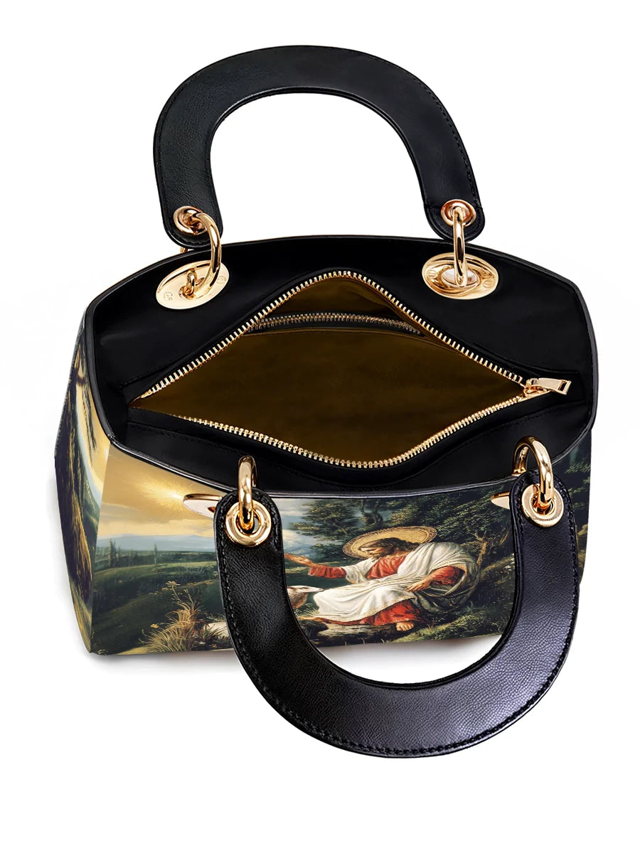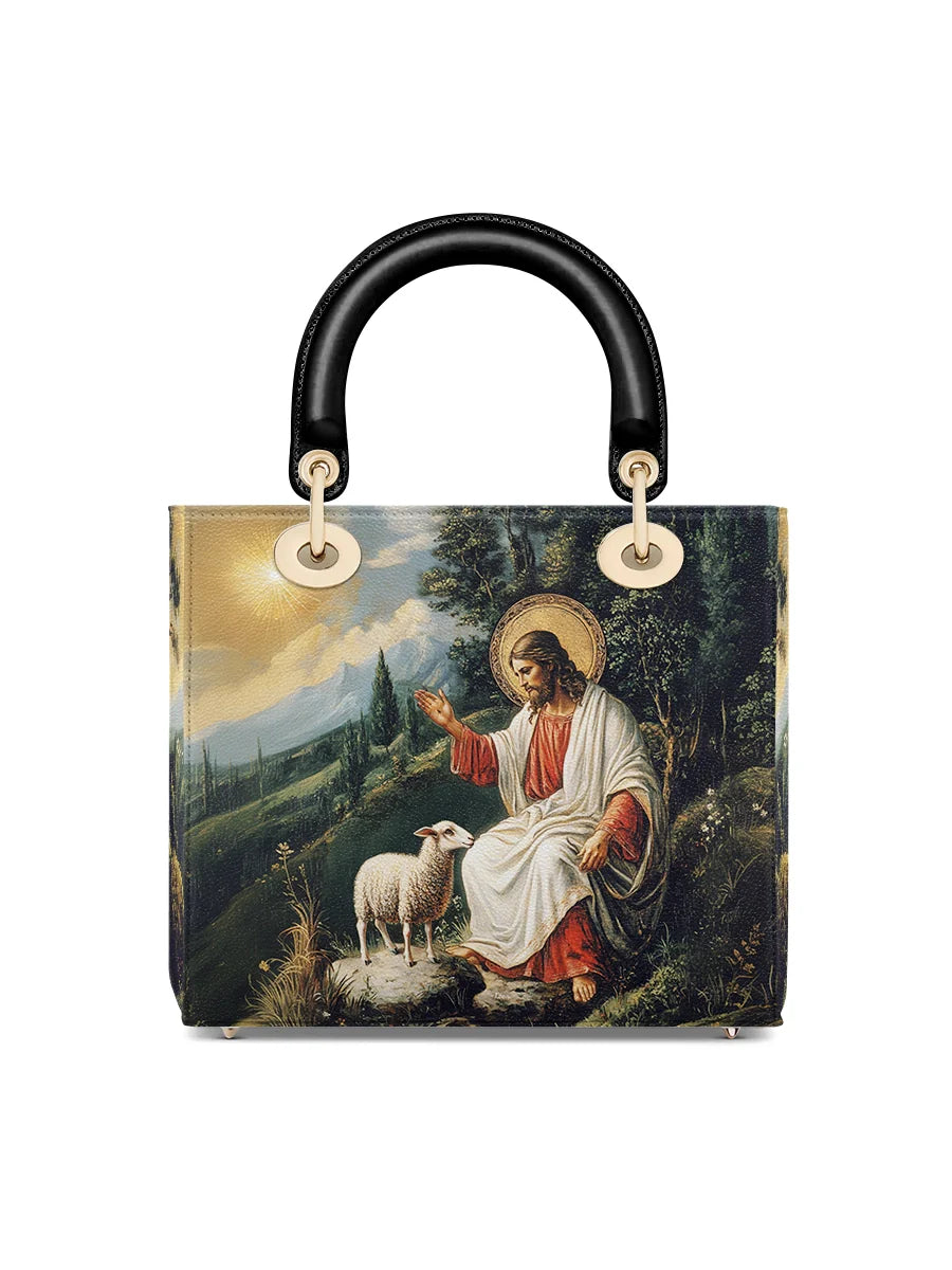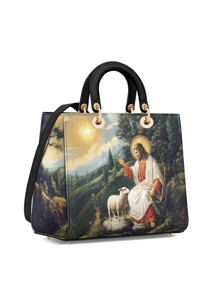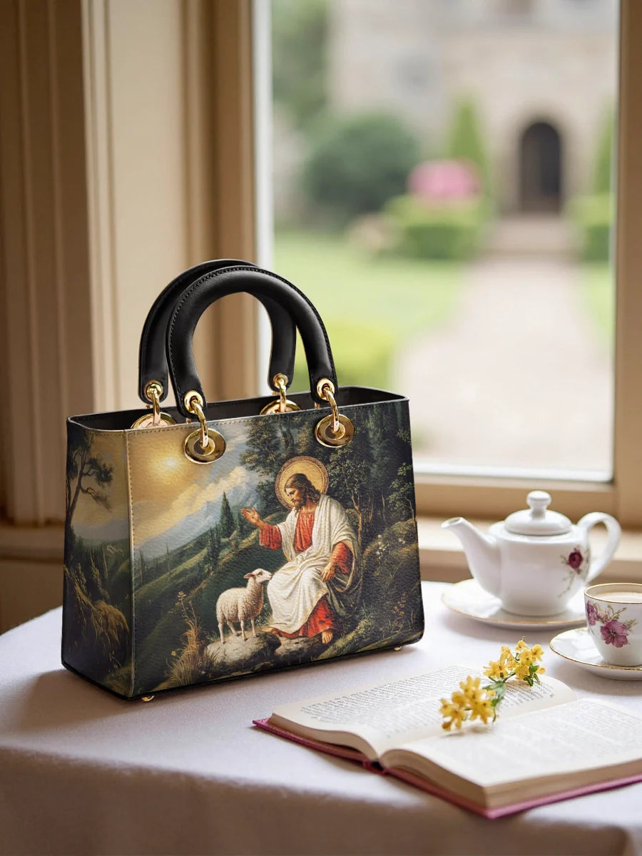 This exquisite leather bag showcases a serene depiction of Jesus as the Good Shepherd, tenderly watching over a lamb in a tranquil countryside setting. The radiant sunlight and lush landscape symbolize guidance, protection, and divine care. The intricate details of the artwork, from the soft folds of His robe to the gentle expression on the lamb, evoke a profound sense of peace, love, and faith.