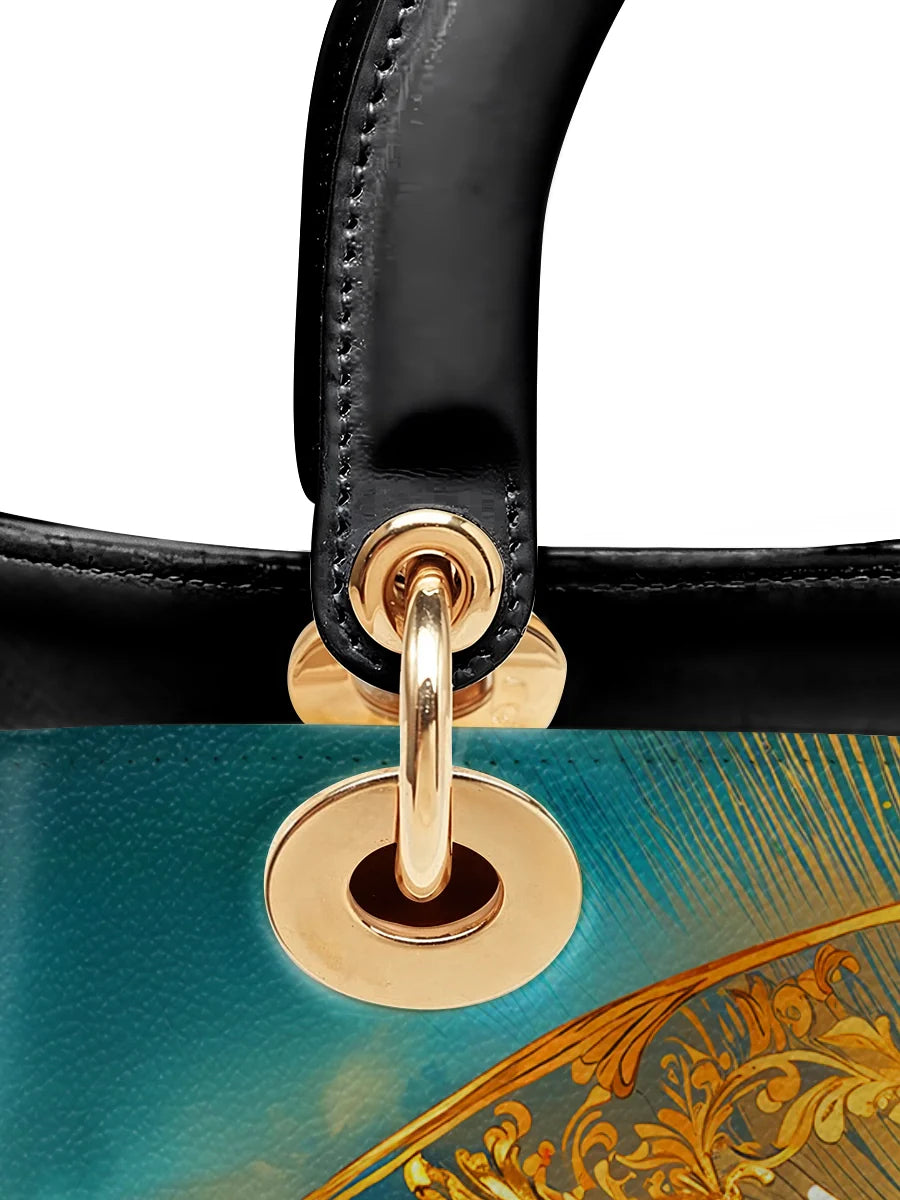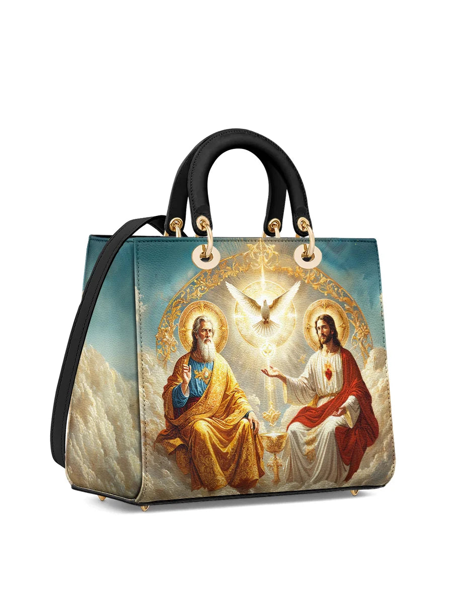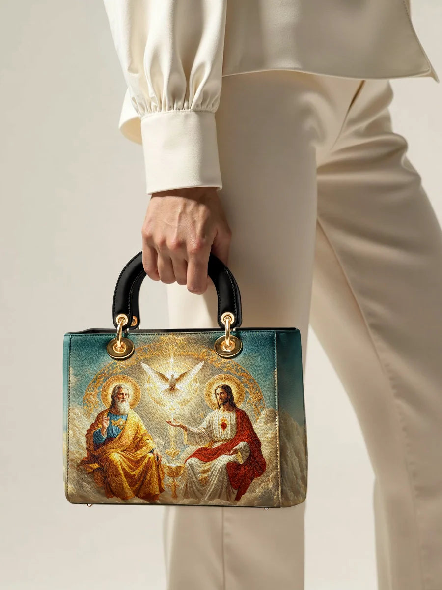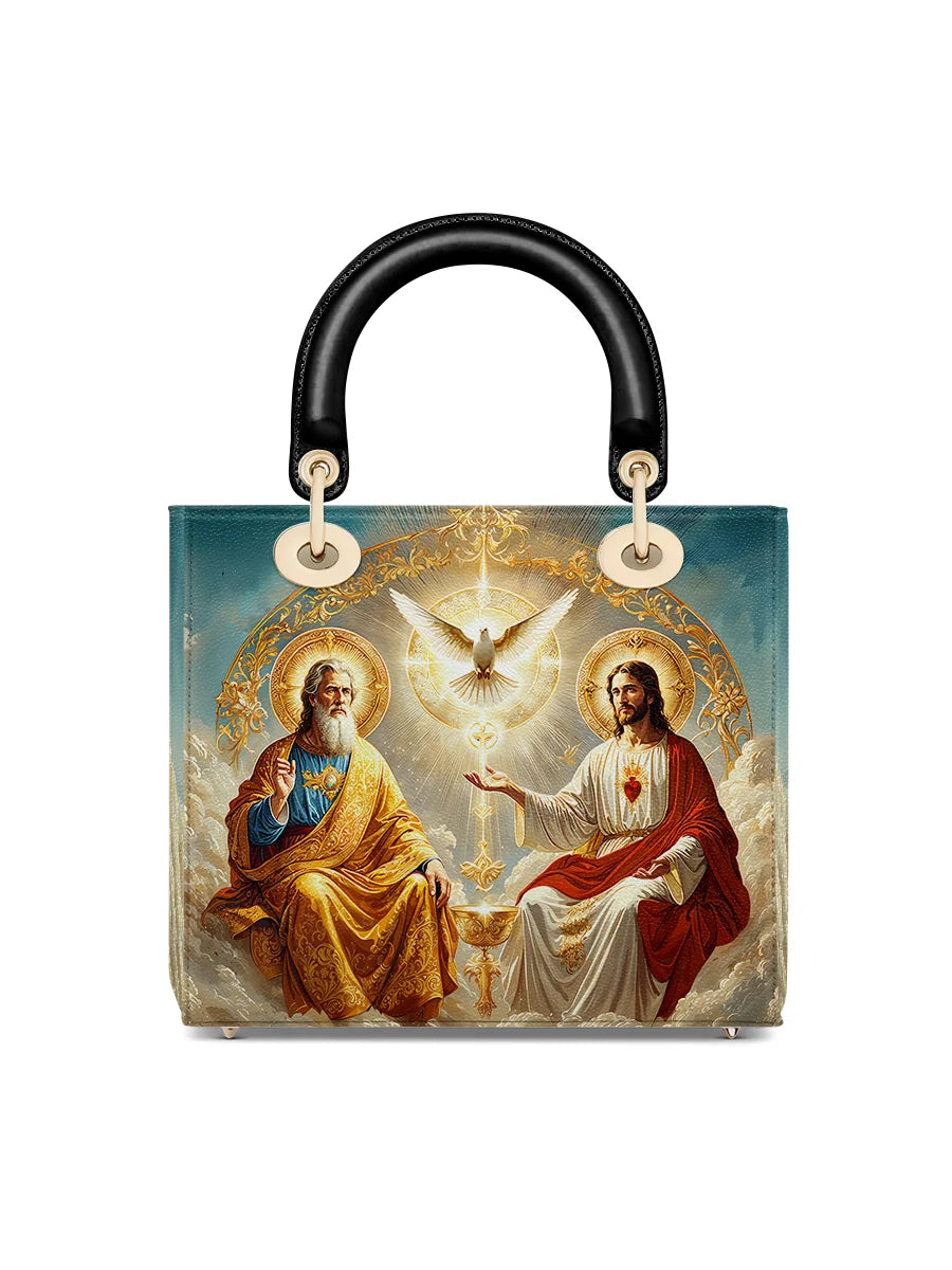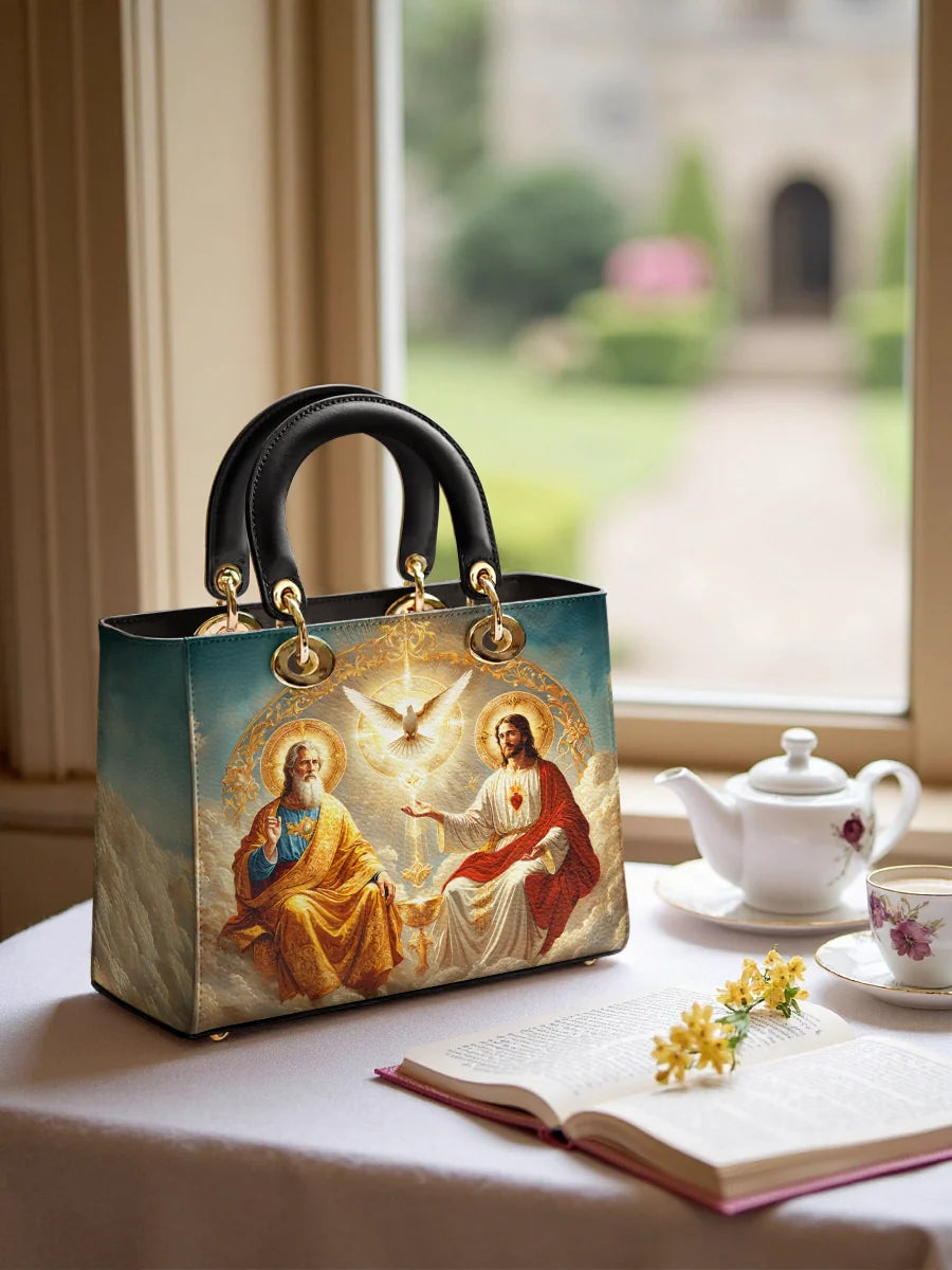 This exquisitely designed leather bag captures the profound essence of the Holy Trinity, blending artistic mastery with deep spiritual meaning. At the center, the Holy Spirit is depicted as a radiant dove, surrounded by divine light, representing peace, guidance, and sanctity. Below, God the Father, in majestic golden robes, embodies wisdom and eternal love, while Christ the Son, adorned in red and white, signifies sacrifice, salvation, and divine mercy.