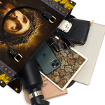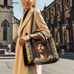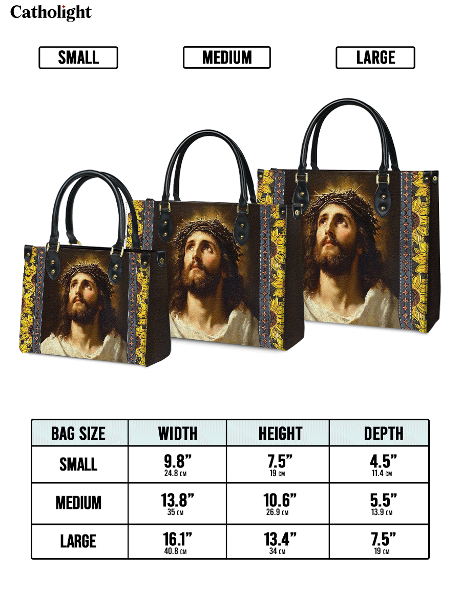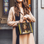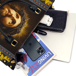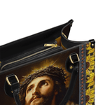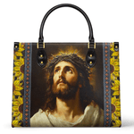 Questa eccezionale borsa in pelle presenta un'affascinante rappresentazione di Gesù Cristo che indossa la Corona di Spine, con lo sguardo rivolto verso l'alto in profonda devozione e forza spirituale. L'opera è immersa in una luce divina e soffusa, simboleggiando redenzione, speranza e fede incrollabile in mezzo alle prove. L'immagine centrale evoca una profonda risonanza emotiva, attirando lo spettatore nella sua narrativa sacra.